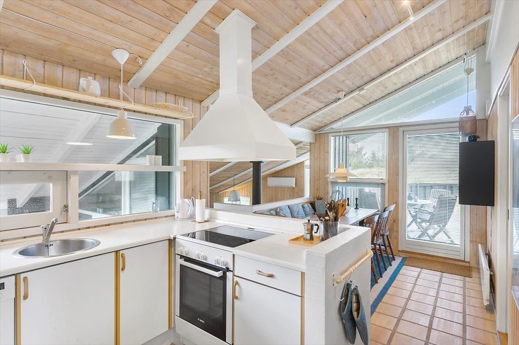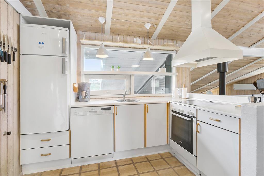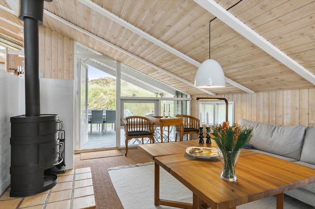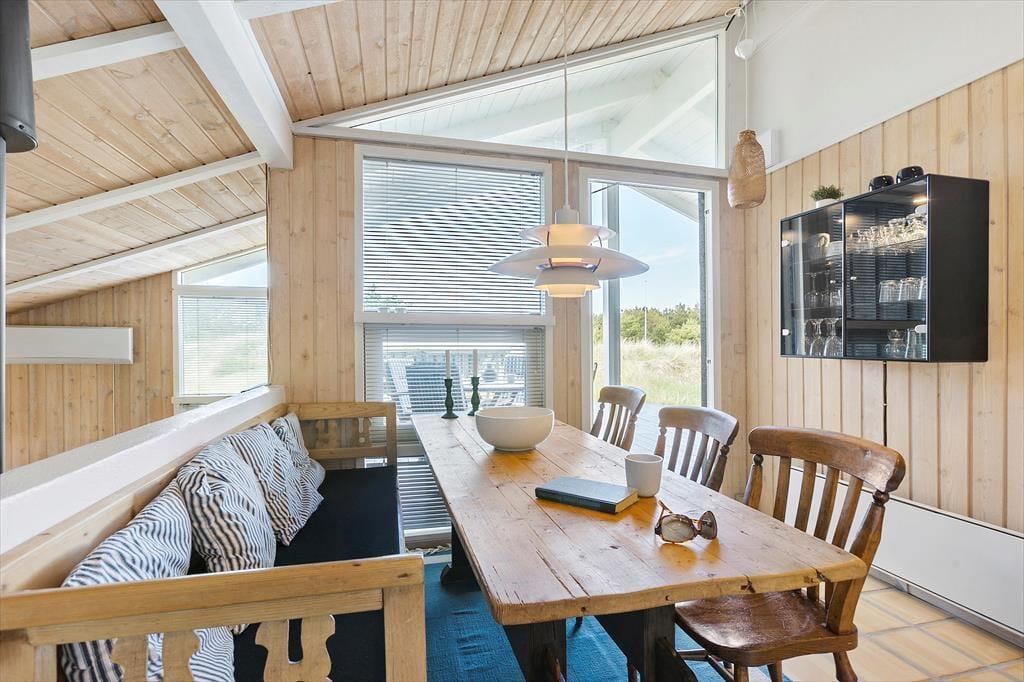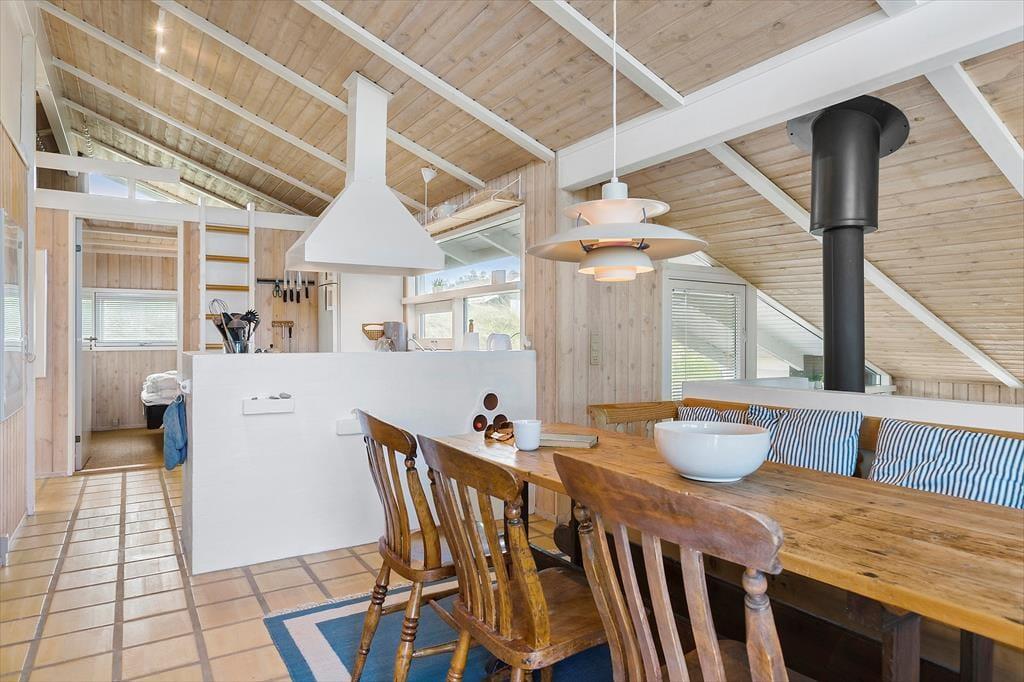Det 76 m2 store sommerhus fremstår pænt og velholdt både ude og inde. Møblementet er primært holdt i lyse farvetoner, der går godt i spænd med rummenes umalede trævægge, og med loft til kip og udsigt til naturomgivelserne er der en rigtig dejlig atmosfære overalt. I forlængelse af køkkenet har I en spiseplads med slagbænk – det er ikke blot et dejligt sted at nyde dagens måltider, men også at tegne med børnene, spille brætspil eller hyggesnakke over et godt glas vin. I åben forbindelse, men et par trin forskudt, ligger stuen, hvor I kan slappe af i sofaen med ild i brændeovnen og en god film på fladskærmen, der har Chromecast tilsluttet. Husets tre soveværelser har alle gode senge og garderobeskabe, og på badeværelset står en vaskemaskine, så I kan få rene håndklæder og badetøj i løbet af ferien.