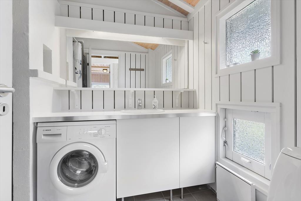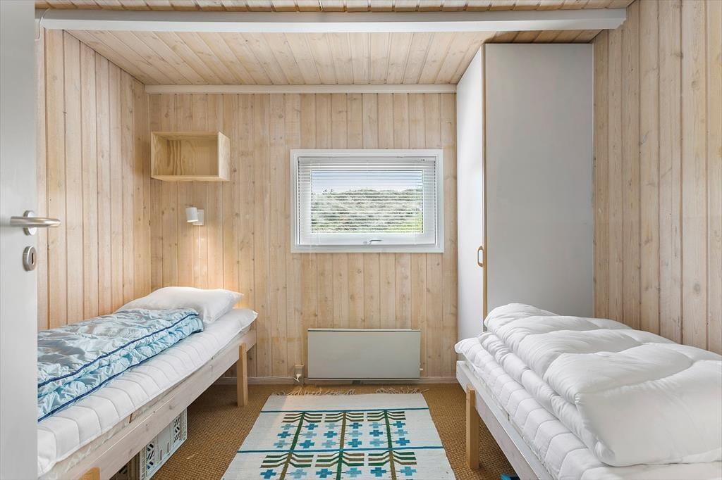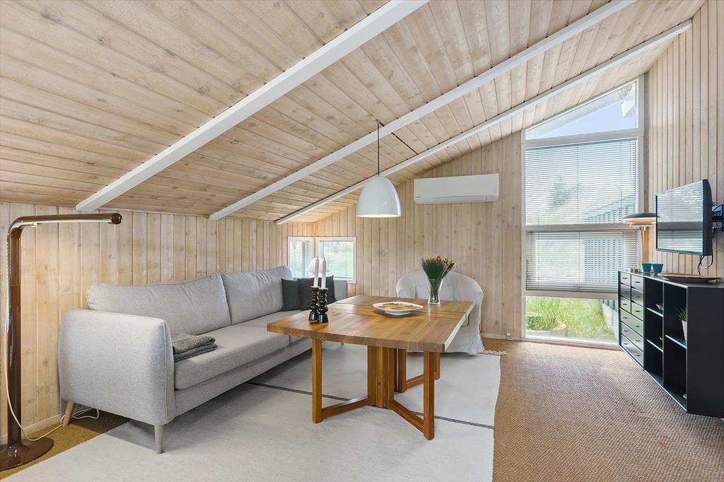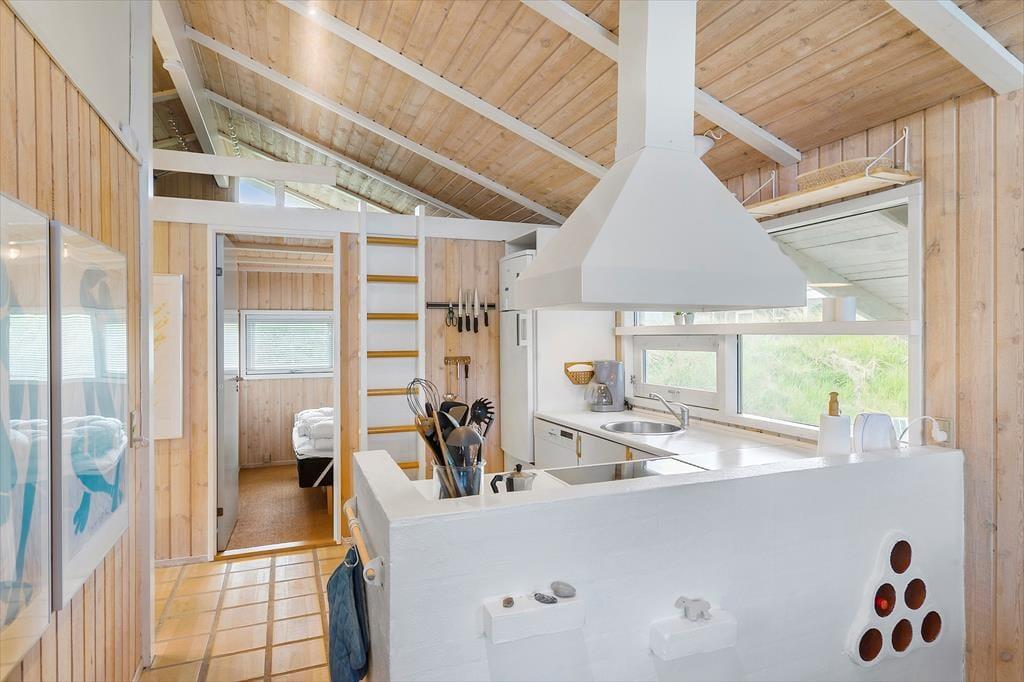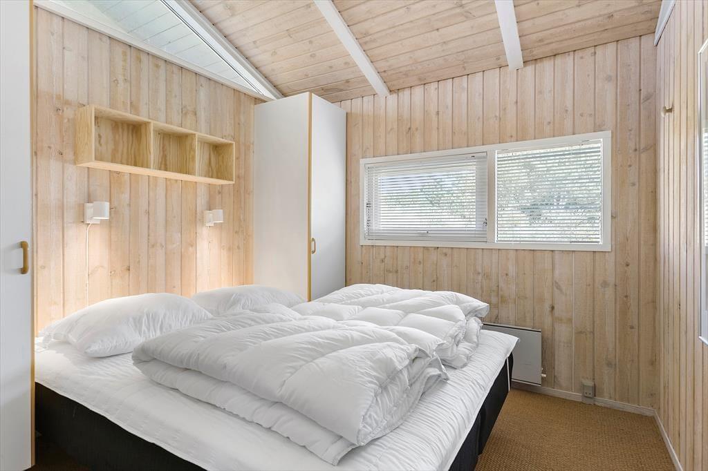 Det 76 m2 store sommerhus fremstår pænt og velholdt både ude og inde. Møblementet er primært holdt i lyse farvetoner, der går godt i spænd med rummenes umalede trævægge, og med loft til kip og udsigt til naturomgivelserne er der en rigtig dejlig atmosfære overalt. I forlængelse af køkkenet har I en spiseplads med slagbænk – det er ikke blot et dejligt sted at nyde dagens måltider, men også at tegne med børnene, spille brætspil eller hyggesnakke over et godt glas vin. I åben forbindelse, men et par trin forskudt, ligger stuen, hvor I kan slappe af i sofaen med ild i brændeovnen og en god film på fladskærmen, der har Chromecast tilsluttet. Husets tre soveværelser har alle gode senge og garderobeskabe, og på badeværelset står en vaskemaskine, så I kan få rene håndklæder og badetøj i løbet af ferien.