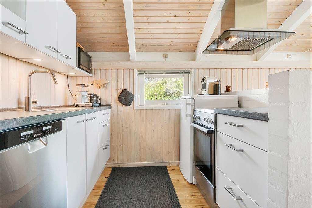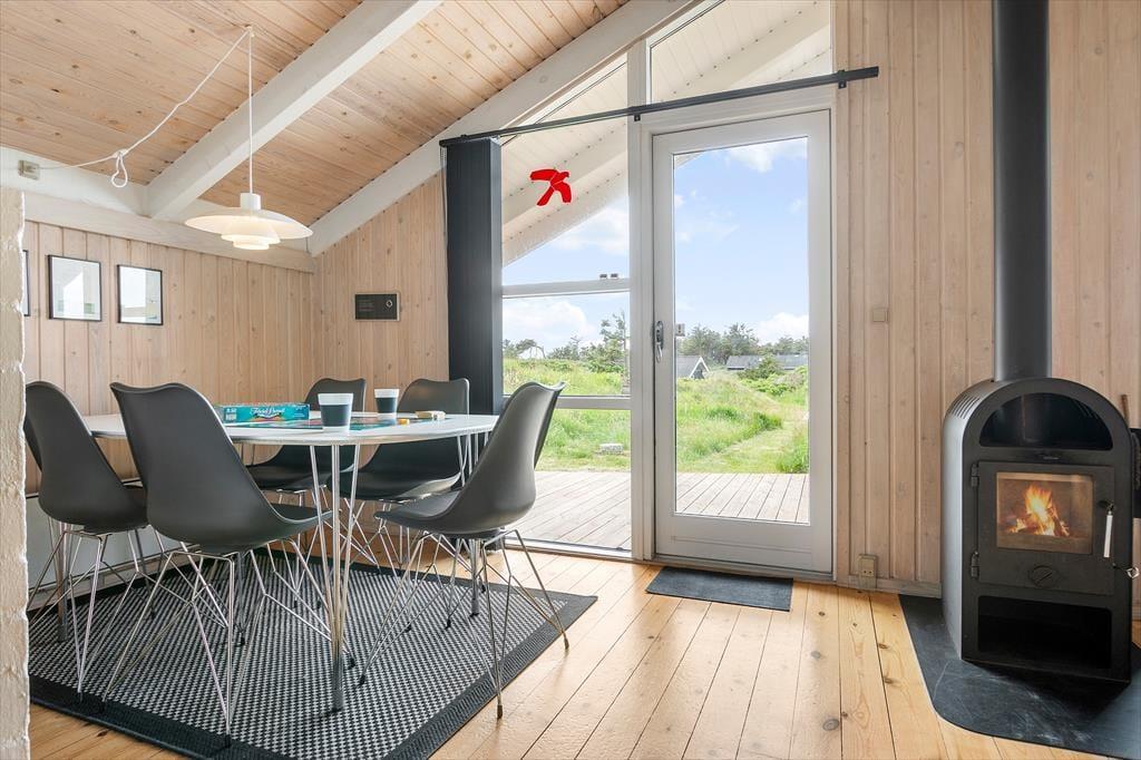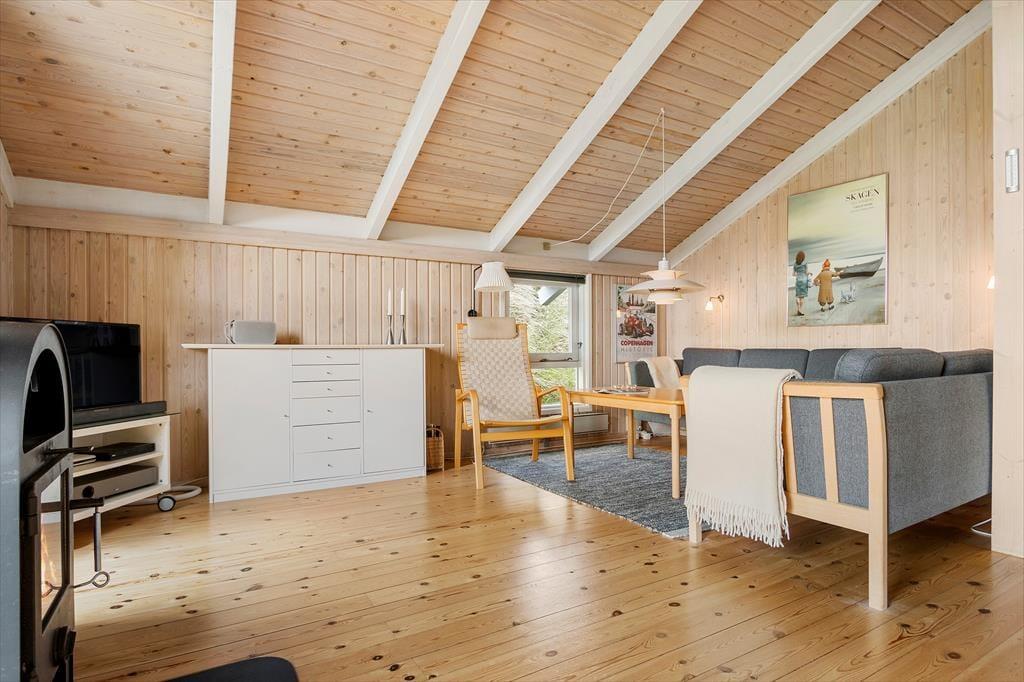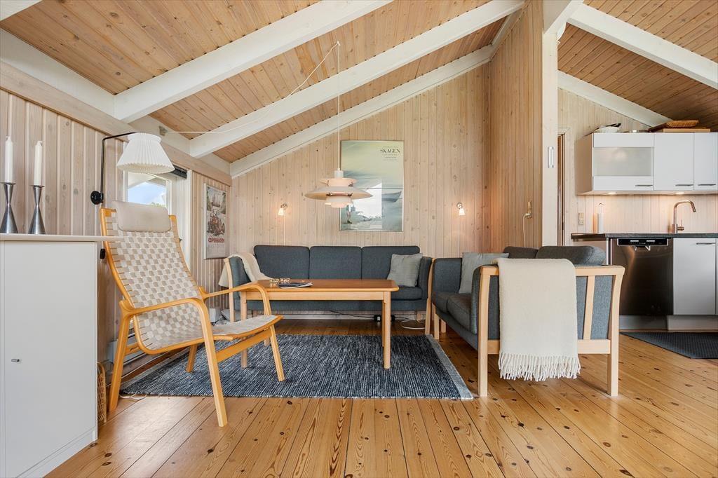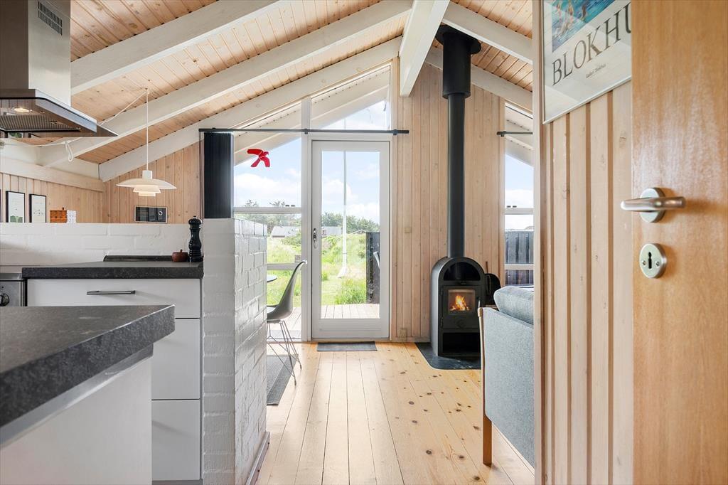 Som du træder ind i sommerhuset, mødes du af en hyggelig og indbydende atmosfære. Den store stue med højt til loftet og brændeovnen i hjørnet skaber en perfekt ramme for afslapning og hygge. Her er masser af plads til hele familien, og de bløde møbler indbyder til lange stunder med brætspil, film eller bare snak. Den åbne planløsning mellem stuen og køkkenet gør det nemt at være sammen, selv når der laves mad. Fra stuen har du også direkte adgang til de dejlige terrasser, hvor du kan nyde solen og udsigten.