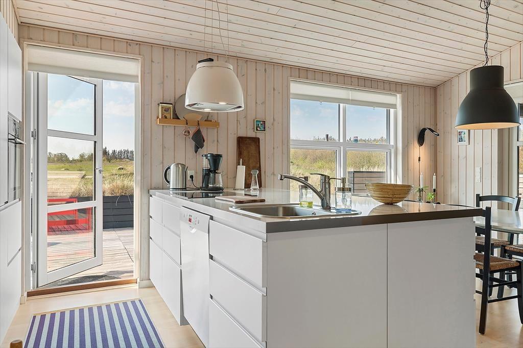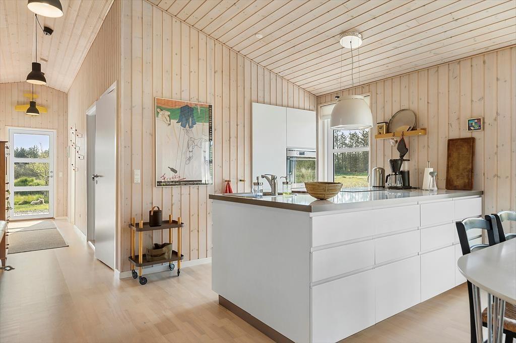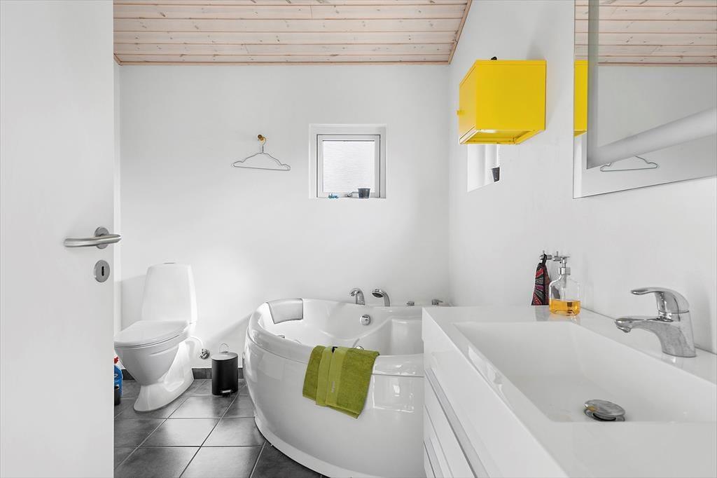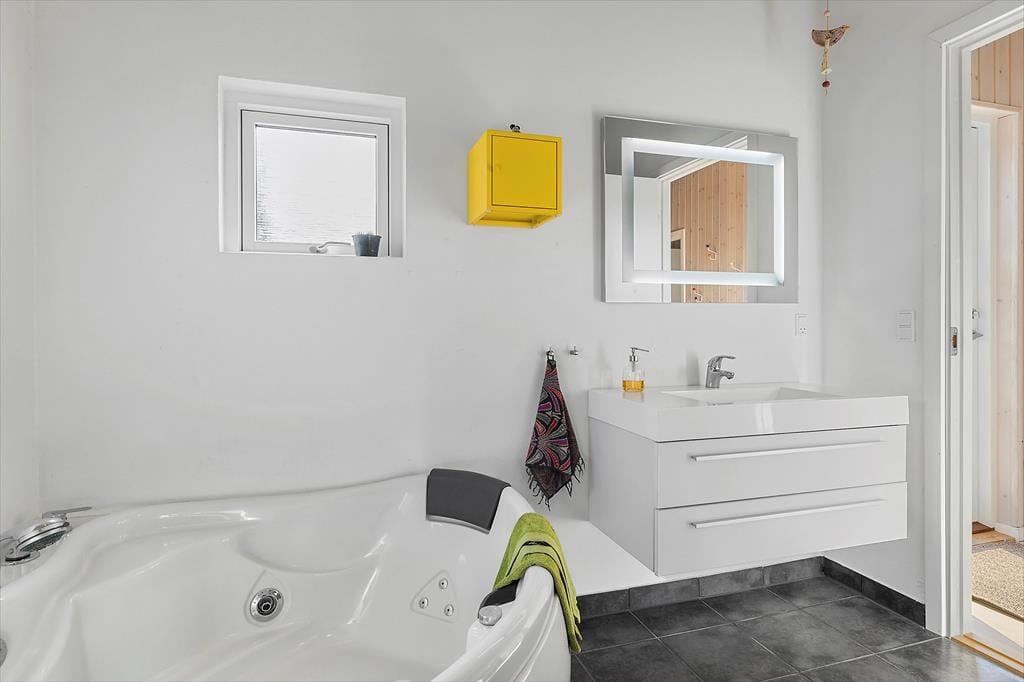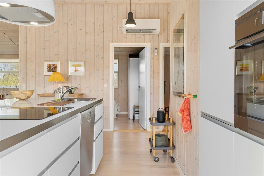 Indenfor møder du et åbent og indbydende opholdsrum med smukt lysindfald fra de store vinduer. Køkkenet er flot og moderne, og det åbne alrum gør det perfekt til at samles med familien. Brændeovnen giver en hyggelig atmosfære, og her er virkelig mulighed for at slappe af og nyde varmen fra ilden. Sommerhuset byder desuden på et lækkert badeværelse med spabad, hvor du kan forkæle dig selv med et afslappende karbad efter en aktiv dag. Huset er rummeligt, og du vil hurtigt føle dig hjemme, uanset om du planlægger at tilbringe din ferie i huset eller ude i naturen.