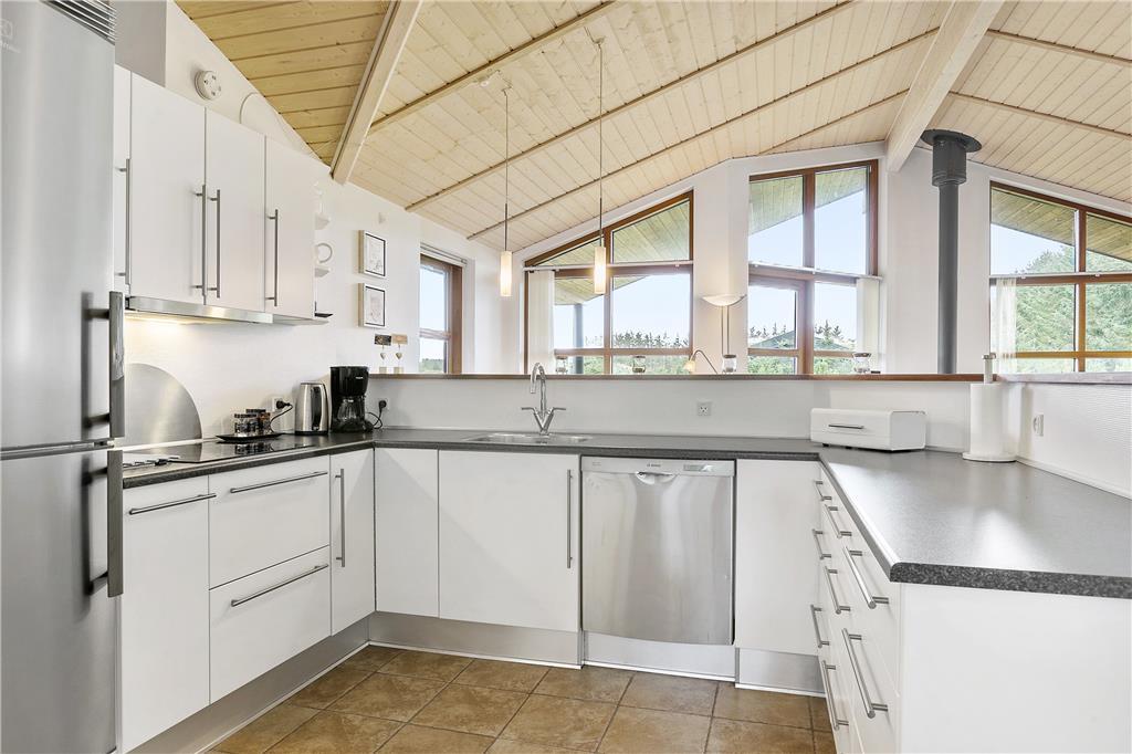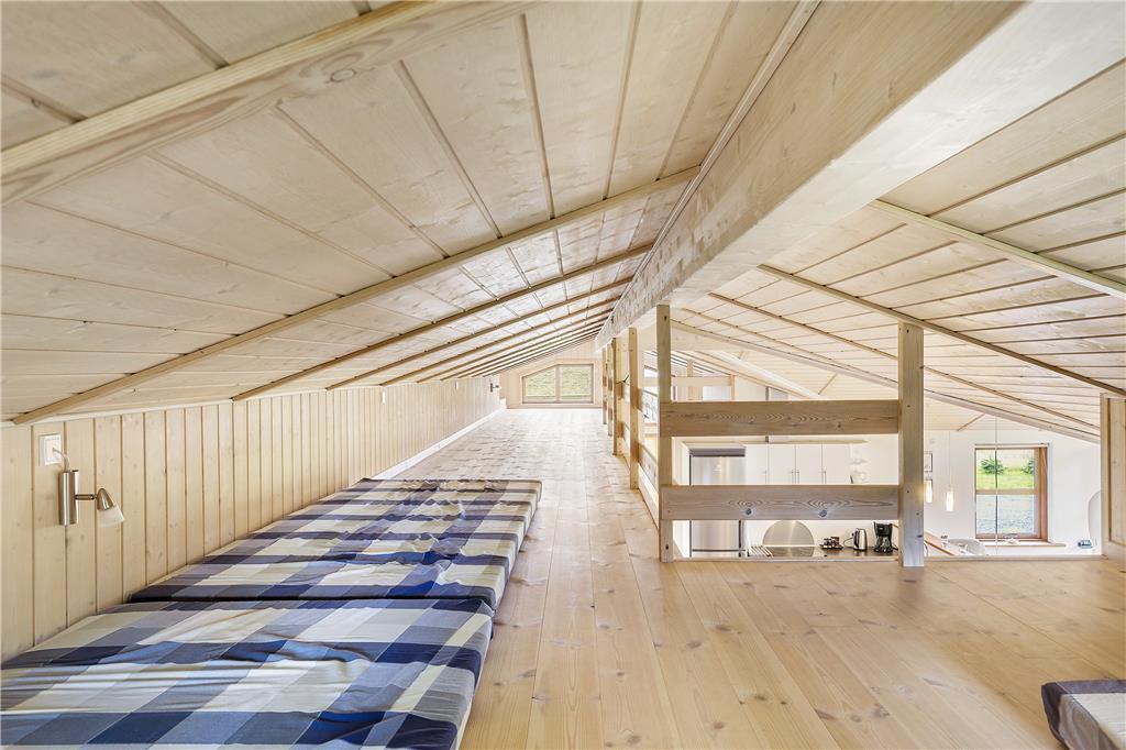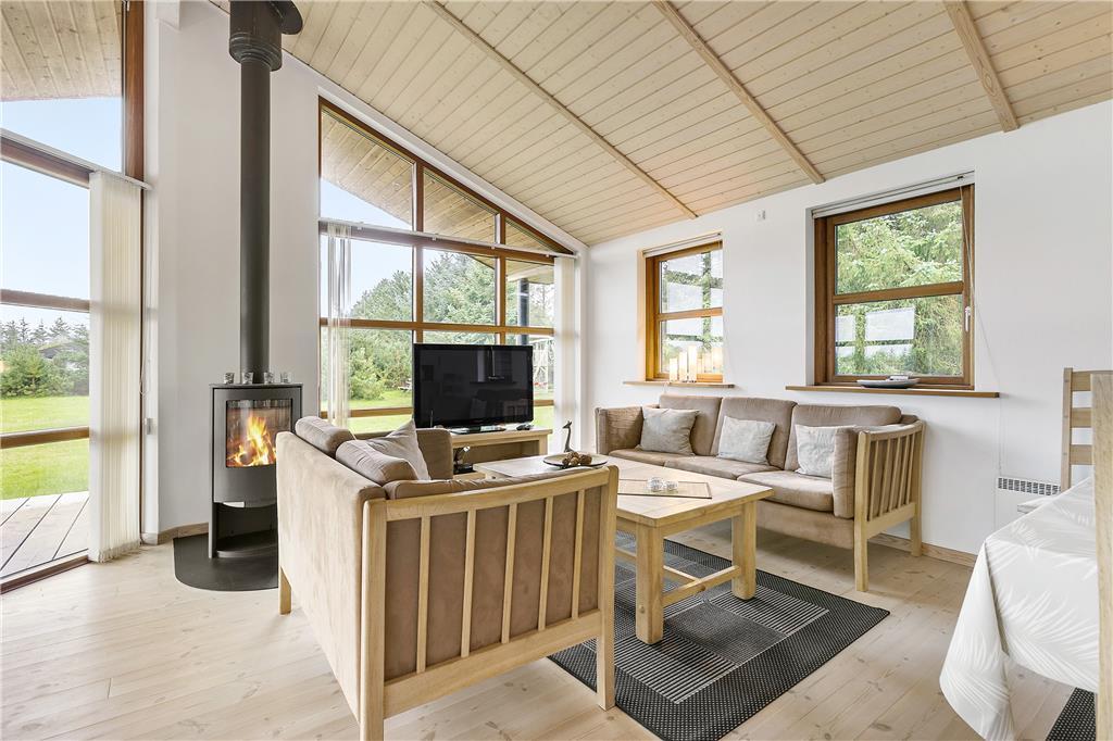 Når du træder ind i sommerhuset, mødes du af en stor og lys stue med højt til loftet, hvor brændeovnen står klar til at skabe hygge på de kølige aftener. I det åbne køkken-alrum strømmer lyset ind gennem de store vinduer, og den rummelige indretning giver mulighed for både at samles omkring spisebordet og nyde de hyggelige stunder foran brændeovnen. Her kan du opleve den perfekte balance mellem moderne komfort og landlig hygge. Et ekstra plus er den store hems, hvor du kan finde et ekstra hyggeligt hjørne til afslapning – perfekt til at læse en god bog, spille brætspil eller bare være sammen. Badeværelset er ligeledes et kapitel for sig med både et spabad og sauna, som indbyder til afslapning efter en dag ude i naturen.