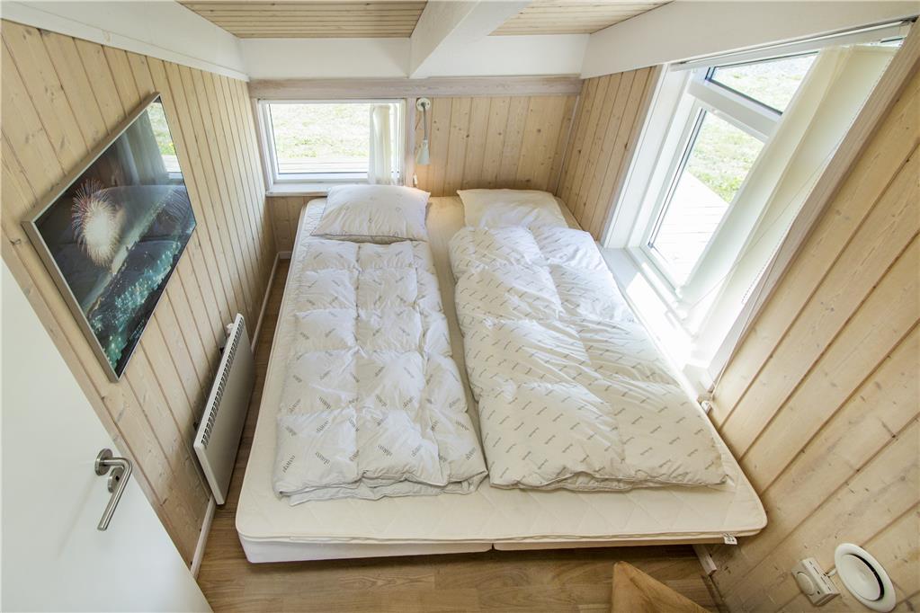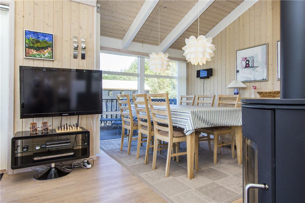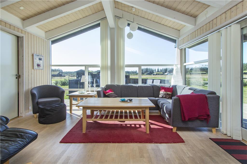 Når du træder indenfor i sommerhuset, mødes du af en lys og indbydende stue med store vinduespartier, der åbner op til det smukke landskab. Det høje loft og de åbne rum giver en følelse af rummelighed, og her er der plads til både hygge og samvær. Det åbne køkken-alrum er perfekt til fælles madlavning, og den stemningsfulde brændeovn bidrager til en hyggelig atmosfære på de køligere dage. Det dejlige badeværelse, der er udstyret med et spabad, giver en ekstra luksus, som gør det let at slappe af og nyde ferien.