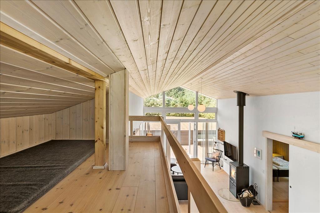 Indenfor bydes du velkommen af et åbent køkkenalrum, hvor du kan tilbringe mange hyggelige stunder med dine nærmeste. Med en rummelig og indbydende stue samt højt til loftet får du en følelse af lys og luft, hvor solen virkelig kan strømme ind gennem de store vinduer. Det er det perfekte sted at samles om en god middag, spille brætspil eller blot slappe af foran brændeovnen, der skaber en ekstra hygge på de kølige dage. Et flot badeværelse med både spabad og sauna inviterer til wellness og afslapning, og for de yngre familiemedlemmer er hemsen den perfekte legested.