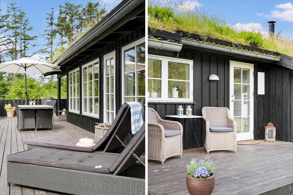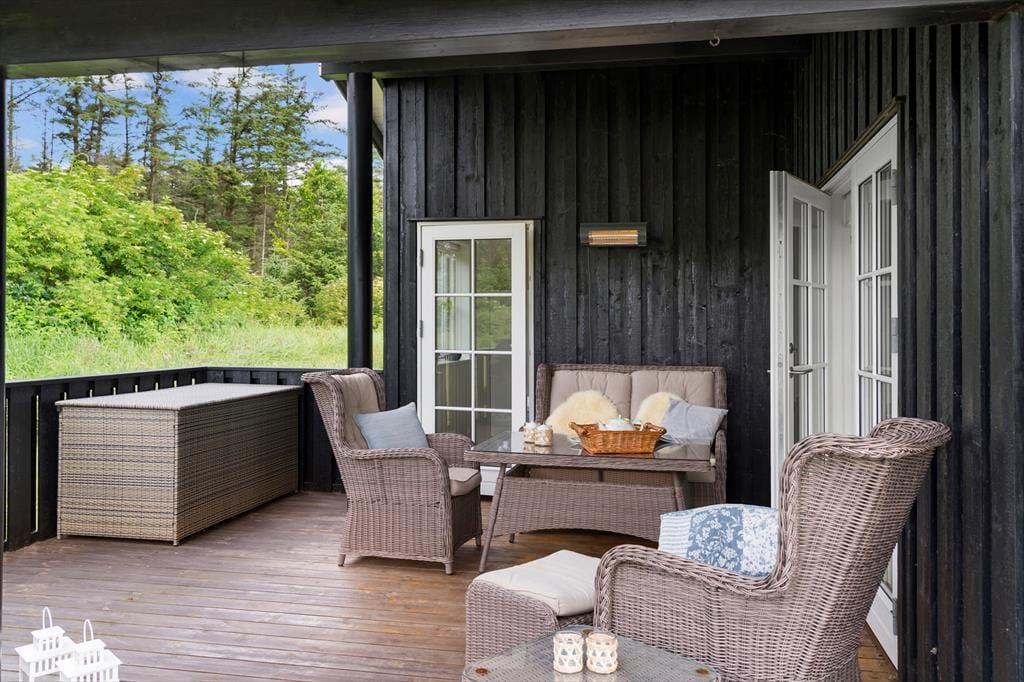 Når du træder ud på den store terrasse, åbenbares en udendørs oase, hvor solen altid er til stede. Den rummelige terrasse tilbyder rig mulighed for at slappe af i solen eller finde skygge under overdækket område – ideelt til både dagtimerne og de lune sommeraftener. Her kan du sidde uforstyrret og nyde udsigten, mens fuglene kvidrer og vinden leger i træerne. Med terrasseplads både foran og bagved huset er der rig mulighed for at finde den helt rette placering alt efter, om du ønsker at slappe af i solen eller nyde et middagsselskab i den kølige skygge. Når solen går ned, kan du tænde op i grillen og forberede en lækker middag under åben himmel.