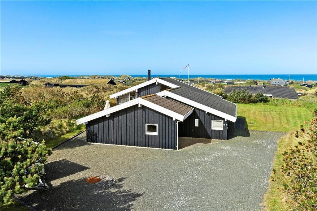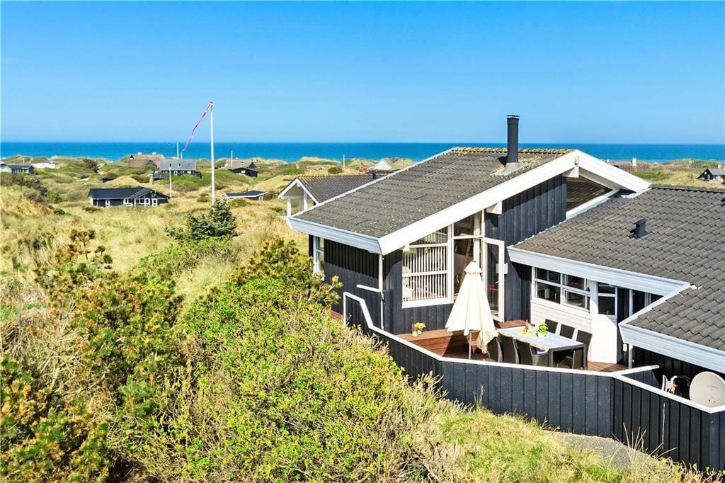 Sommerhuset byder velkommen med en lys og indbydende stue, hvor du kan varme dig foran brændeovnen og samtidig nyde den fantastiske havudsigt. De store vinduer giver masser af naturligt lys, og du kan høre bølgerne fra Vesterhavet, selv mens du slapper af indendørs. Det åbne opholdsområde skaber en hyggelig og afslappet atmosfære, og fra stuen er der direkte adgang til terrassen, hvor du kan nyde en kop kaffe og den friske luft. Huset har også en unik hems, hvor du kan sidde og beundre den smukke havudsigt – en perfekt spot til at fordybe dig i en god bog eller bare nyde stilheden.