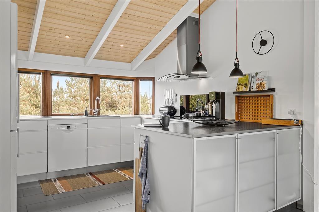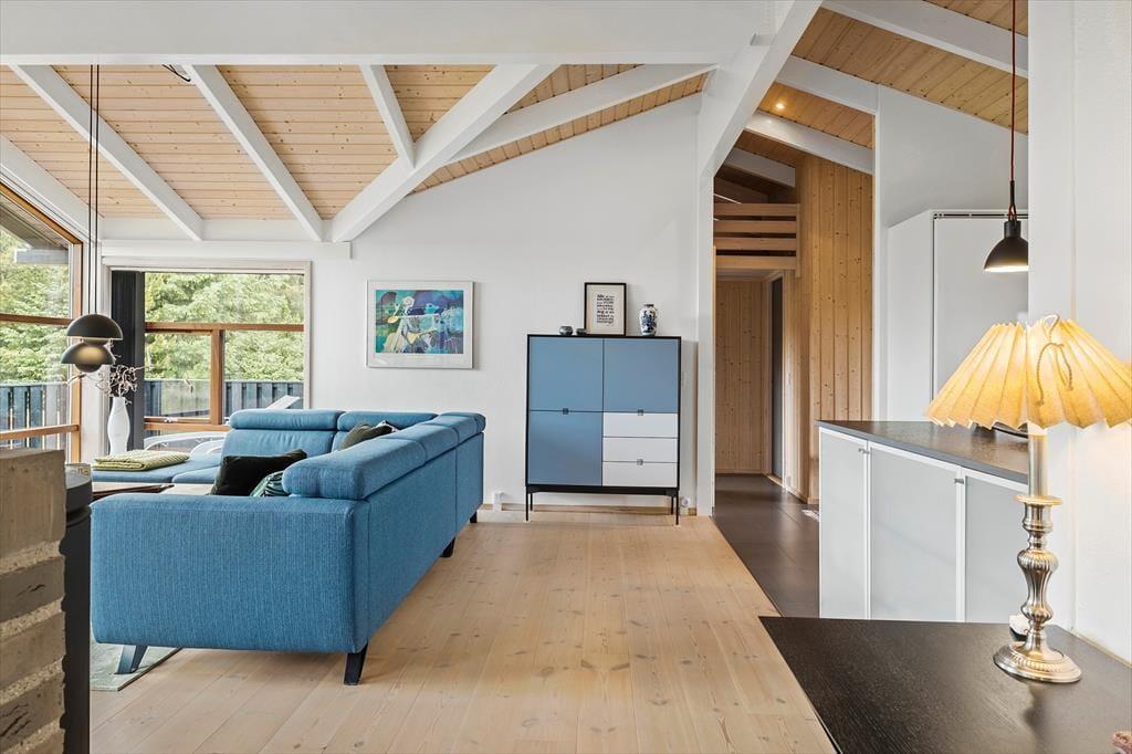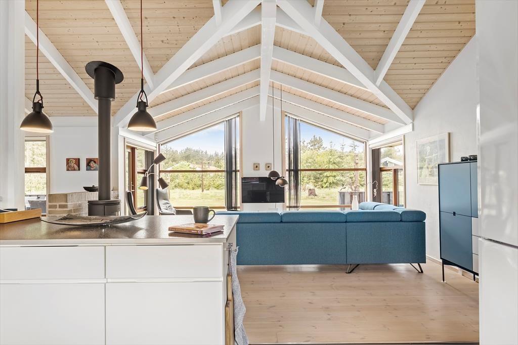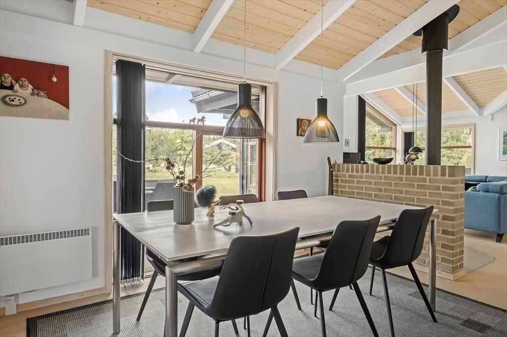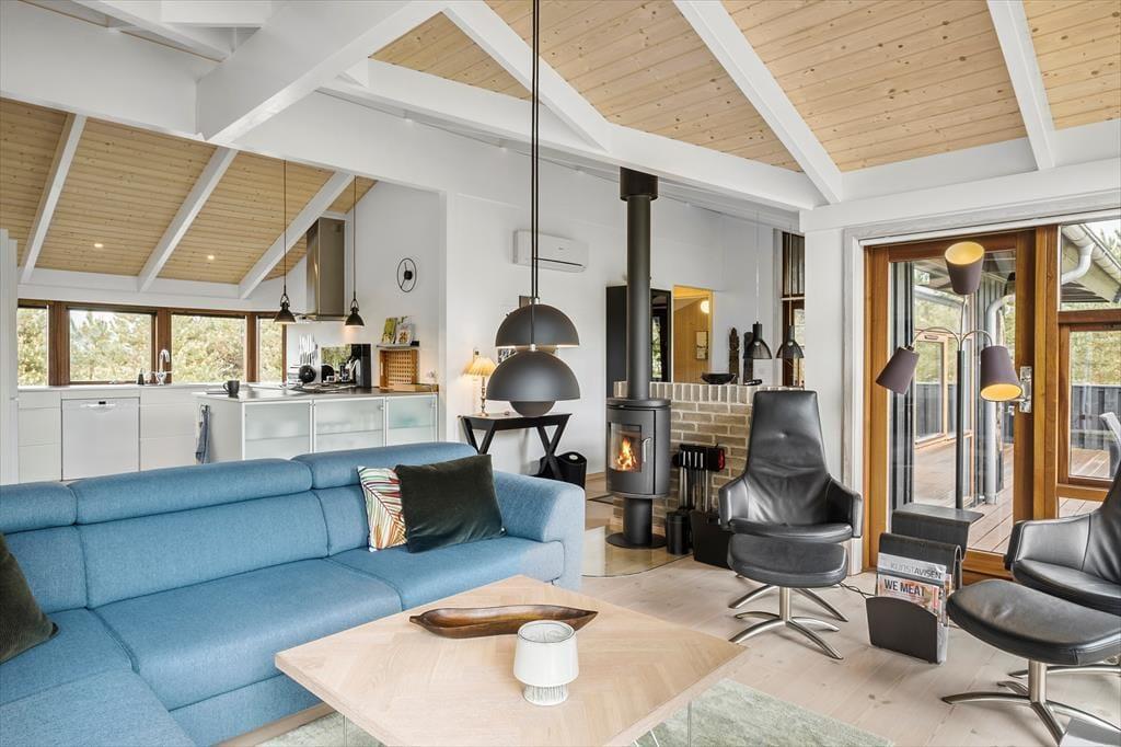 Det 107 m2 store sommerhus har en skøn indretning til seks personer. Sengepladserne er fordelt på tre gode soveværelser, og på badeværelset er der ikke bare bruseniche, vaskemaskine og gulvvarme, men også spabad og sauna til livsnyderne. Driverlivet kan ligeledes foregå i stuen, hvor I kan sætte jer godt til rette i sofaen med varm kaffe nær brændeovnen. Herfra har I frit udsyn til stuens store fladskærms-tv, men også til det grønne landskab, der breder sig udenfor vinduerne. I stuen er der for øvrigt en hyggelig spiseplads, og herfra har I ikke mange skridt hen til husets åbne og veludstyrede køkken.