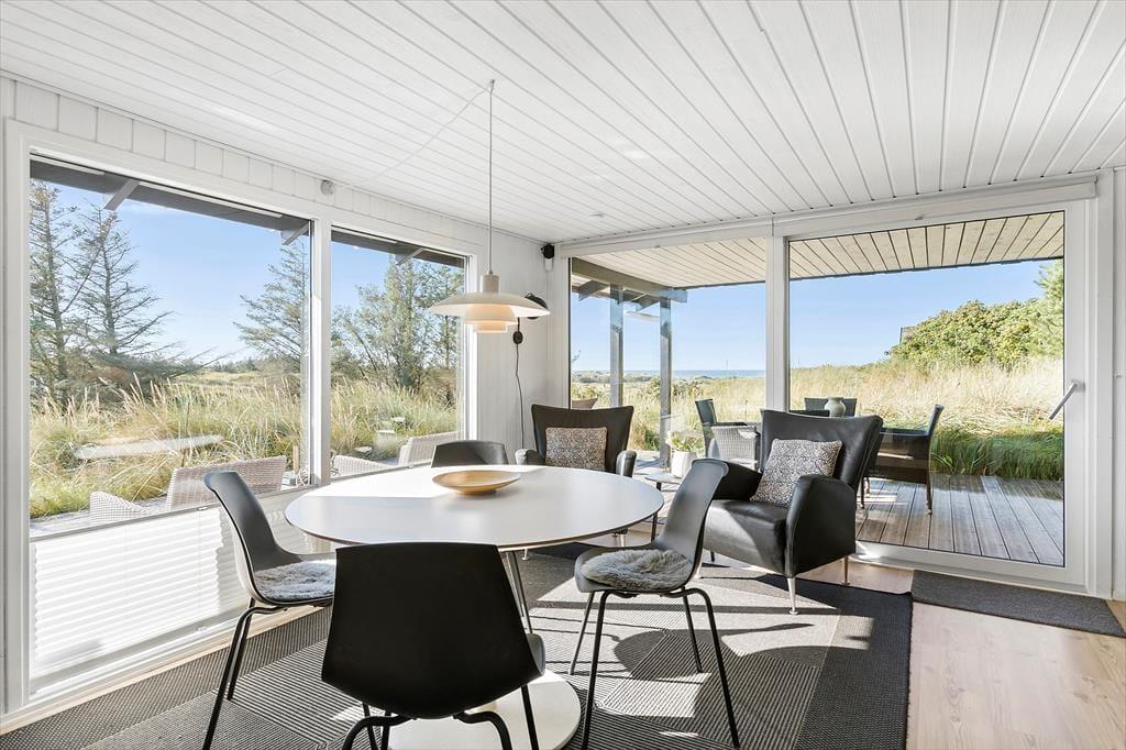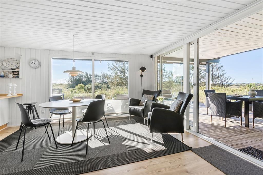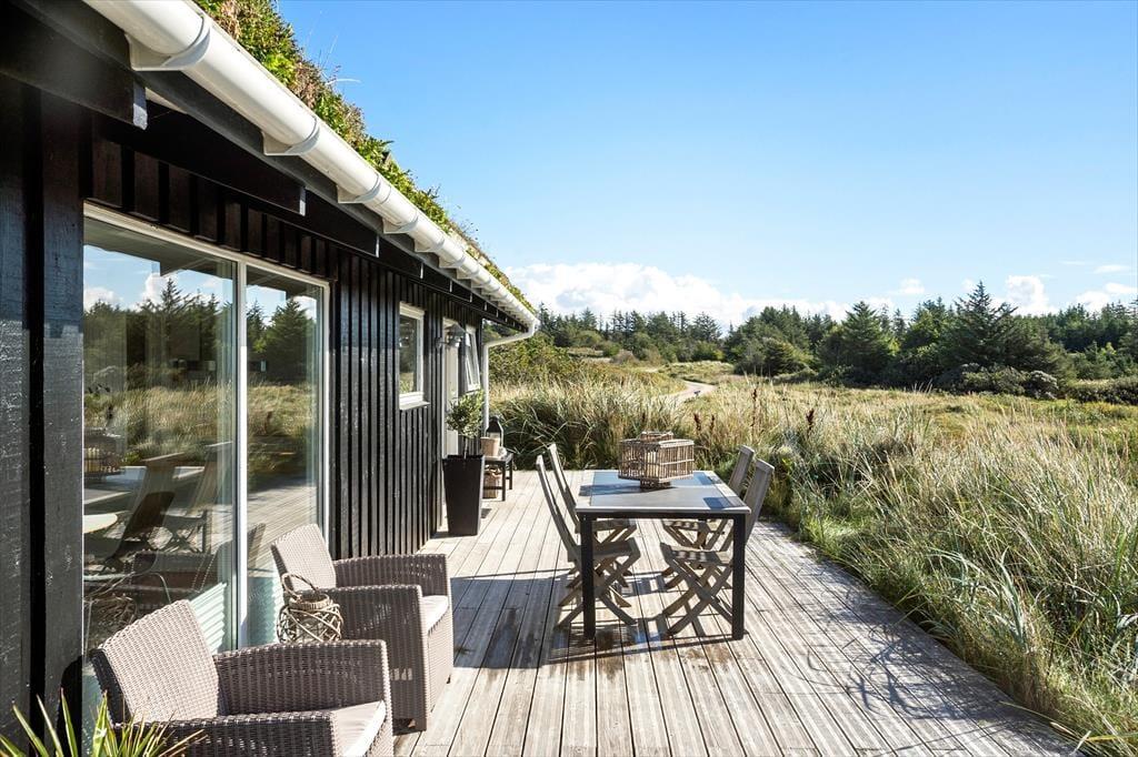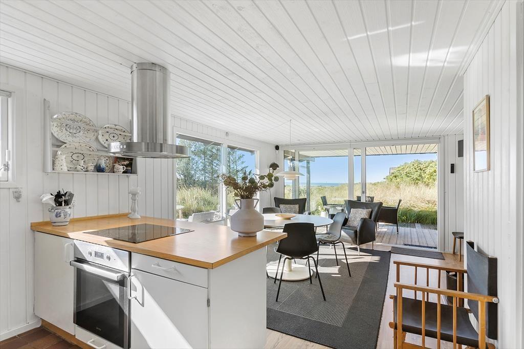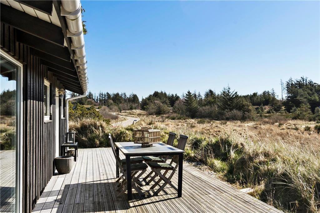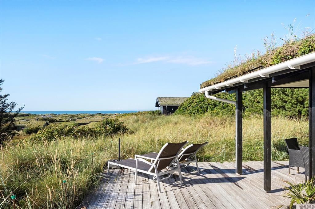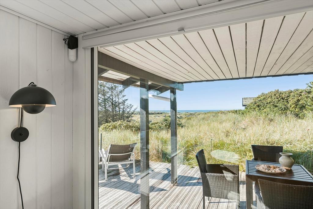 Fra stuen har du direkte adgang til den store terrasse, hvor du kan nyde solen og den fantastiske havudsigt. Terrasseområdet er den perfekte oase til at slappe af og tage en pause fra hverdagen, og den lyse, åbne atmosfære gør det muligt at nyde både morgenkaffen og middagen under åben himmel. Den skønne naturgrund omkring sommerhuset giver dig masser af plads til at udforske og nyde den friske luft, og du er kun få skridt fra stranden, hvor du kan tage en forfriskende dukkert i Vesterhavet. Det er et ideelt sted at lade tankerne flyve og finde ro.