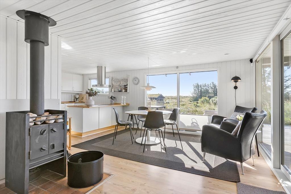 Når du træder ind i sommerhuset, bliver du mødt af en indbydende og lys stue, hvor de store vinduespartier giver dig en helt unik udsigt til havet. Den varme brændeovn bidrager til en hyggelig stemning og gør det til det perfekte sted at tilbringe de kølige aftener. Stuen er ideel til både afslapning og samvær med familie og venner, og du vil hurtigt føle dig hjemme i den dejlige atmosfære. Uanset om du vil sidde og nyde udsigten, spille brætspil eller læse en god bog, er der plads til det hele. Sommerhuset emmer af en helt særlig sommerhusstemning, hvor du kan lade op og nyde de enkle glæder ved livet.