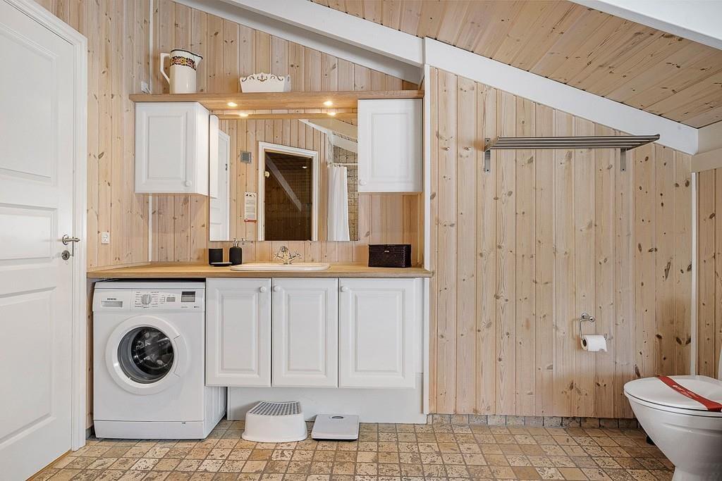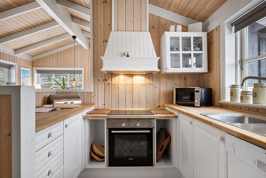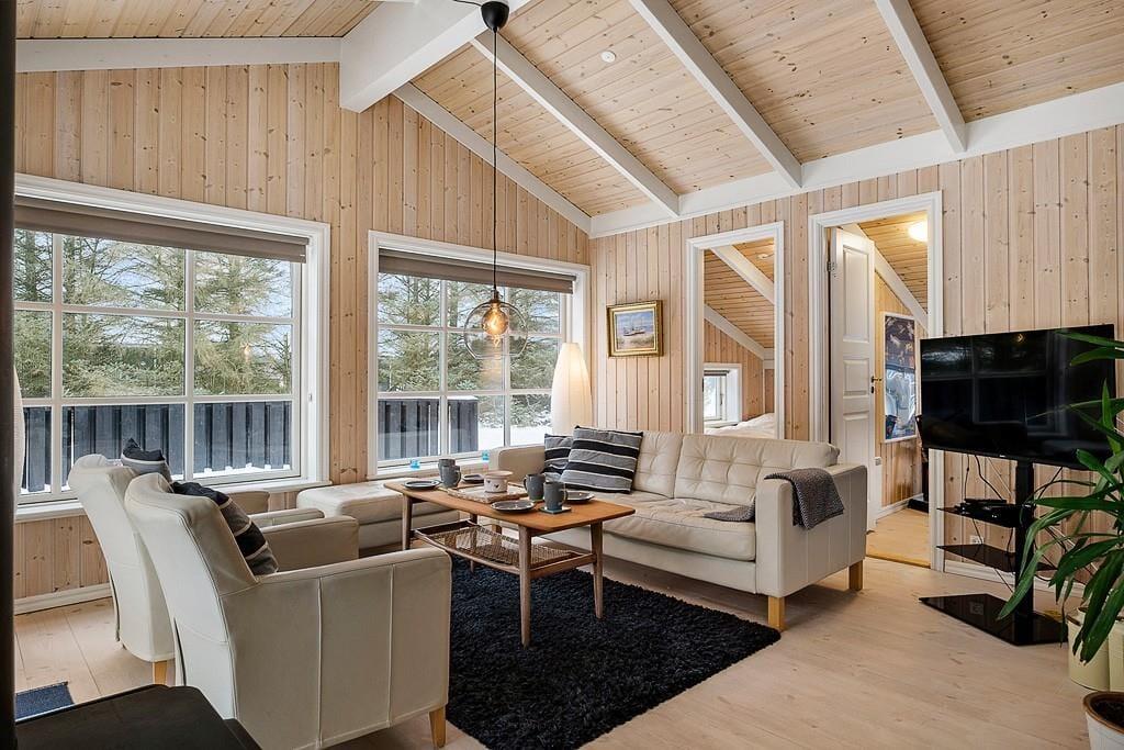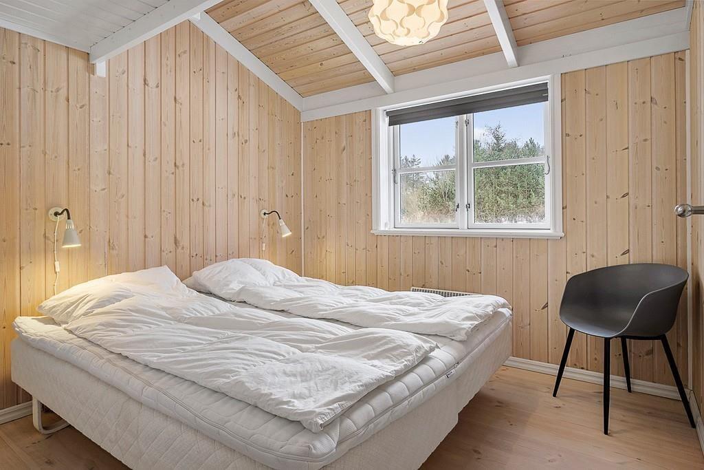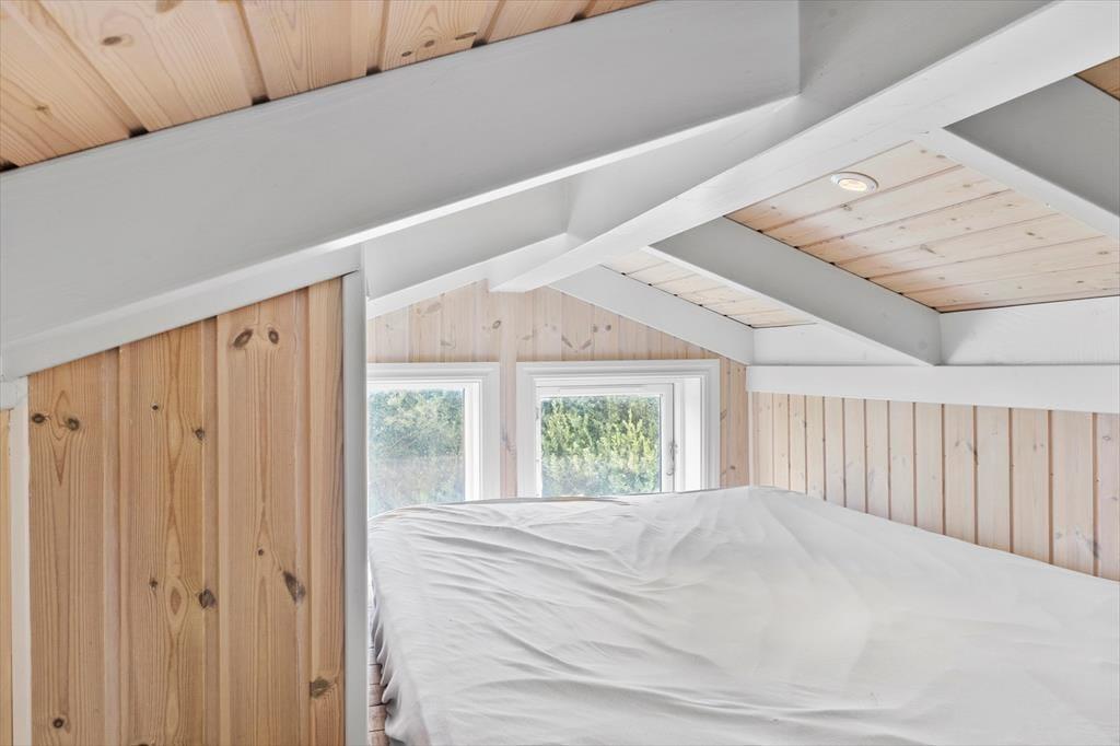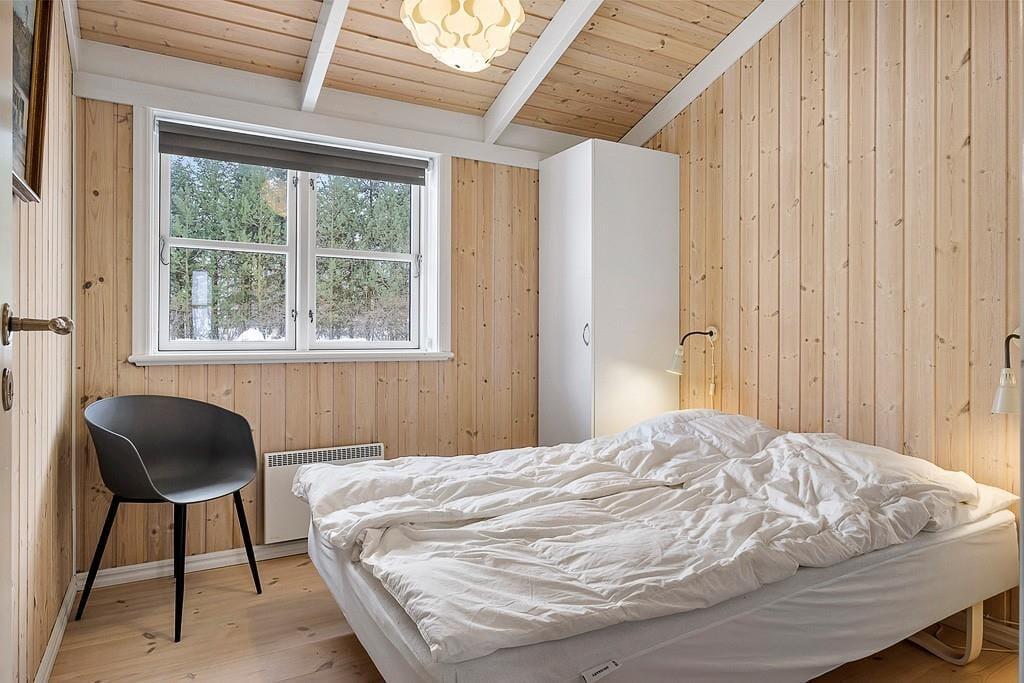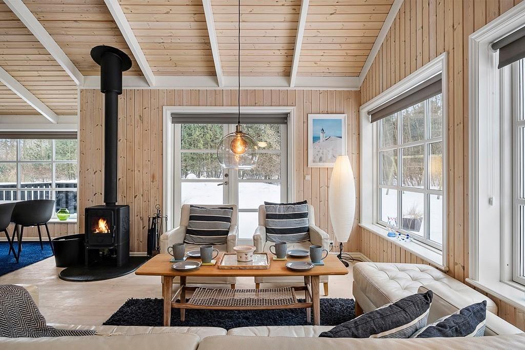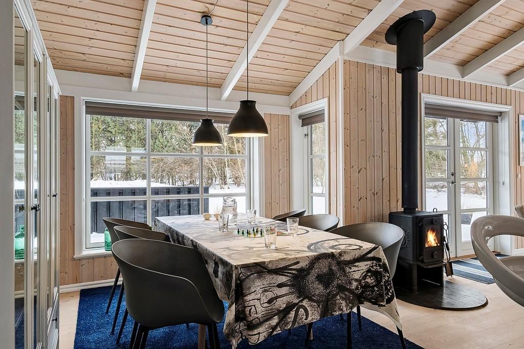 Indenfor i sommerhuset bliver I mødt af en varm og indbydende atmosfære. Stuen er hyggeligt indrettet med en brændeovn, hvor I kan samles om aftenen og nyde en god bog eller et brætspil, mens flammerne knitrer i baggrunden. Køkken-alrummet er husets hjerte – her er masser af plads til både madlavning og hyggelige måltider. Det er ideelt til familier, der ønsker at tilbringe tid sammen i et åbent og socialt rum. Uanset om I er ved at forberede en god middag eller nyder en morgenkaffe, giver dette rum en helt særlig følelse af sammenhold og hjemlig hygge.