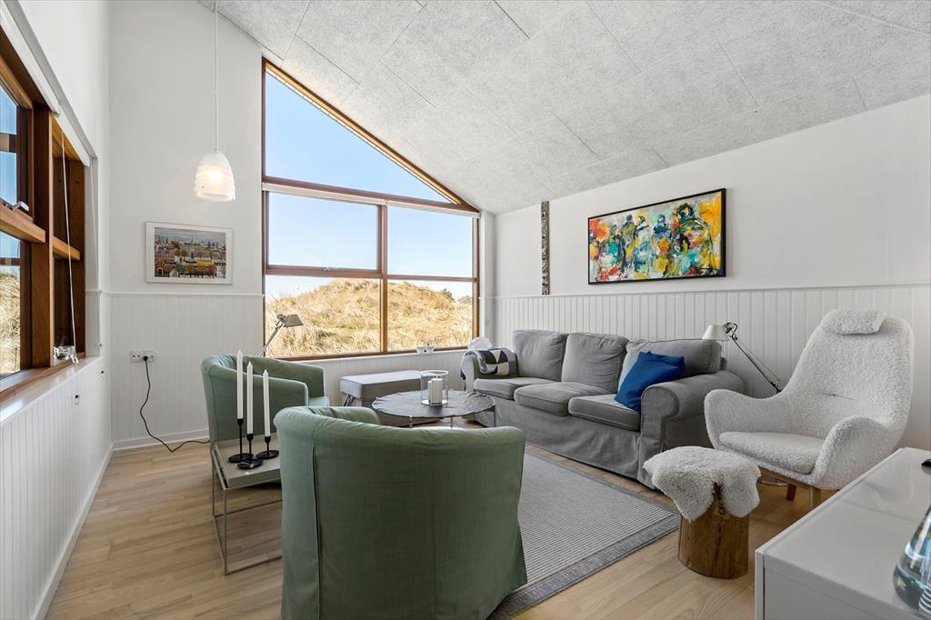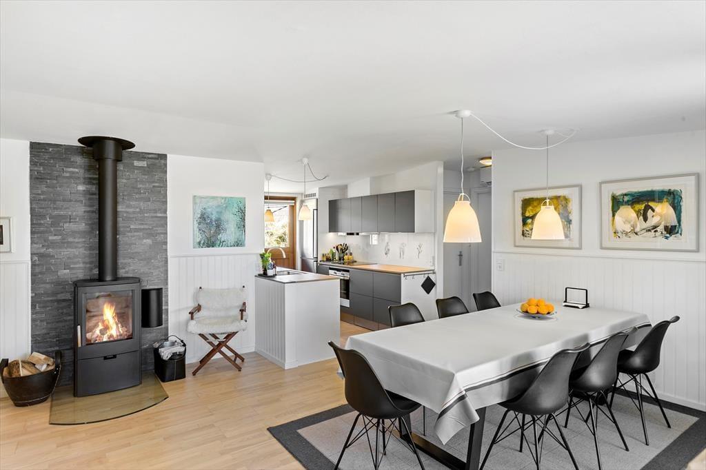 Indendørs byder sommerhuset på en lys og venlig indretning, hvor åbne rum og store vinduespartier skaber en indbydende atmosfære, der umiddelbart får dig til at føle dig hjemme. Køkkenet og opholdsrummet er i åben forbindelse, så du kan være tæt på hinanden, uanset om der kokkereres i køkkenet, hygges med brætspil foran brændeovnen, eller du bare ønsker at slappe af med en god bog. Med en praktisk planløsning er der god plads til både familier og vennegrupper, der ønsker at tilbringe tid sammen under samme tag, men med mulighed for at finde en stille hyggekrog, når man har brug for det. Det er det perfekte sted at nyde din ferie, uanset om du er til afslapning eller små aktiviteter.