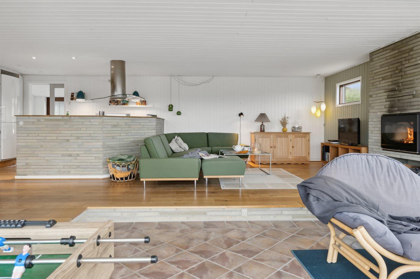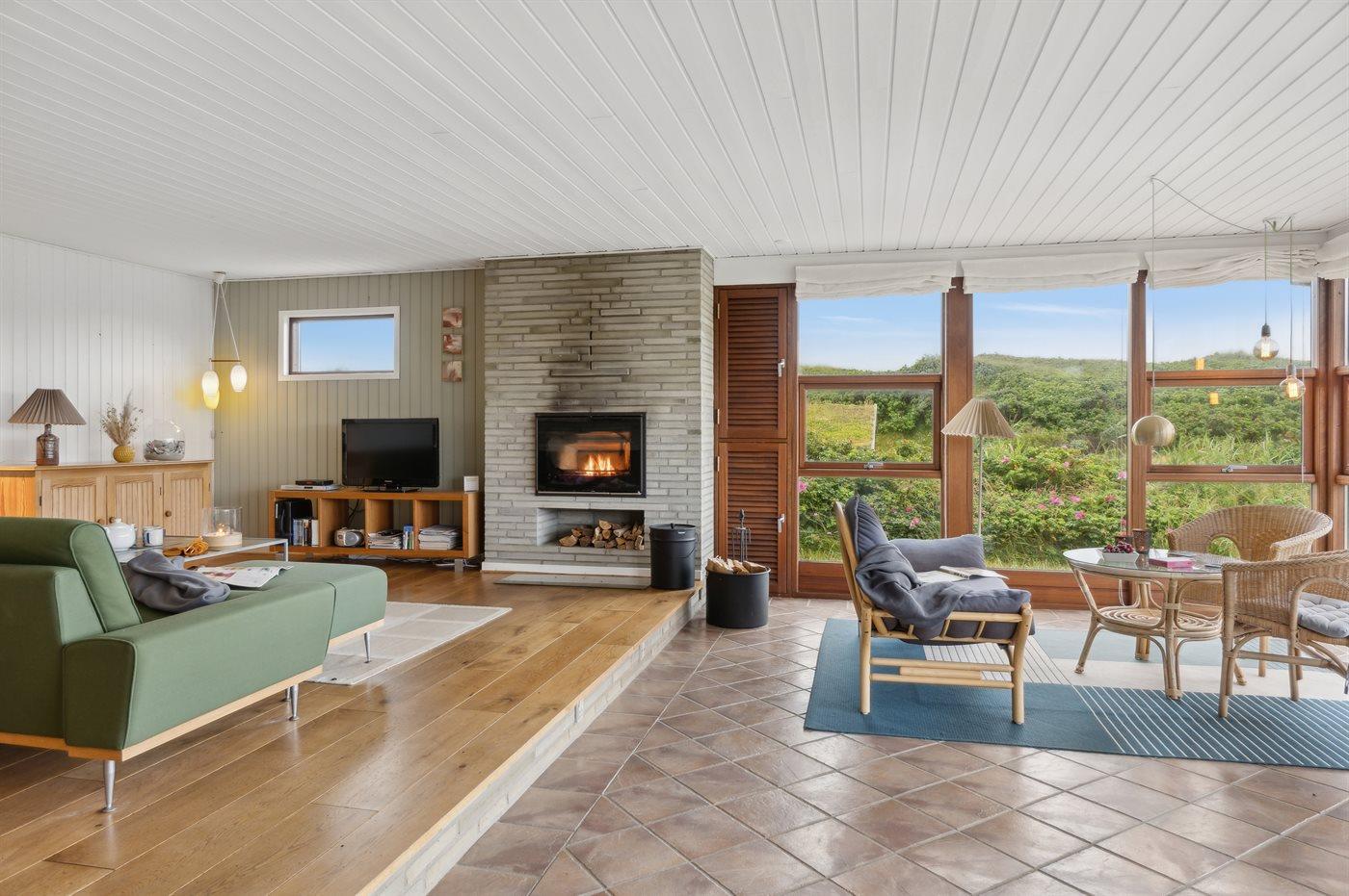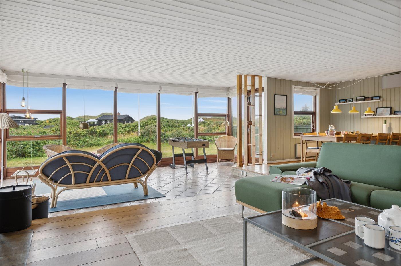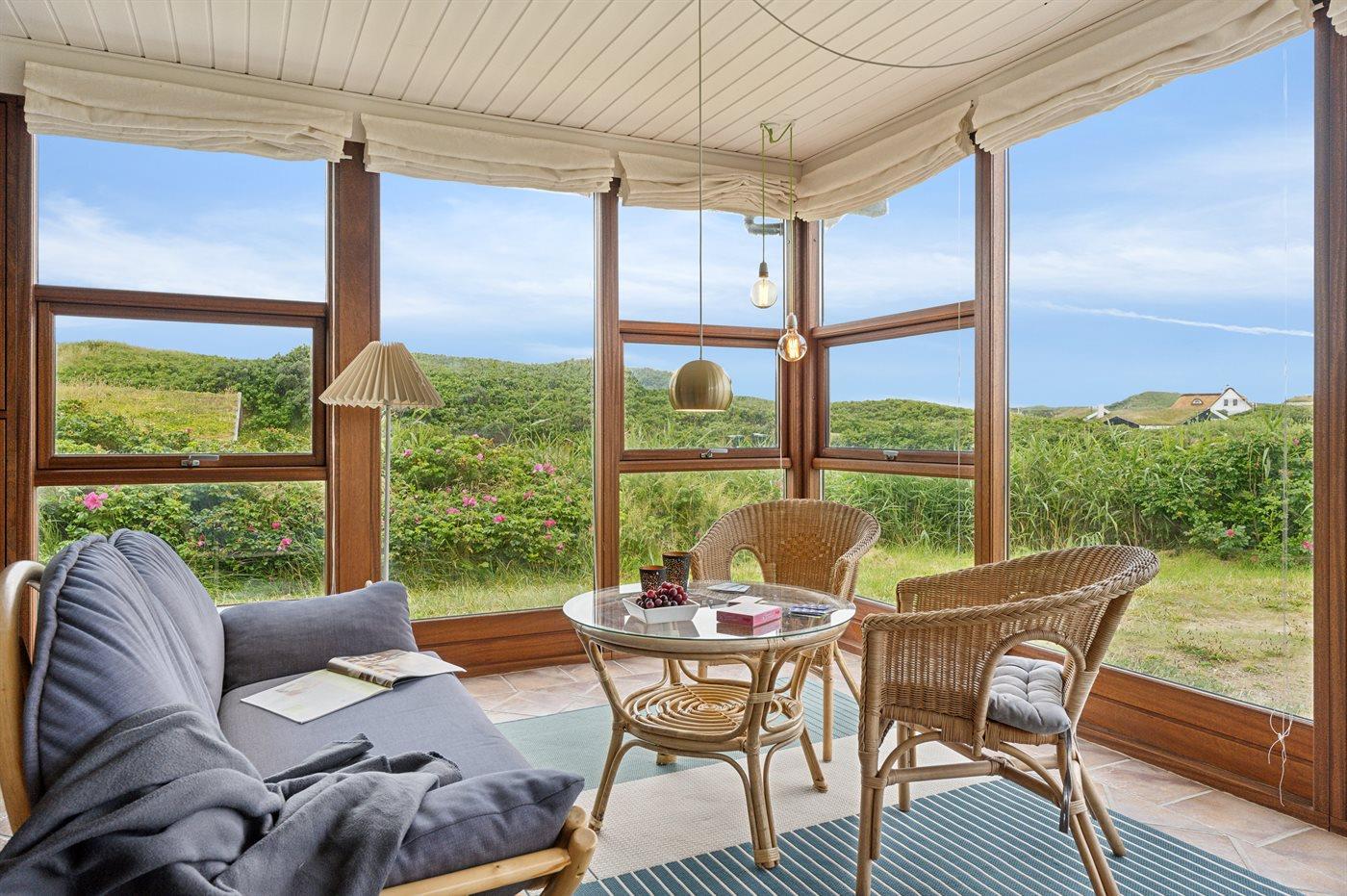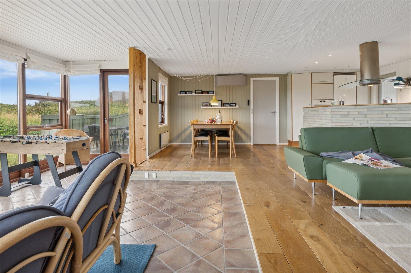 Skønt sommerhus med anneks nær Vesterhavet, sauna og stor terrasse på kuperet grund tæt på stranden.