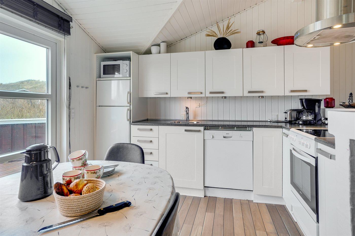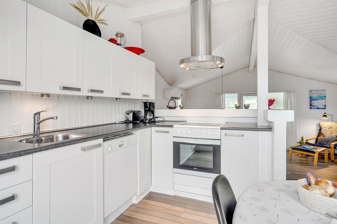 Køkkenet er udstyret med 1 køleskab. Der er 4 elkogeplader, varmluftovn, mikrobølgeovn samt opvaskemaskine.
