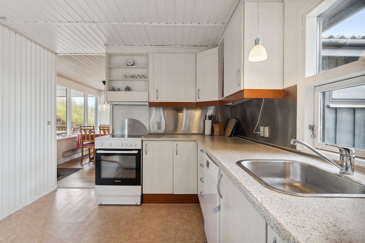 Køkkenet er udstyret med 1 køleskab. Der er 4 elkogeplader, bageovn, mikrobølgeovn samt opvaskemaskine.