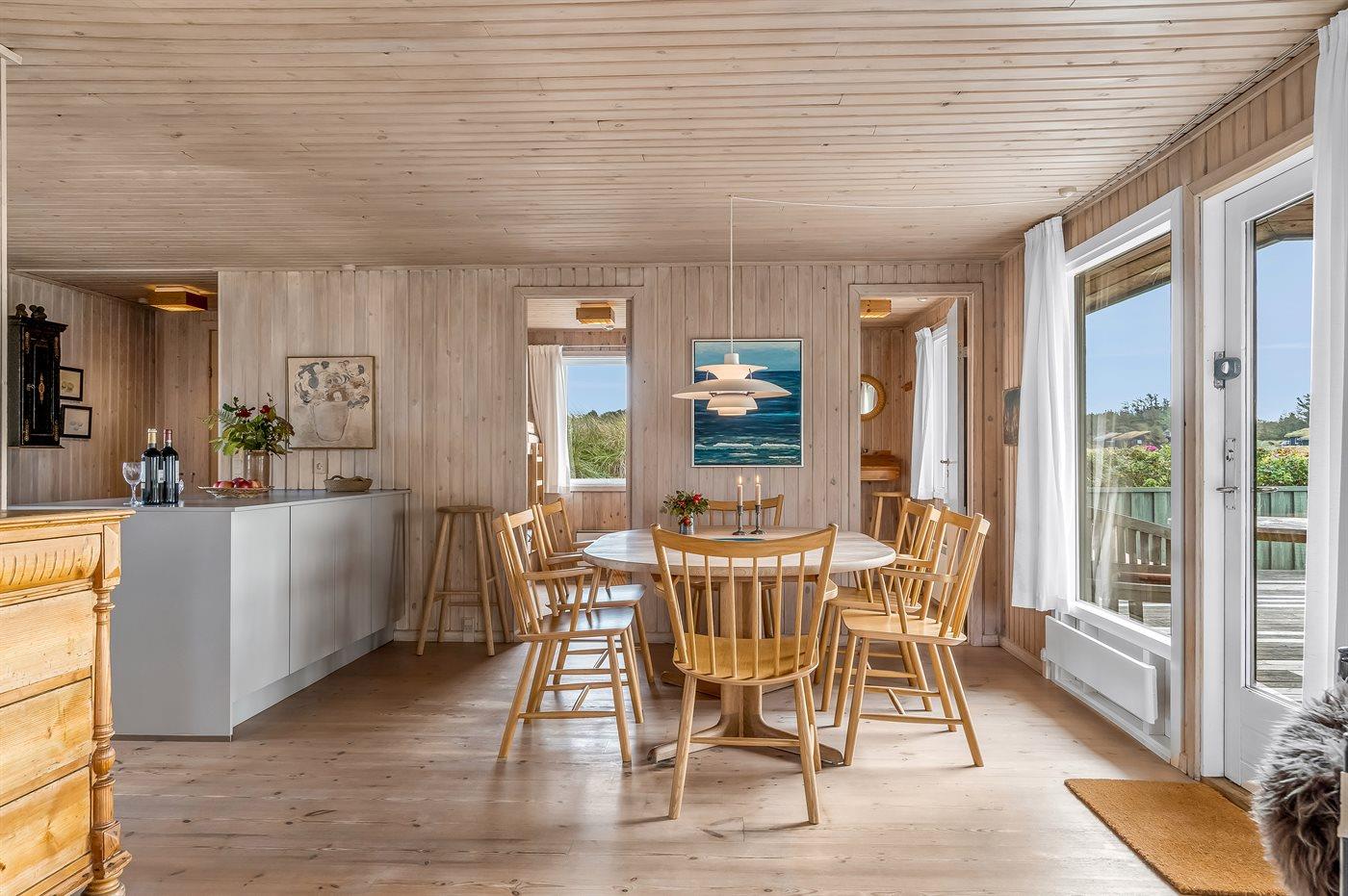 På en smuk, kuperet grund i et roligt og naturskønt område med mange gangstier ligger dette veludstyrede sommerhus. Fra såvel hus som grund er der udsigt over Vesterhavet.