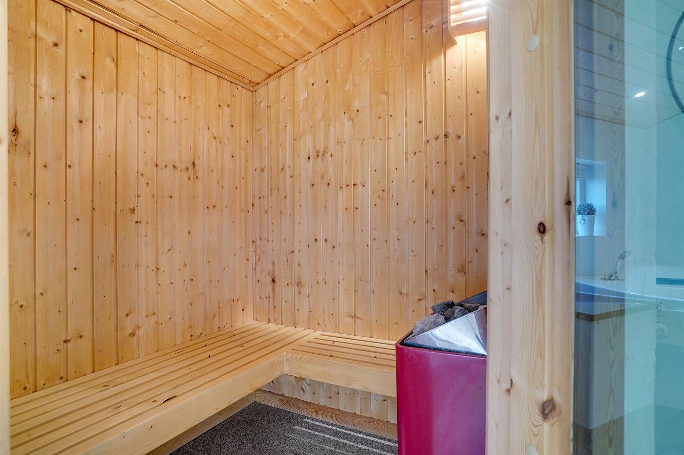 Der er 1 badeværelse med bruser og 1 toilet.. Der er gulvvarme på 1 badeværelse. I saunaen er der mulighed for afslapning.