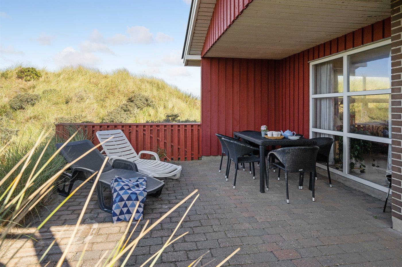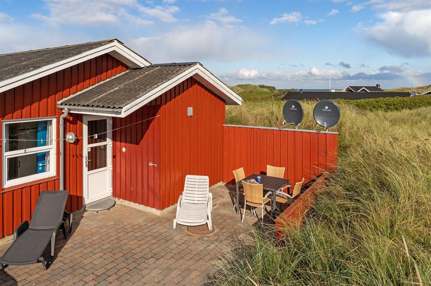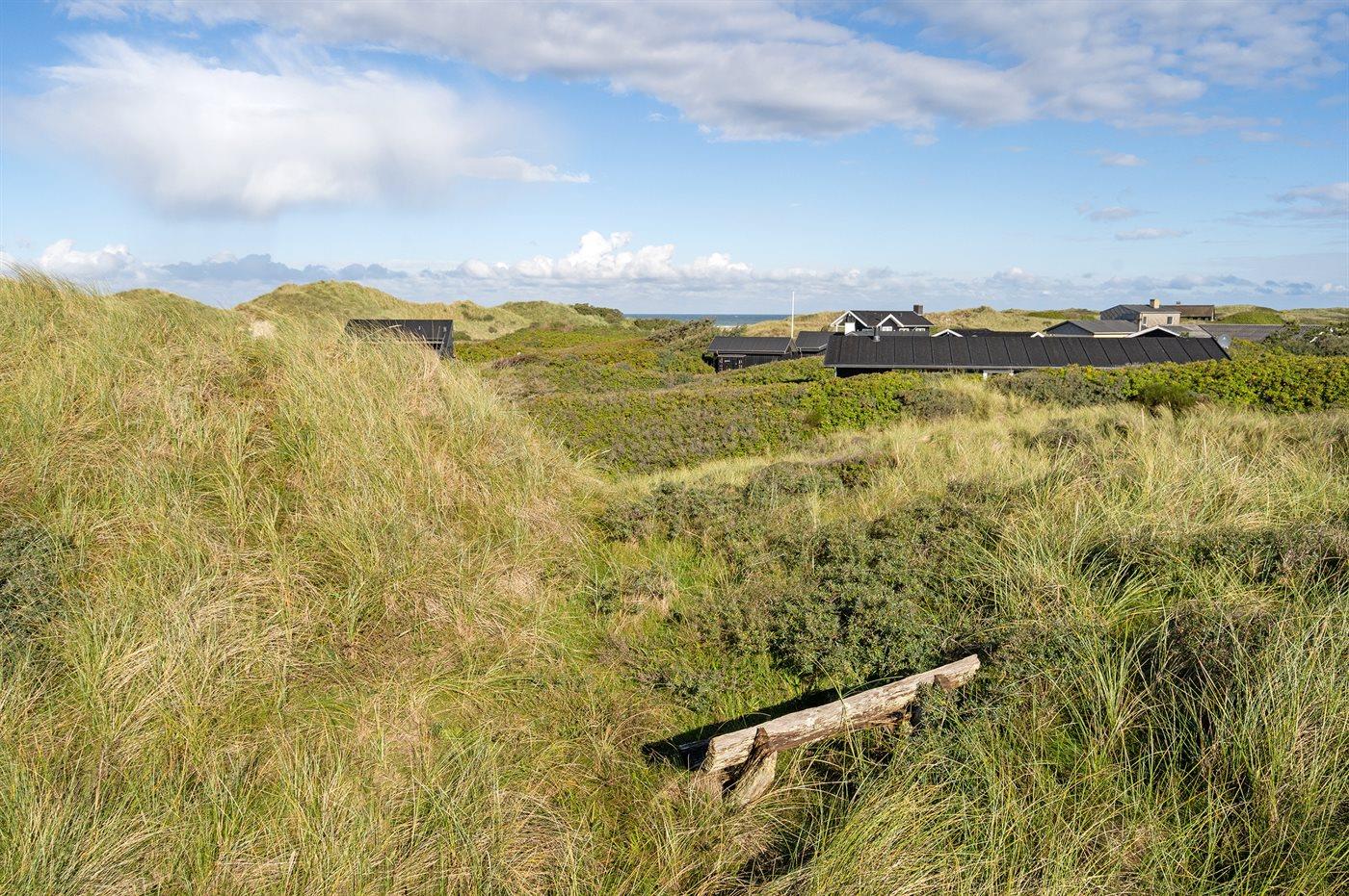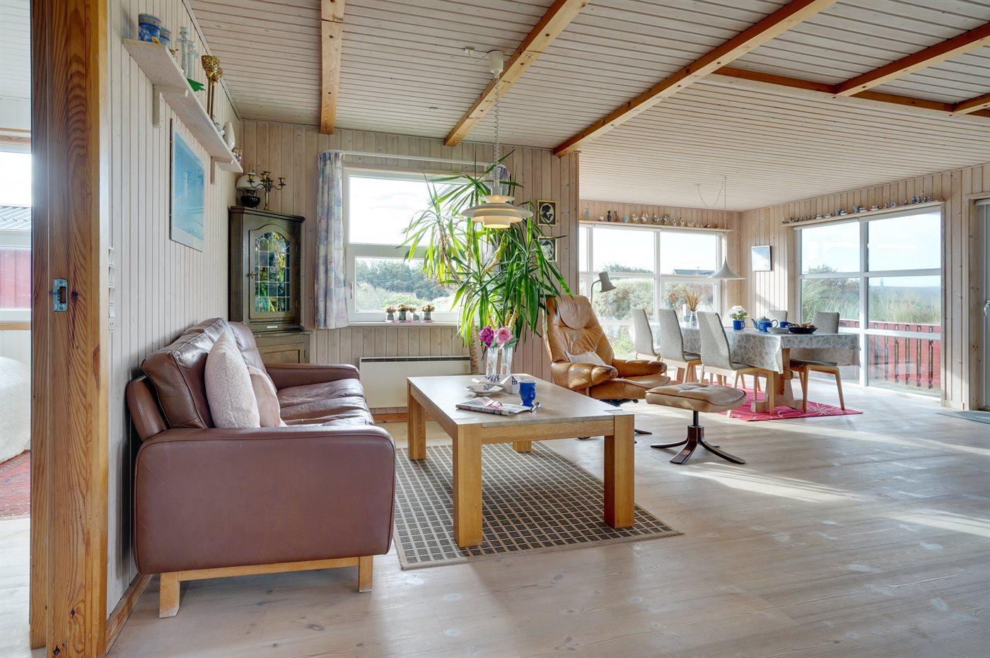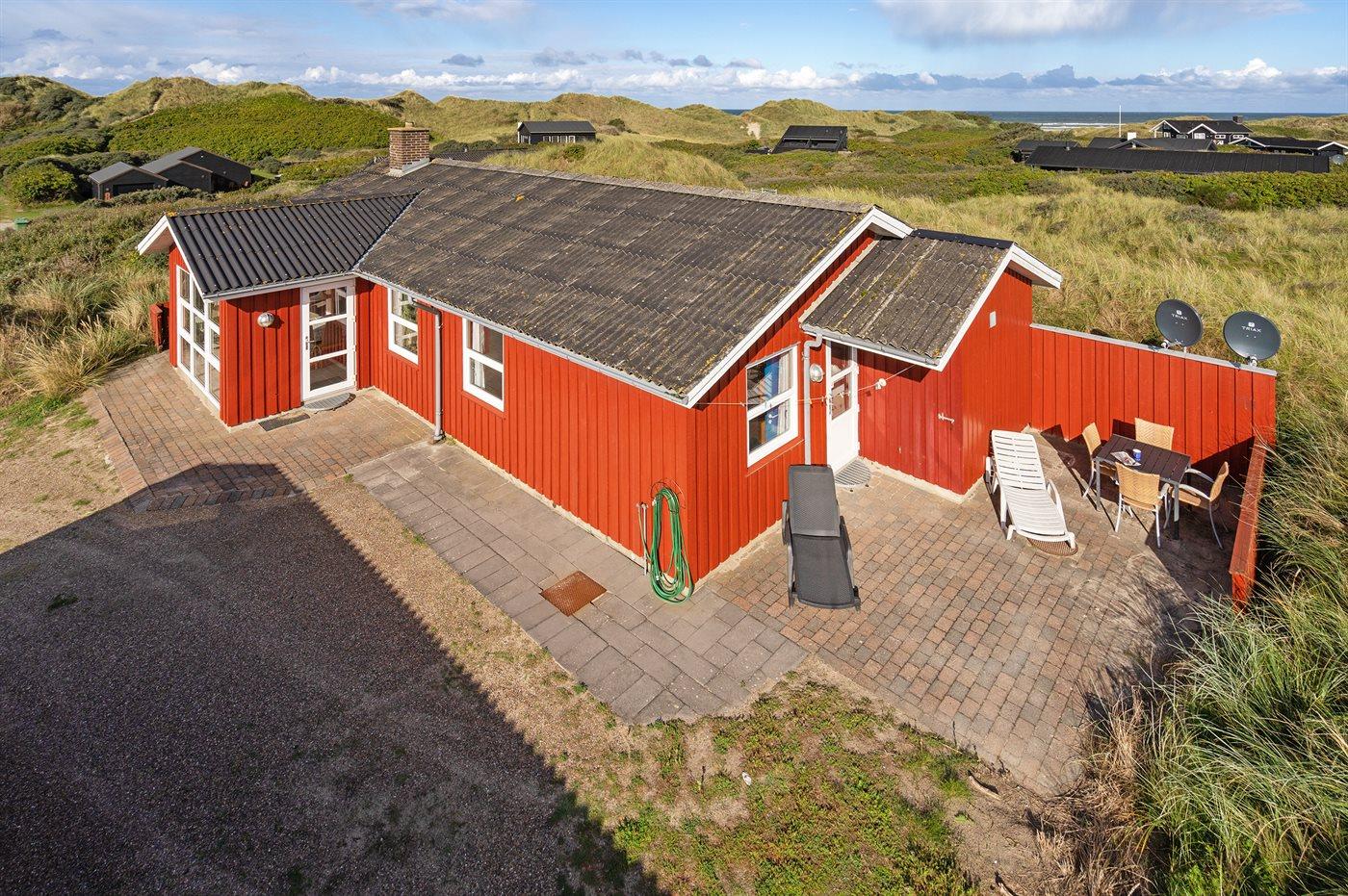Rummeligt sommerhus højt beliggende på en skøn kuperet grund i storslået natur lige bag klitterne til stranden og Vesterhavet. Havudsigt fra såvel hus som grund. Til huset hører gode terrasser, naturligt afskærmet af klitter, med havemøbler.
