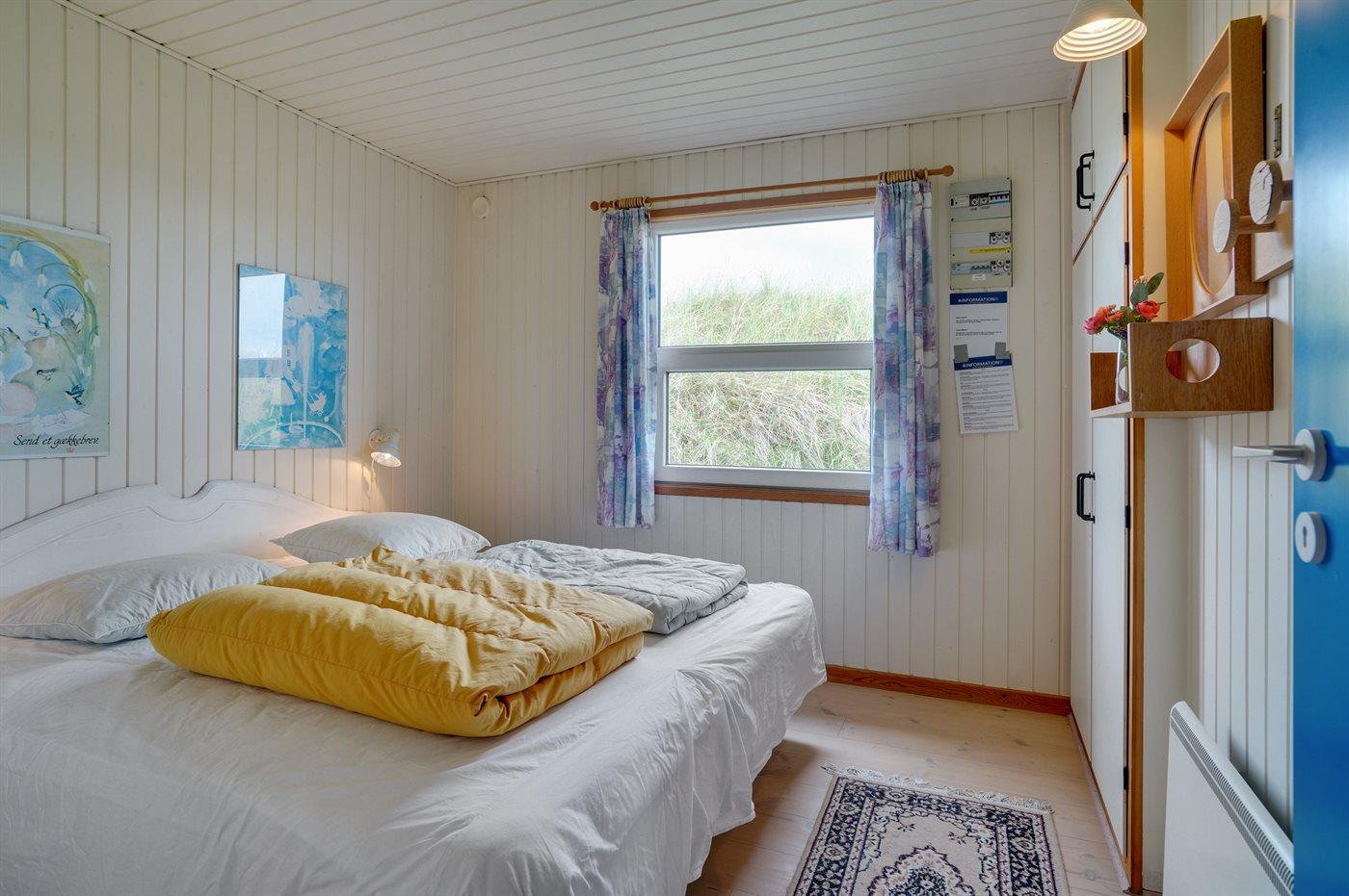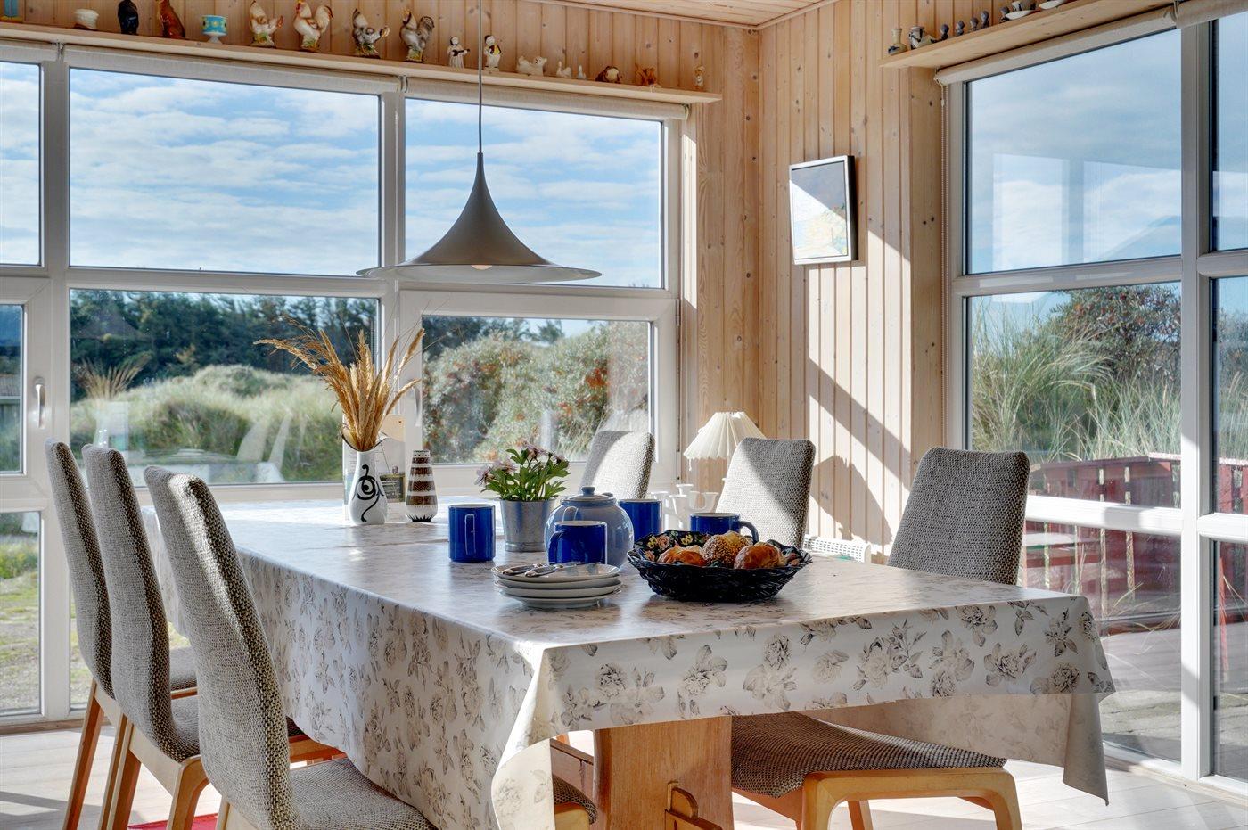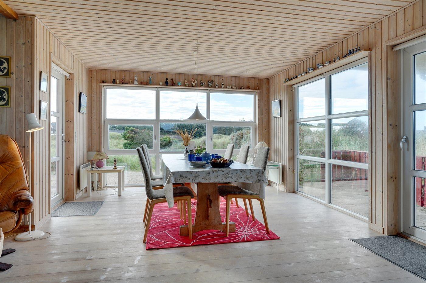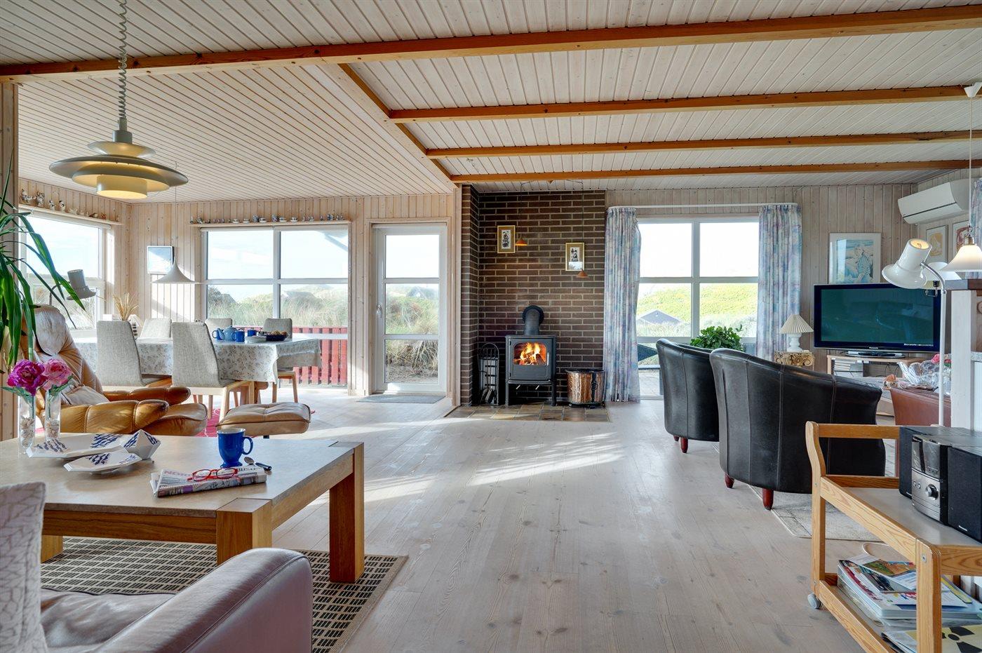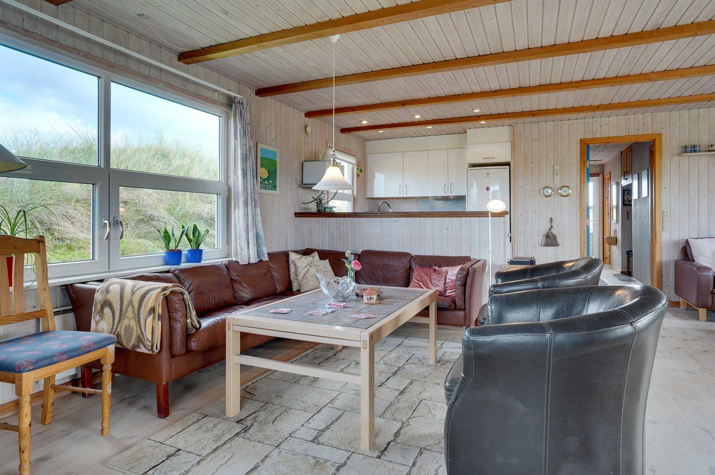 Rummeligt sommerhus højt beliggende på en skøn kuperet grund i storslået natur lige bag klitterne til stranden og Vesterhavet. Havudsigt fra såvel hus som grund. Til huset hører gode terrasser, naturligt afskærmet af klitter, med havemøbler.