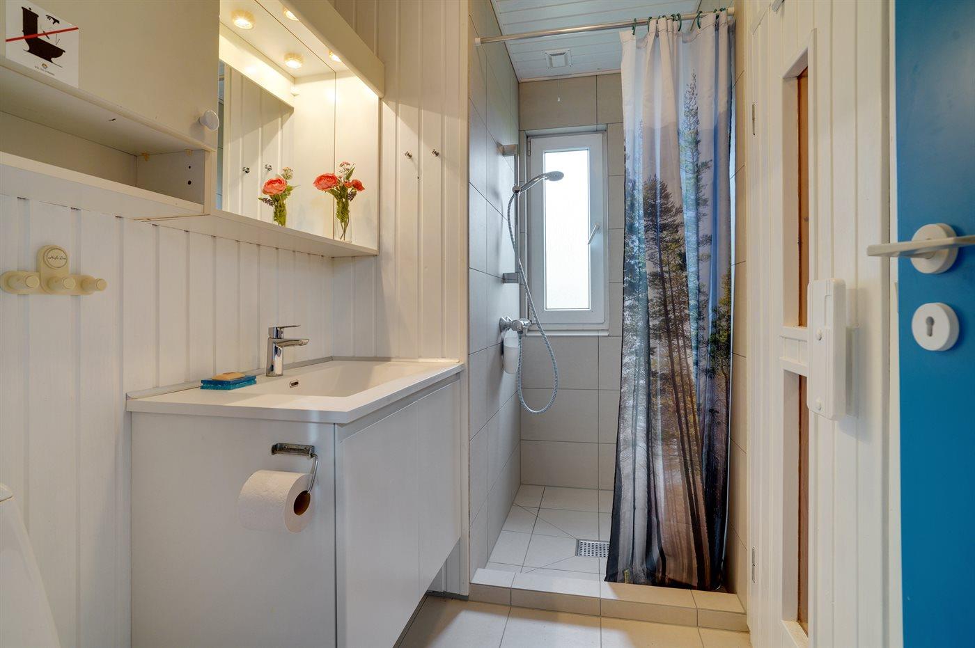 Der er 1 badeværelse med bruser og 1 toilet.. Der er gulvvarme på 1 badeværelse. I saunaen er der mulighed for afslapning.