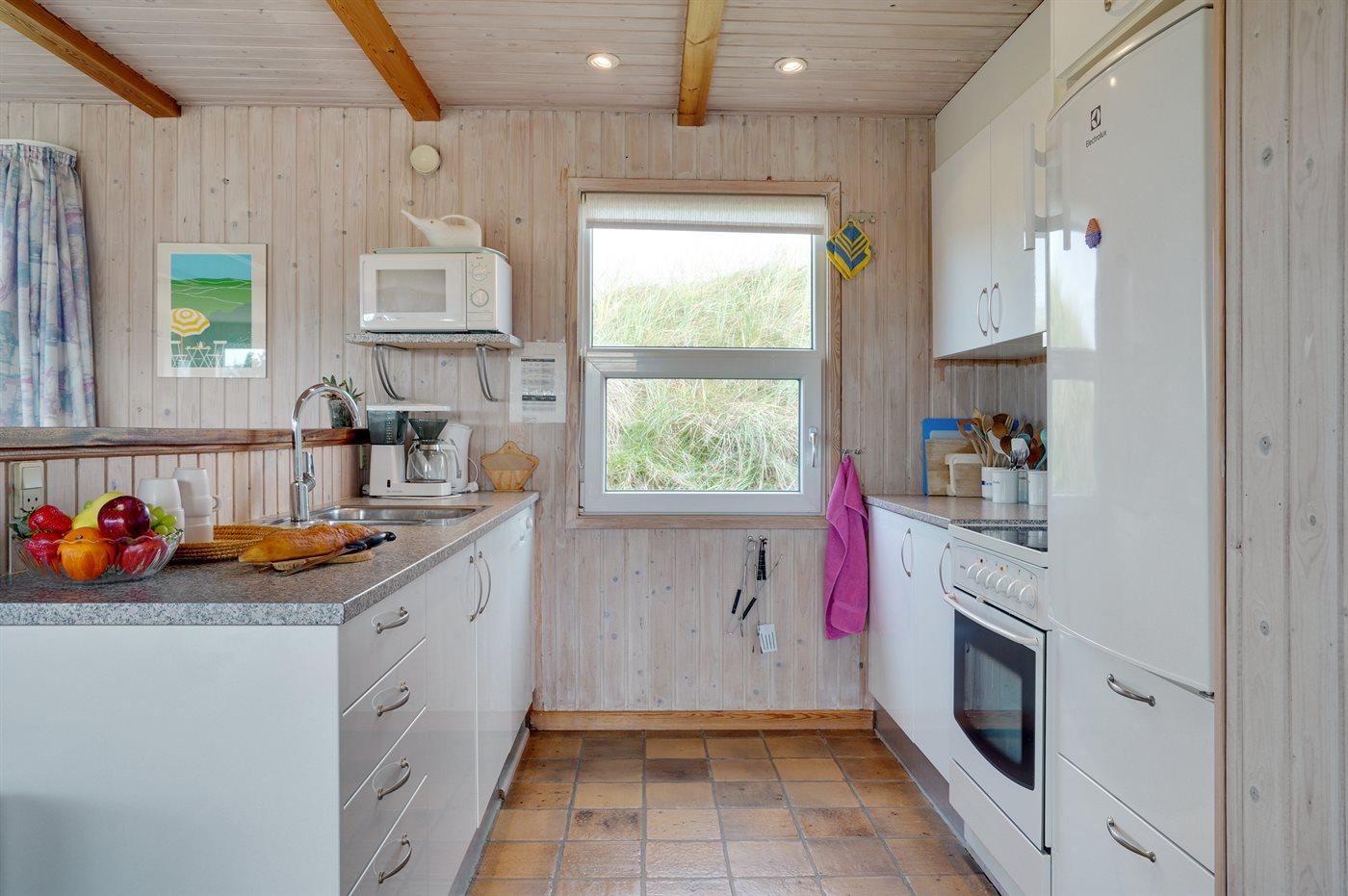 Køkkenet er udstyret med 1 køleskab. Der er 4 keramiske kogeplader, varmluftovn, mikrobølgeovn samt opvaskemaskine.