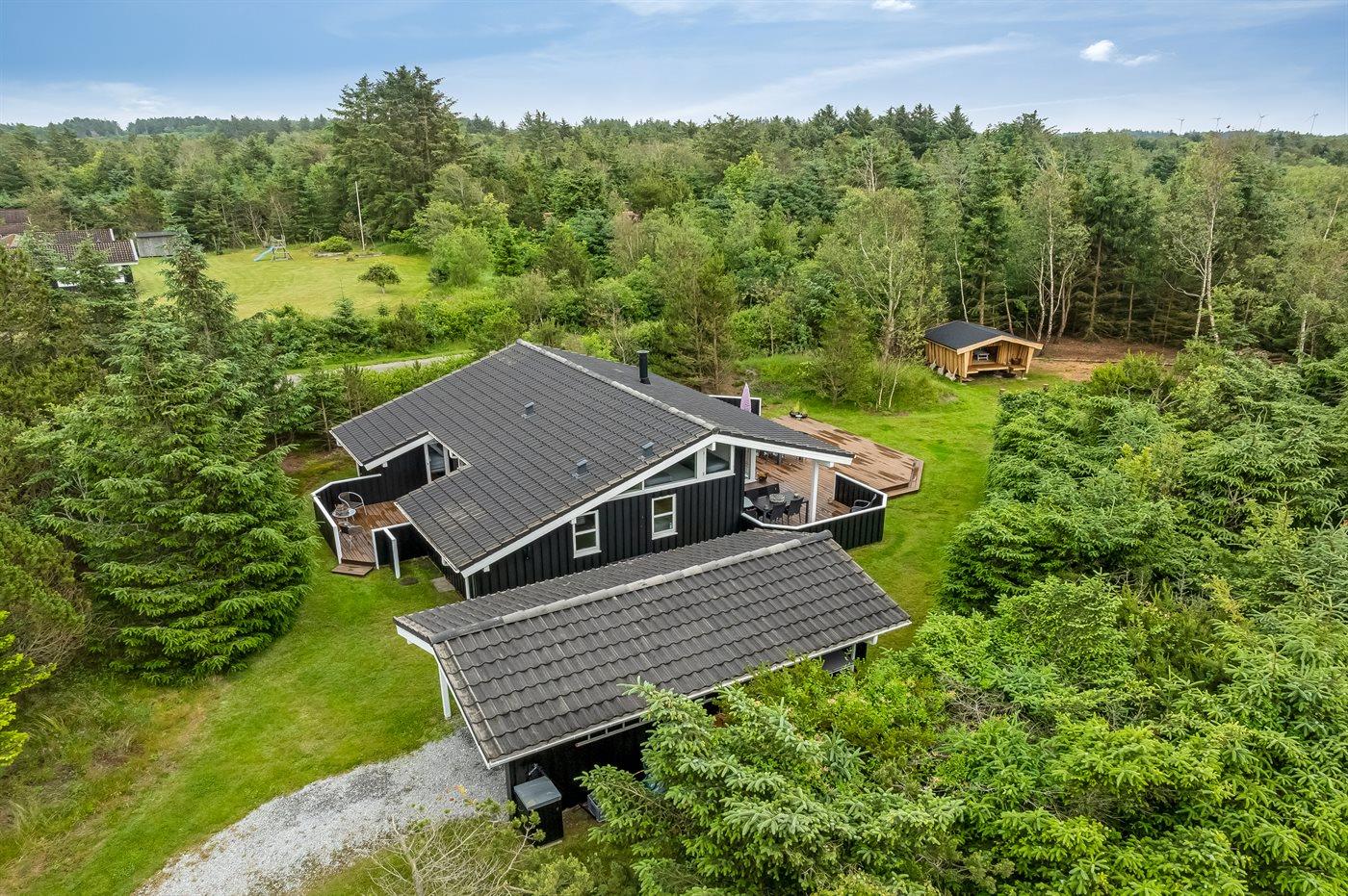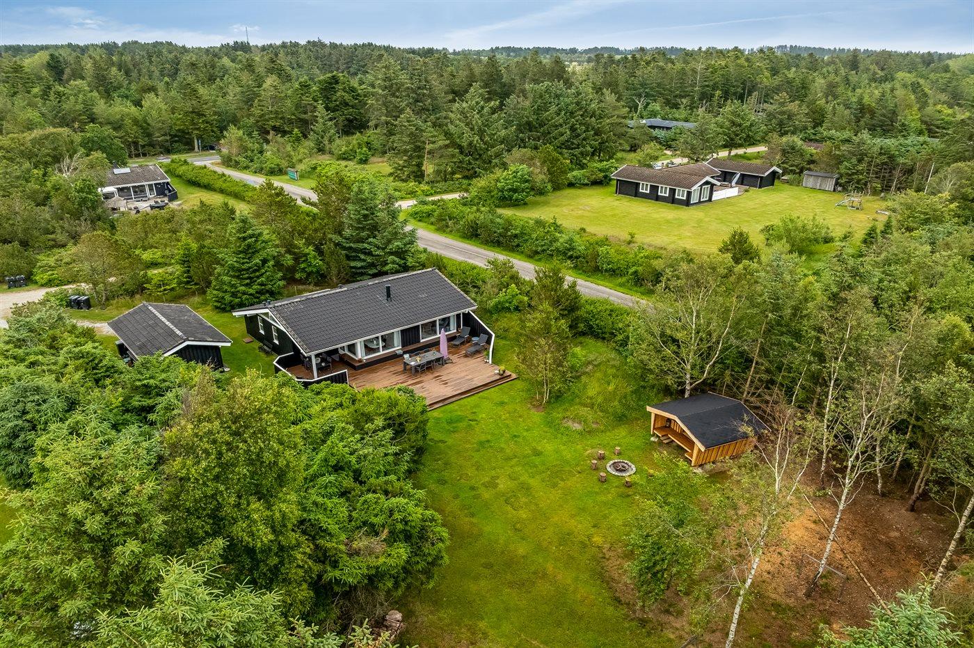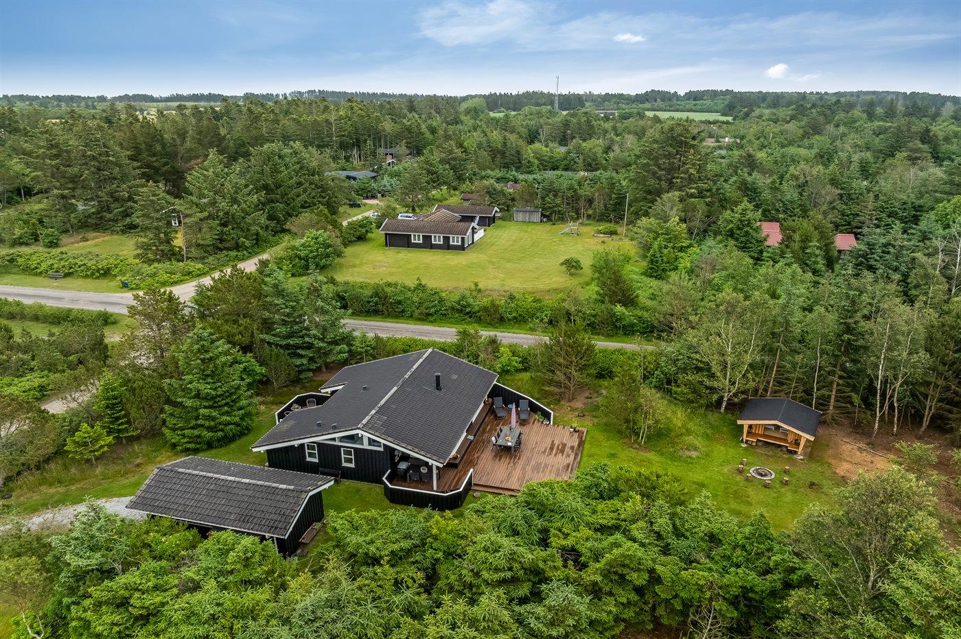 Ferieboligen er beliggende på en 1836 m² stor naturgrund. Der er 2000 m til havet. Nærmeste forretning er beliggende i en afstand af 3000 m. Der er en golfbane i en afstand af 12000 m. Til ferieboligen hører åbent terrasseareal. Desuden er der overdækket terrasse. Der er redskabsrum. Gynge. Fodboldmål. Bålsted. Shelter. Grill til rådighed. Parkering ved ferieboligen.