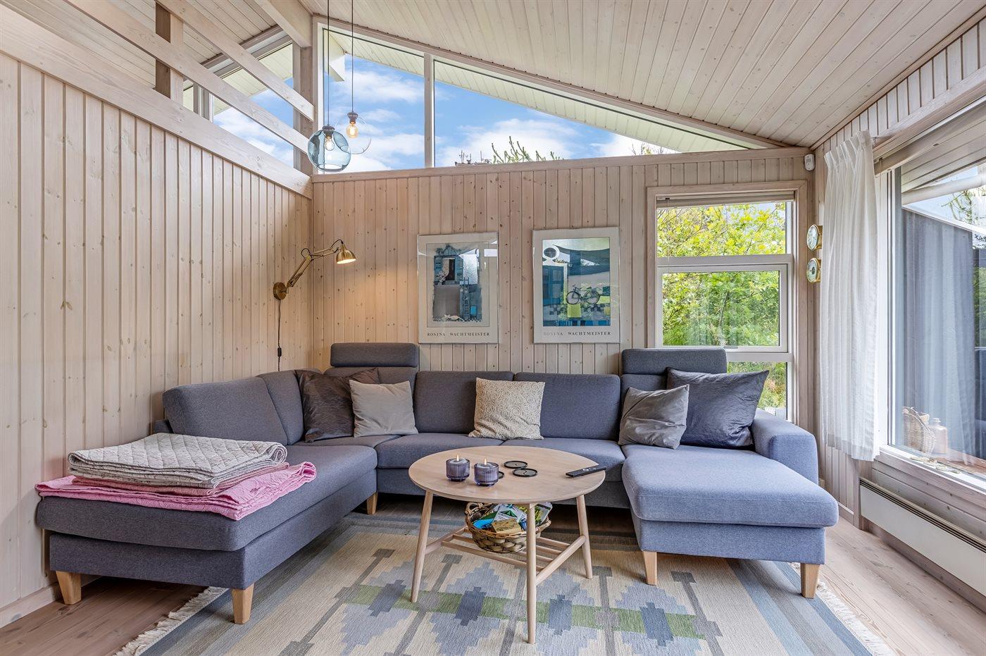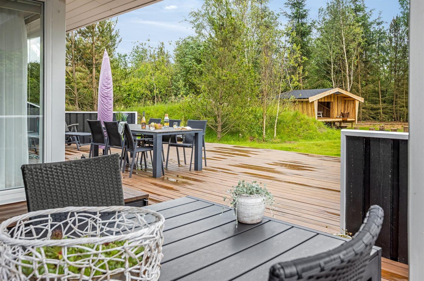 Huset ligger på en naturgrund med solgård og fint terrasseareal, hvor der er mulighed for at sidde i læ for vinden. Fra stuen med spiseafdeling er der adgang til den overdækkede terrasse. Sommerhuset har et dejligt badeværelse med bruseniche, gulvvarme, 2-pers. spa og direkte adgang til husets sauna.