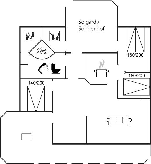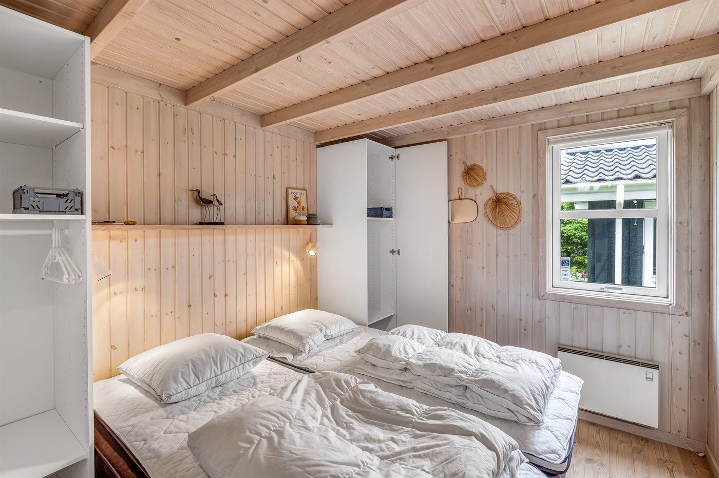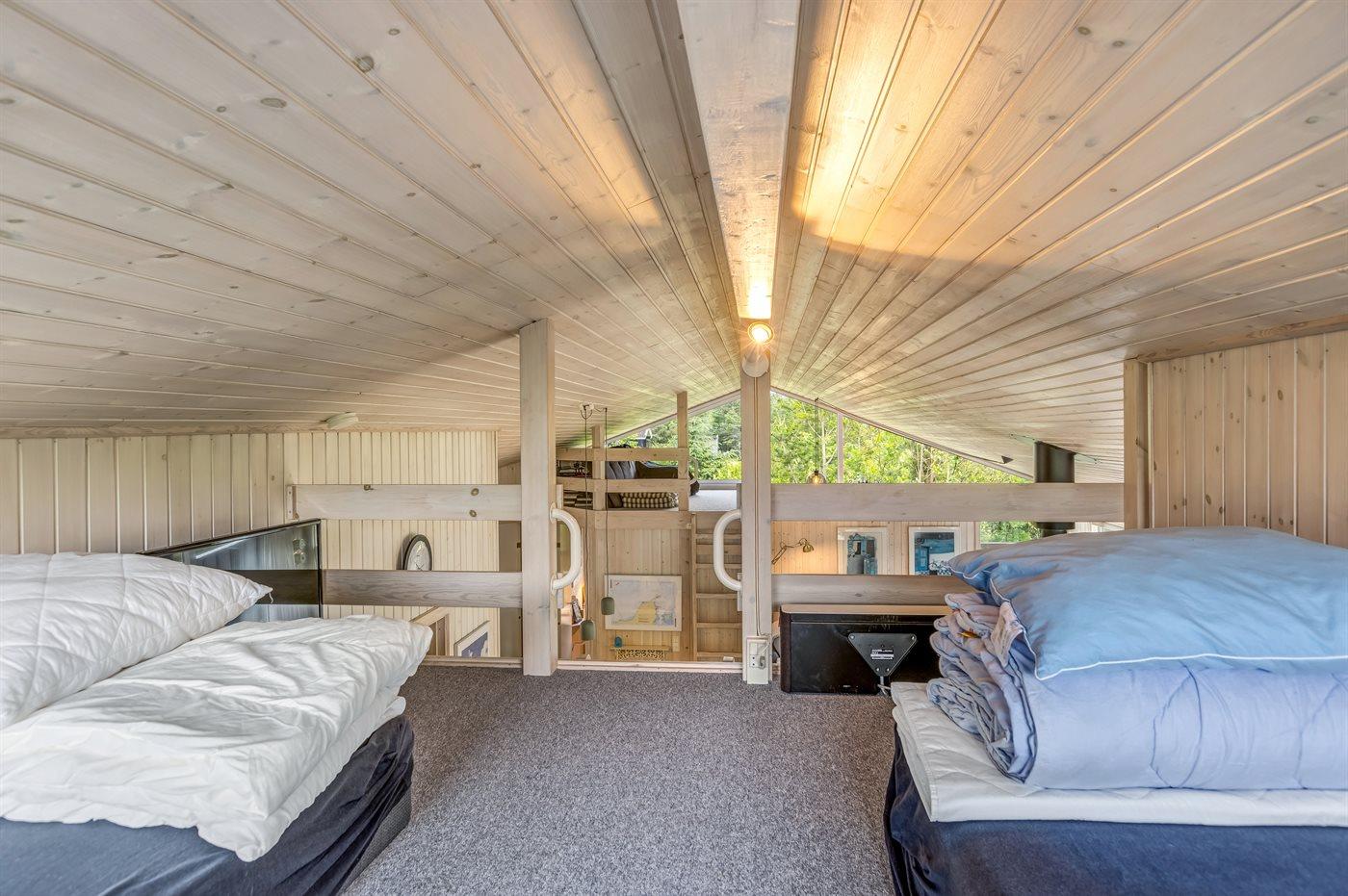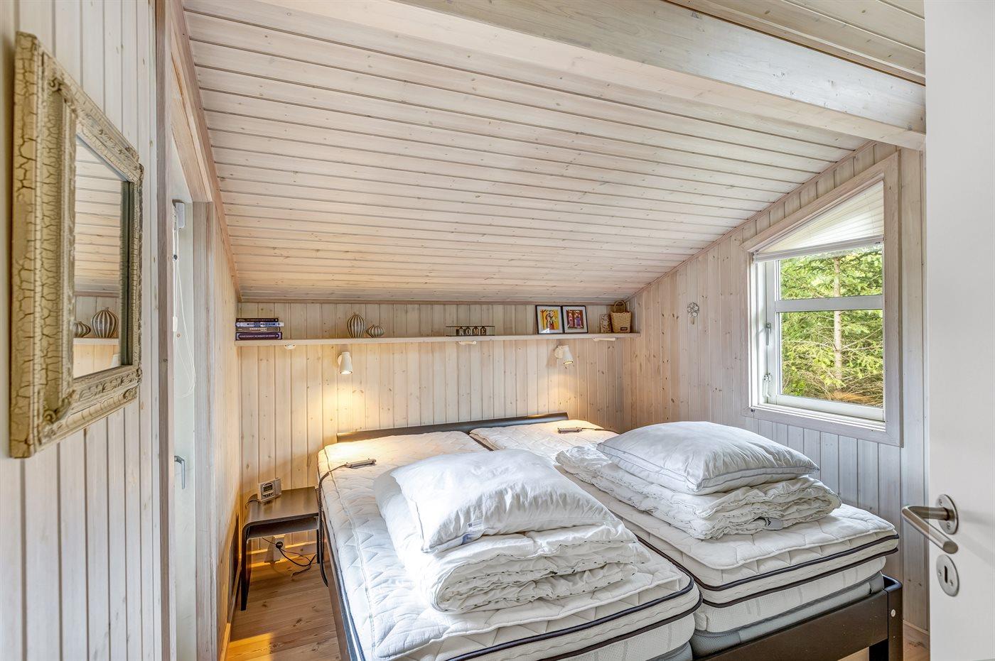 Der er i alt 3 soveværelser. Sovepladserne fordeler sig på: 4 sovepladser i dobbeltsenge. 2 sovepladser i enkeltsenge. 2 sovepladser i sovesofa (enkelt). 2 af disse sovepladser befinder sig på husets hems. Derudover er der 1 stk. barneseng.