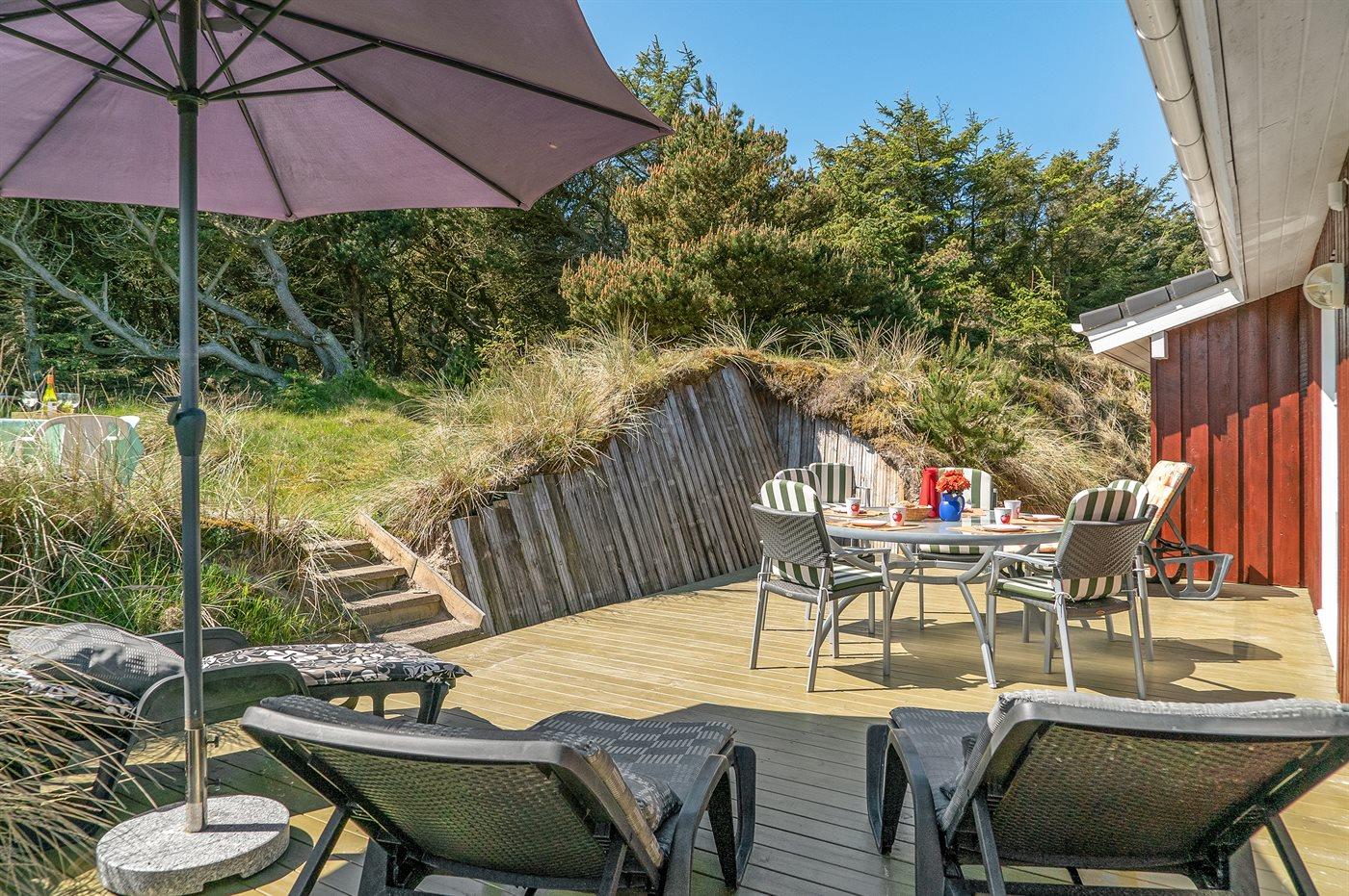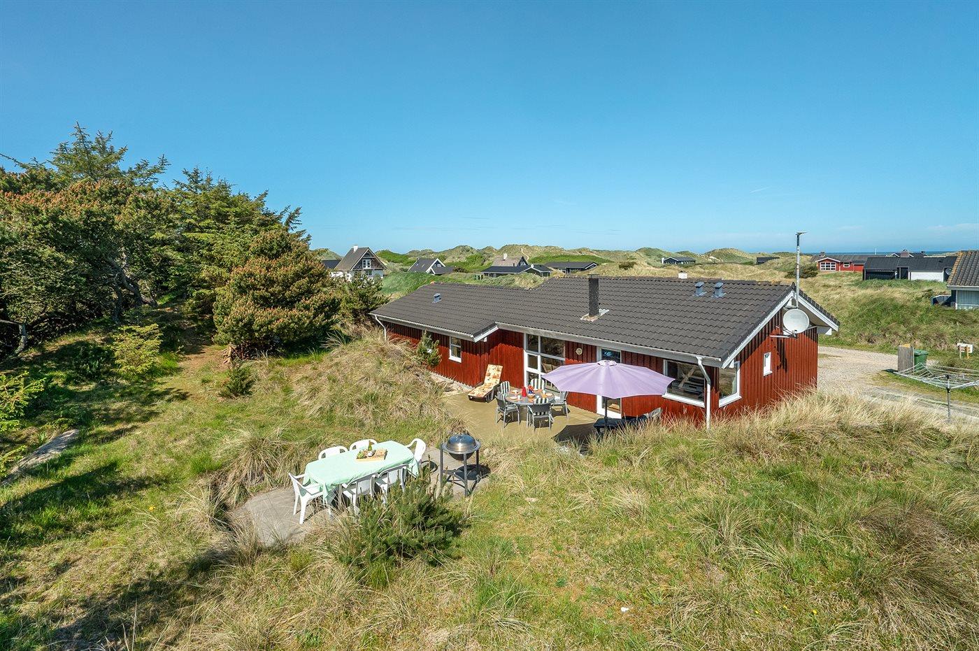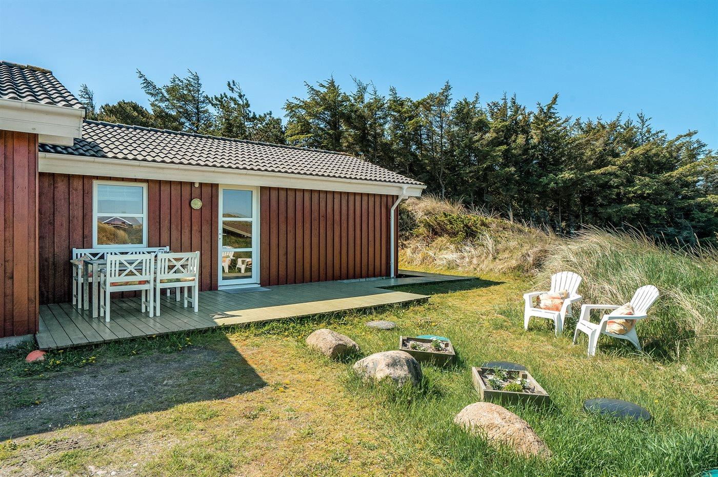 Pragtfuldt beliggende sommerhus i træ, opført i 2002, på en kuperet klitgrund - kun 200 m fra den brede sandstrand ved Saltum. Fra toppen af grunden er der en flot udsigt over området med Vesterhavet i baggrunden. Til huset hører åbne syd- og vestvendte terrasser med havemøbler.