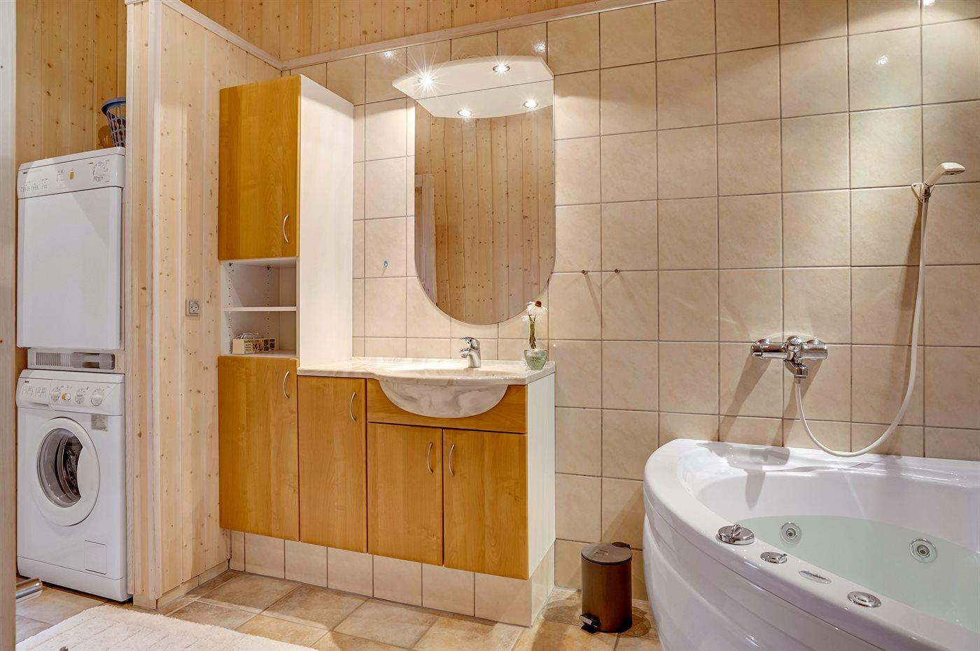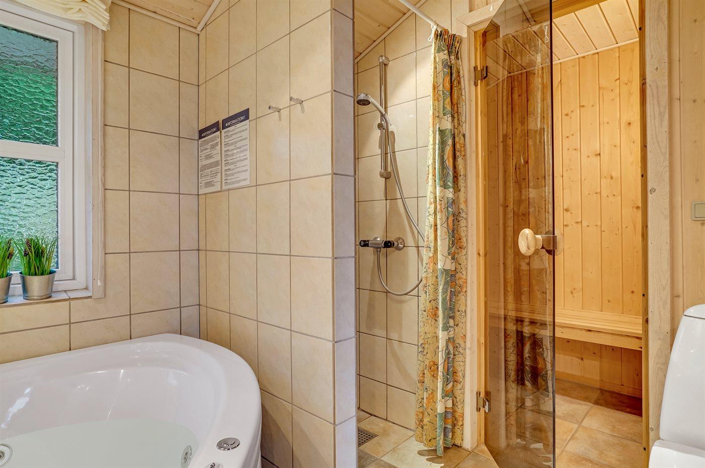 Sovepladserne fordeler sig på 2 soveværelser med dobbeltseng, 1 soveværelse med 2 enkeltsenge samt 2 sovepladser på madrasser på husets hems. Huset har 2 badeværelser med bruseniche og gulvvarme. Det ene er desuden udstyret med 2-pers. spa, vaskemaskine, tørretumbler og direkte adgang til husets sauna.