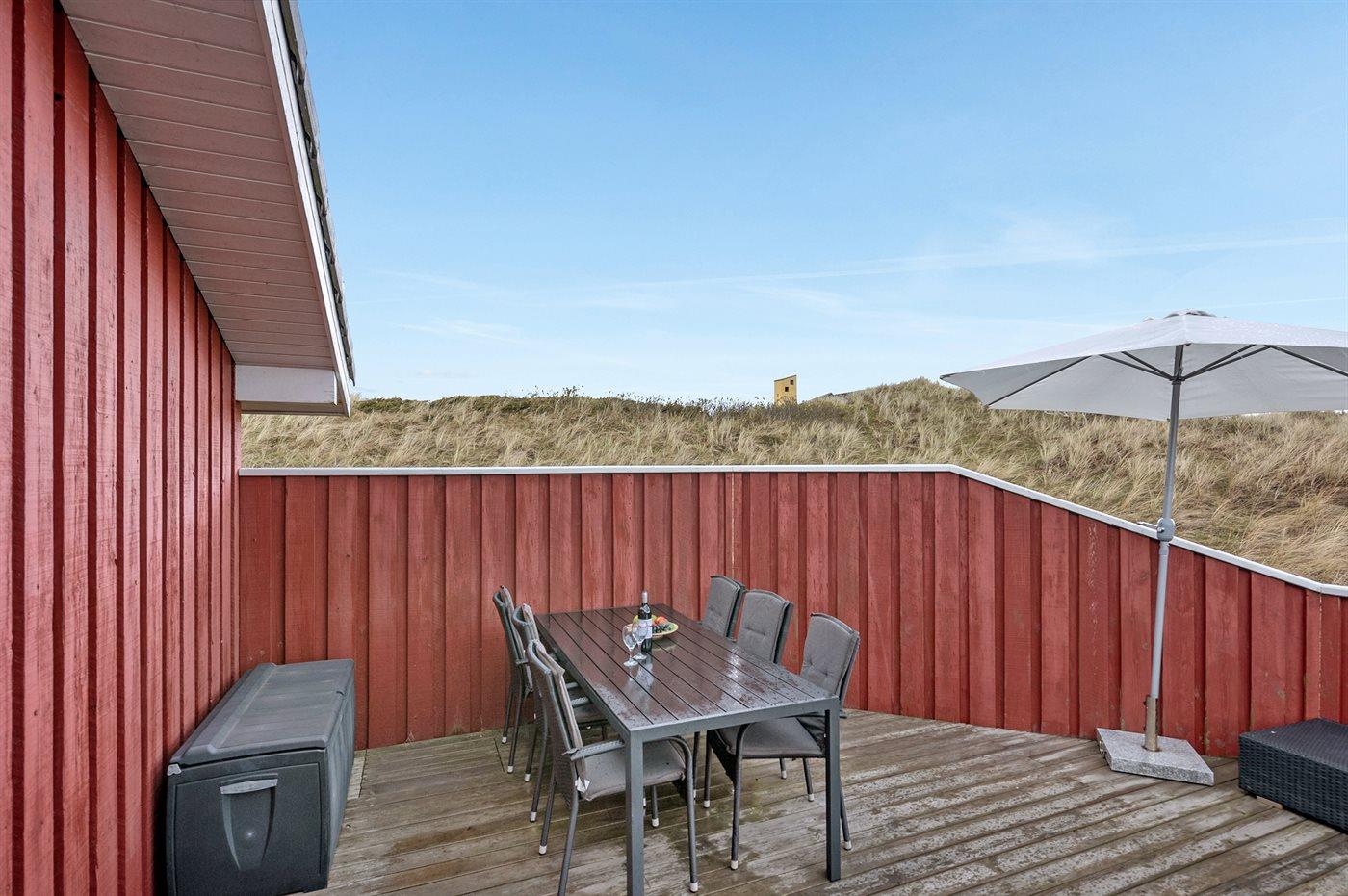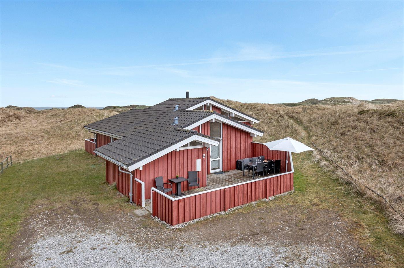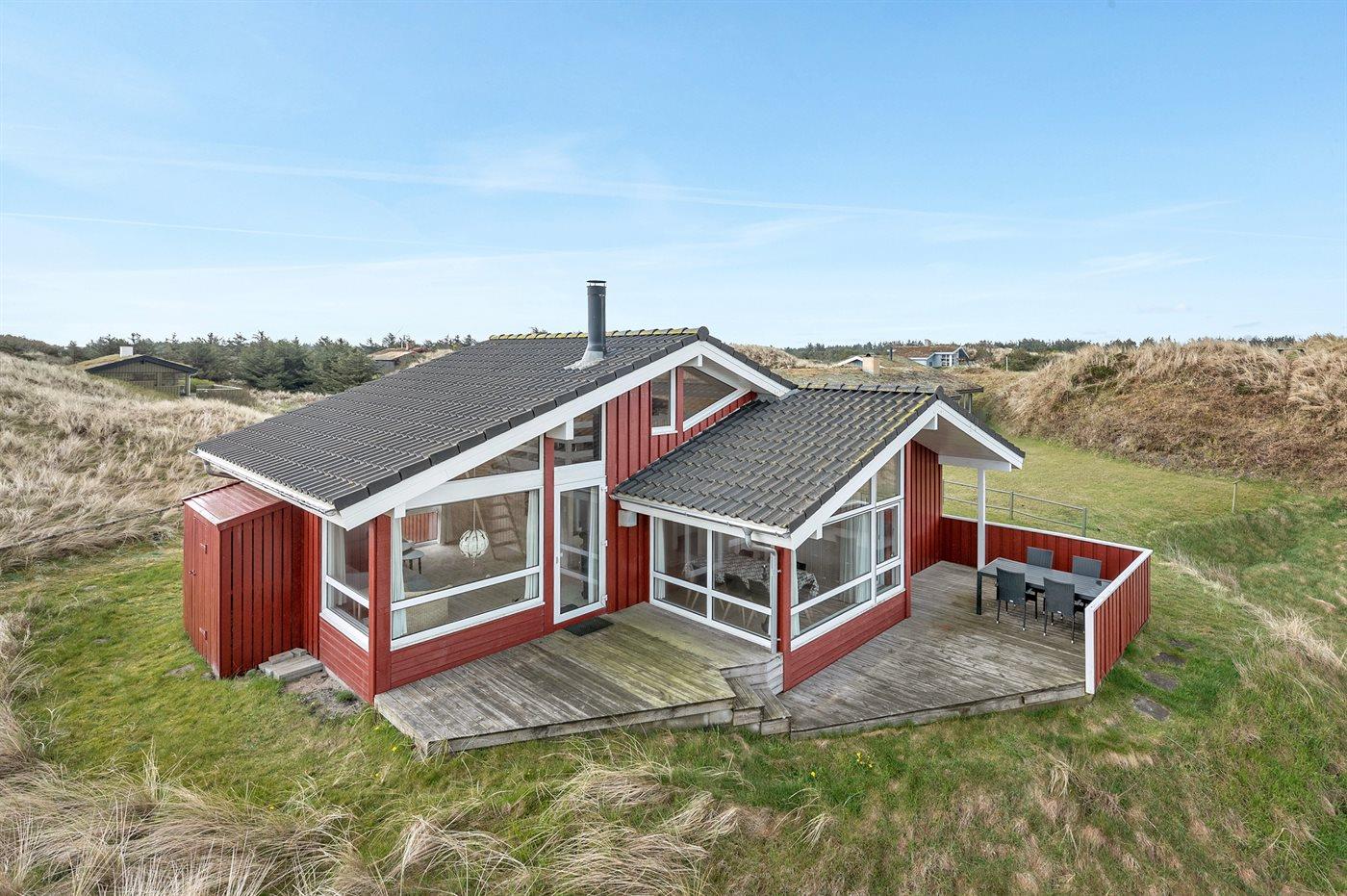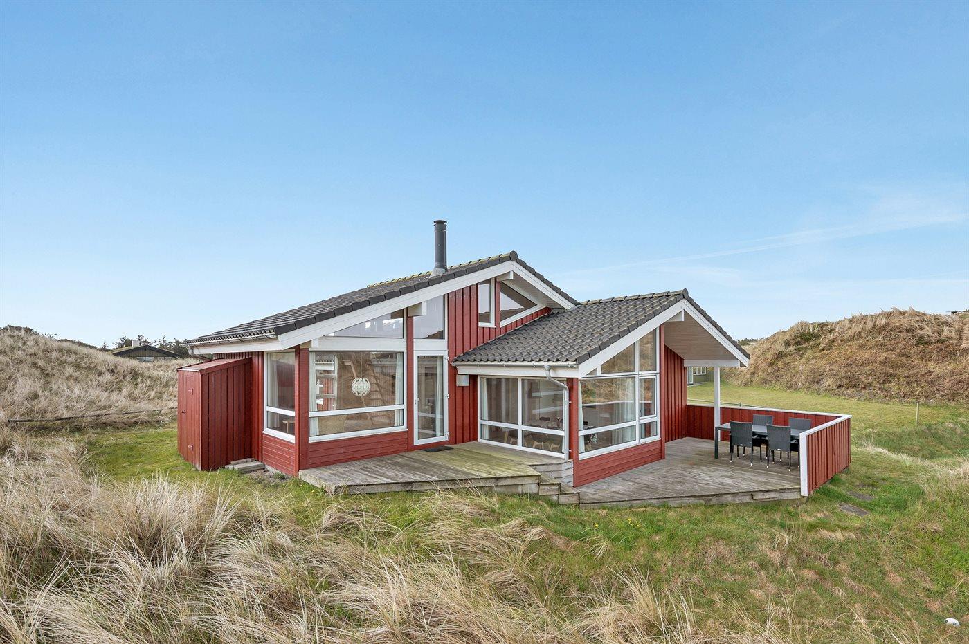 Virkelig flot og indbydende sommerhus beliggende for enden af blind vej på en stor og kuperet grund nær én af Danmarks bedste badestrande. Fra opholdsstuen på hemsen er der en flot udsigt over de lyngklædte klitter med Vesterhavet i baggrunden. Stort fredet område foran huset. Huset er indrettet med 2 flot møblerede opholdsstuer, én i forskudt plan og én på udsigtshems.