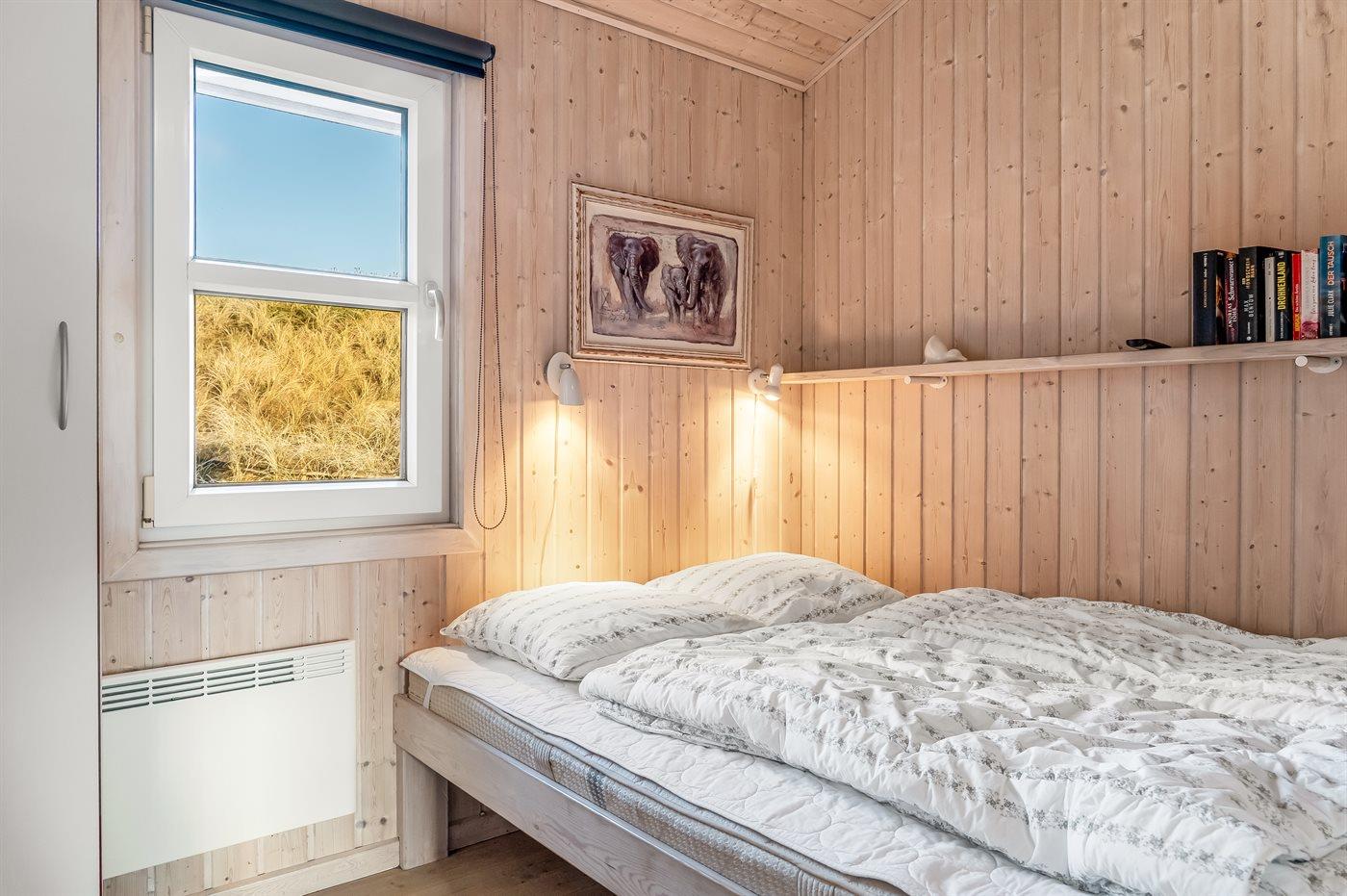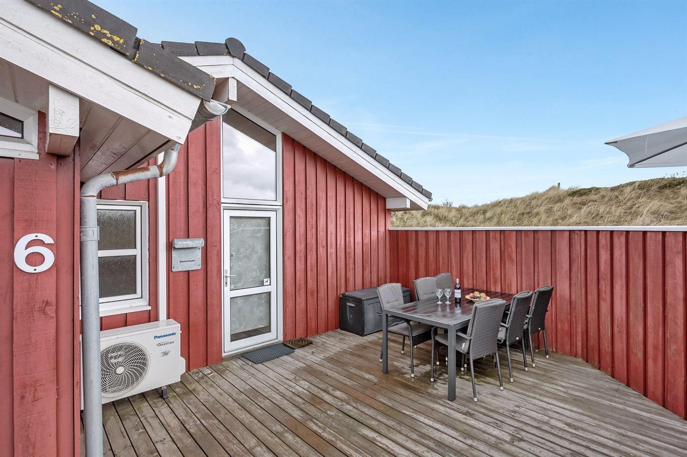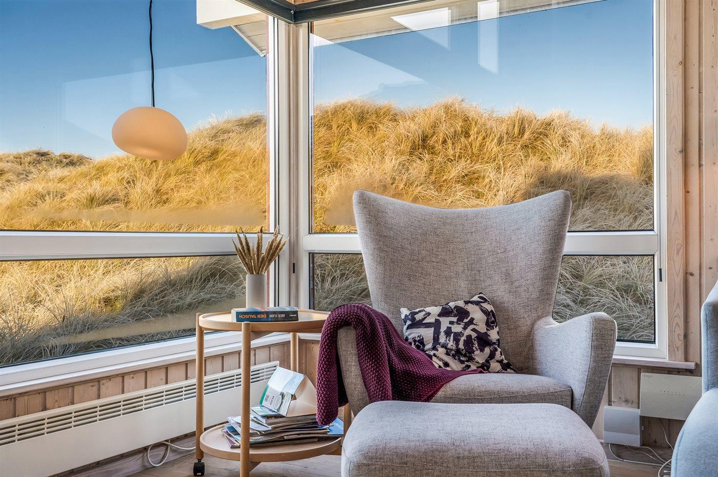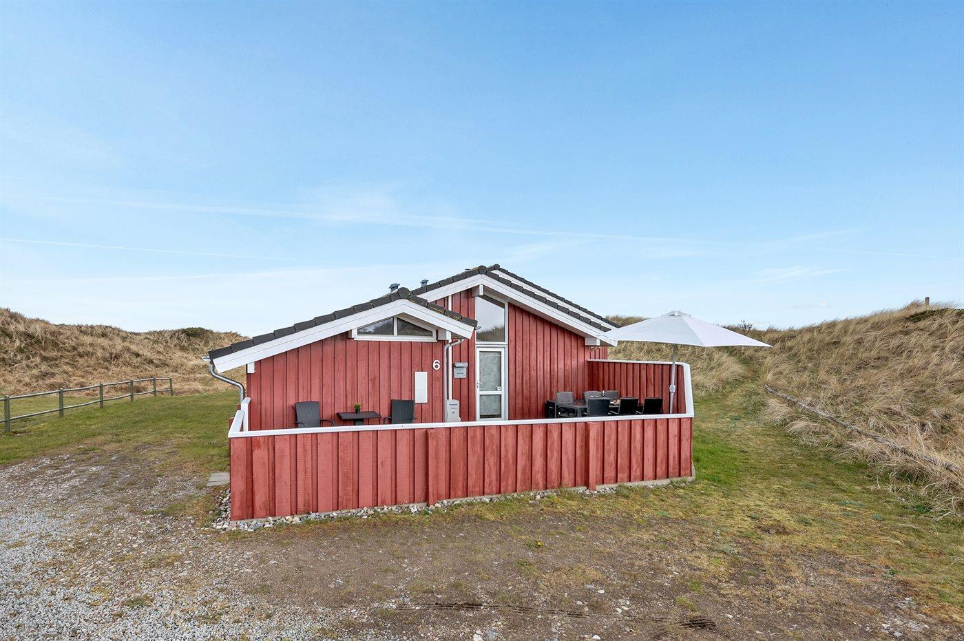 Virkelig flot og indbydende sommerhus beliggende for enden af blind vej på en stor og kuperet grund nær én af Danmarks bedste badestrande. Fra opholdsstuen på hemsen er der en flot udsigt over de lyngklædte klitter med Vesterhavet i baggrunden. Stort fredet område foran huset. Huset er indrettet med 2 flot møblerede opholdsstuer, én i forskudt plan og én på udsigtshems.