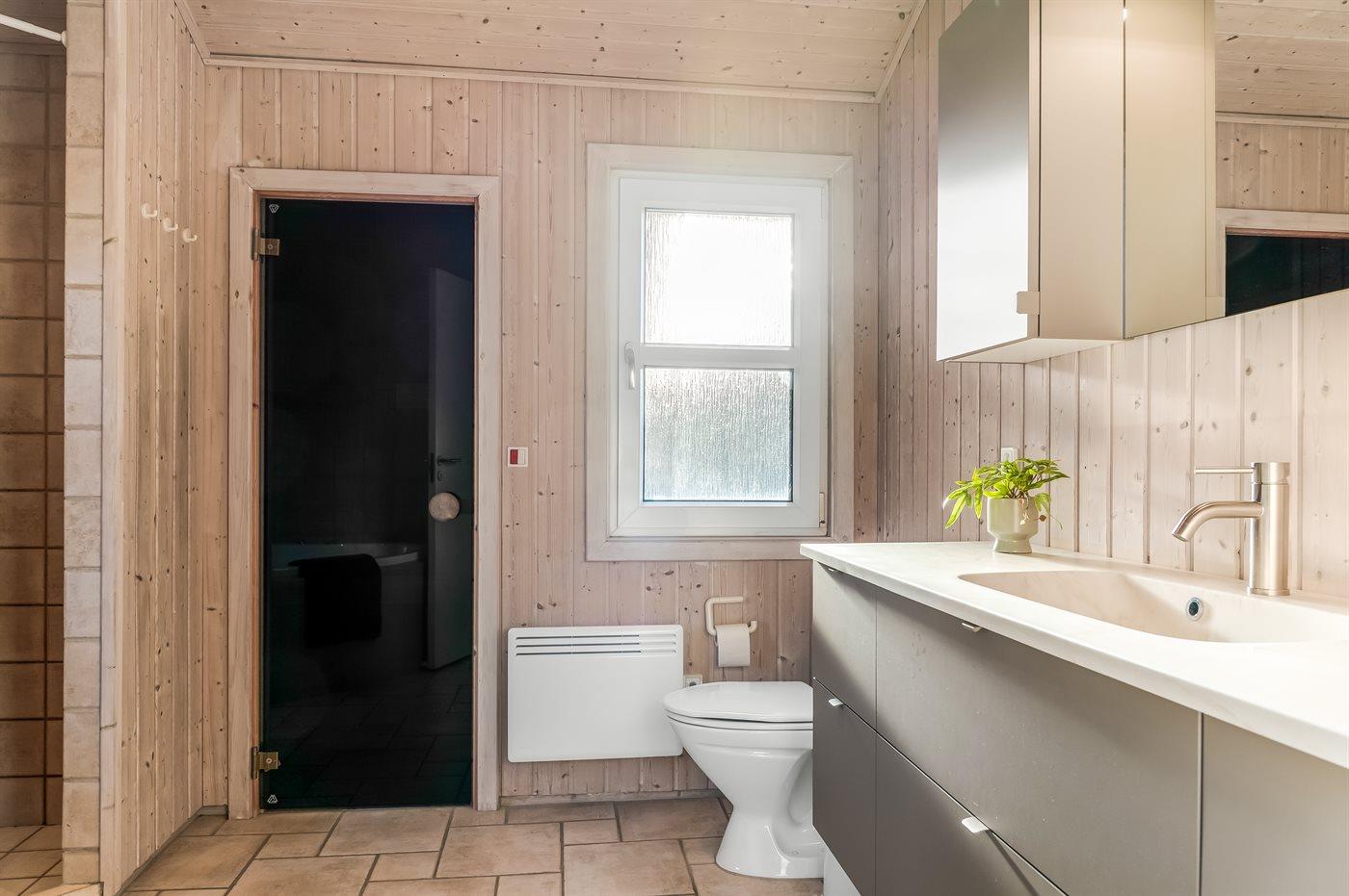 Der er 2 badeværelser med bruseniche og 2 toiletter. Der er gulvvarme på 2 badeværelser. I saunaen er der mulighed for afslapning.