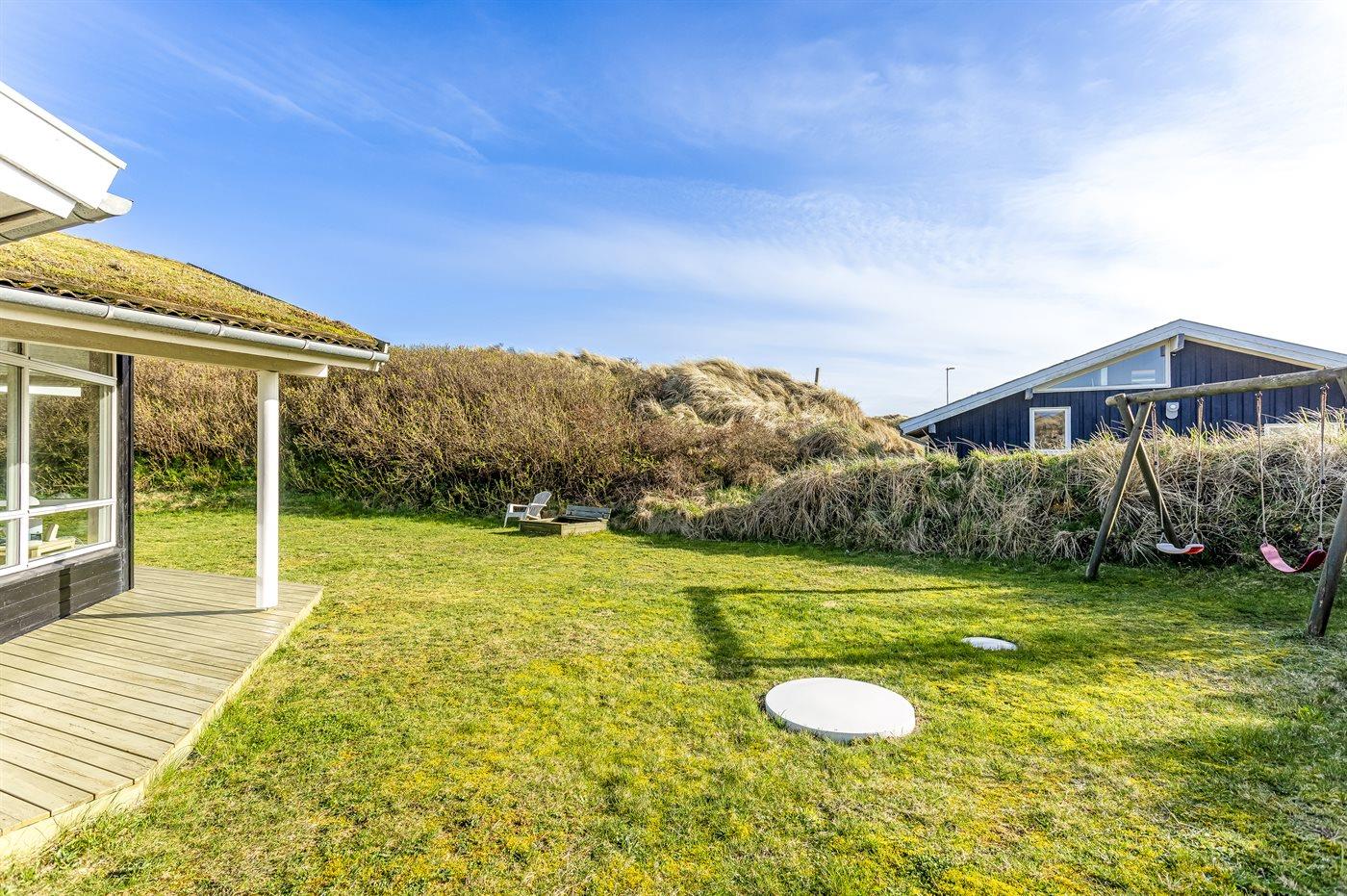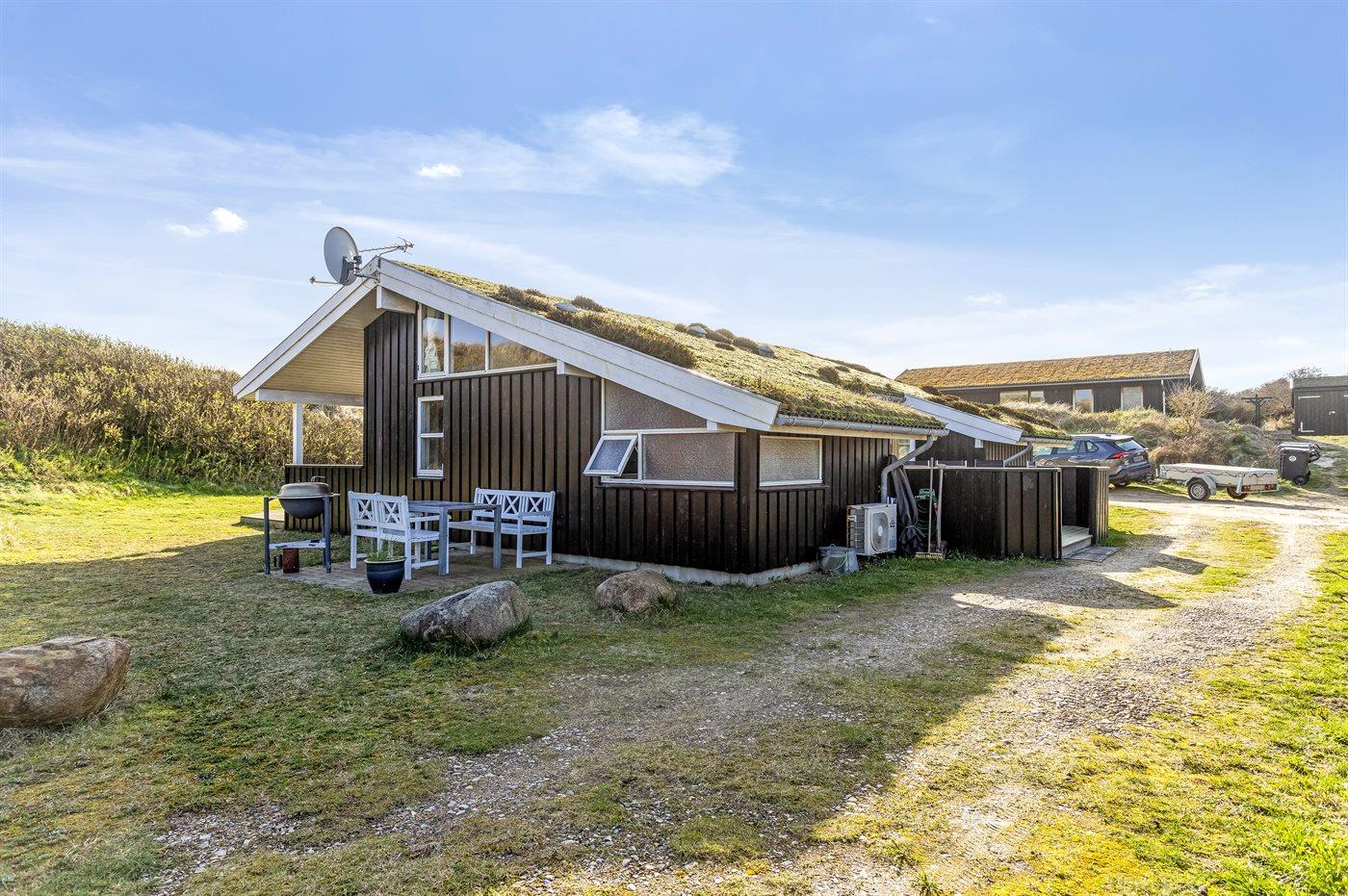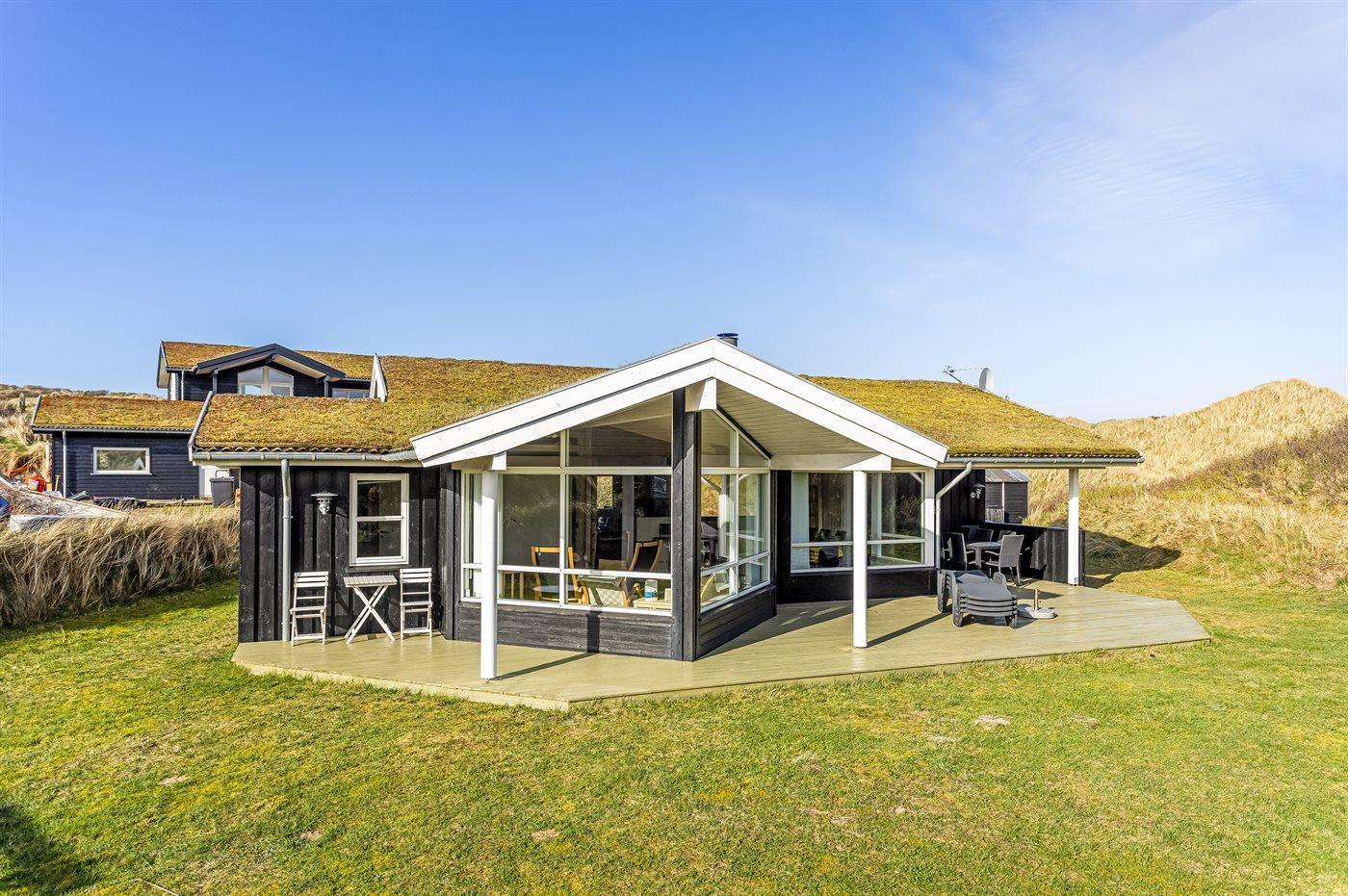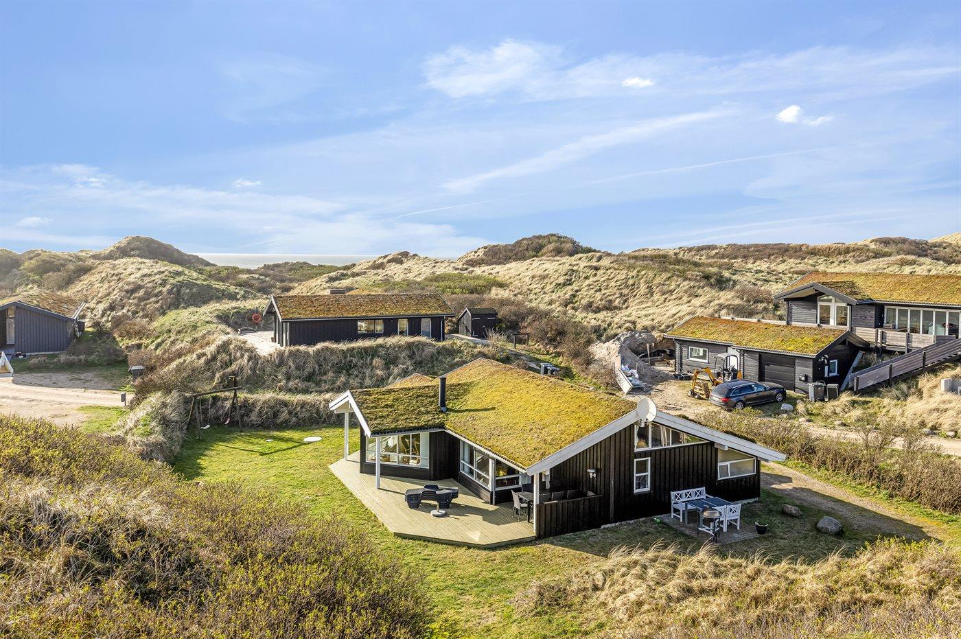 Et skønt sommerhus i træ, opført 2006, beliggende på en dejlig natur- og klitgrund, kun 100 m fra en af Danmarks bedste badestrande. Fra grundens højeste punkt er der en flot udsigt over området og Vesterhavet. Såvel åben som overdækket terrasse.