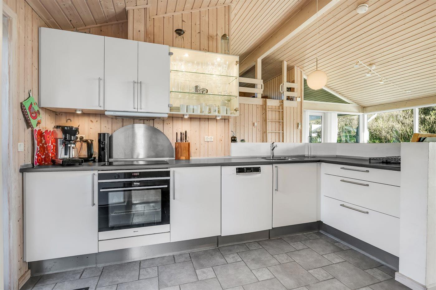 Moderne køkken med opvaskemaskine, fryser, mikrobølgeovn samt komfur med keramiske kogeplader og varmluftovn. I opholdsstuen er der brændeovn, fladskærms-TV med parabol (digital) og surroundsystem, Chromecast, DVD-afspiller og stereoanlæg med CD-afspiller.