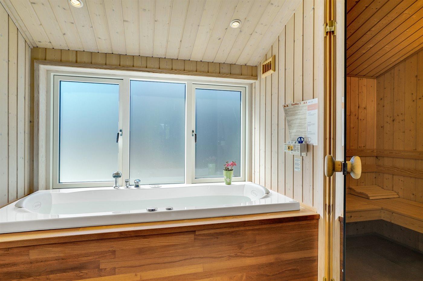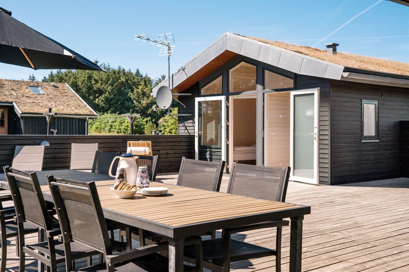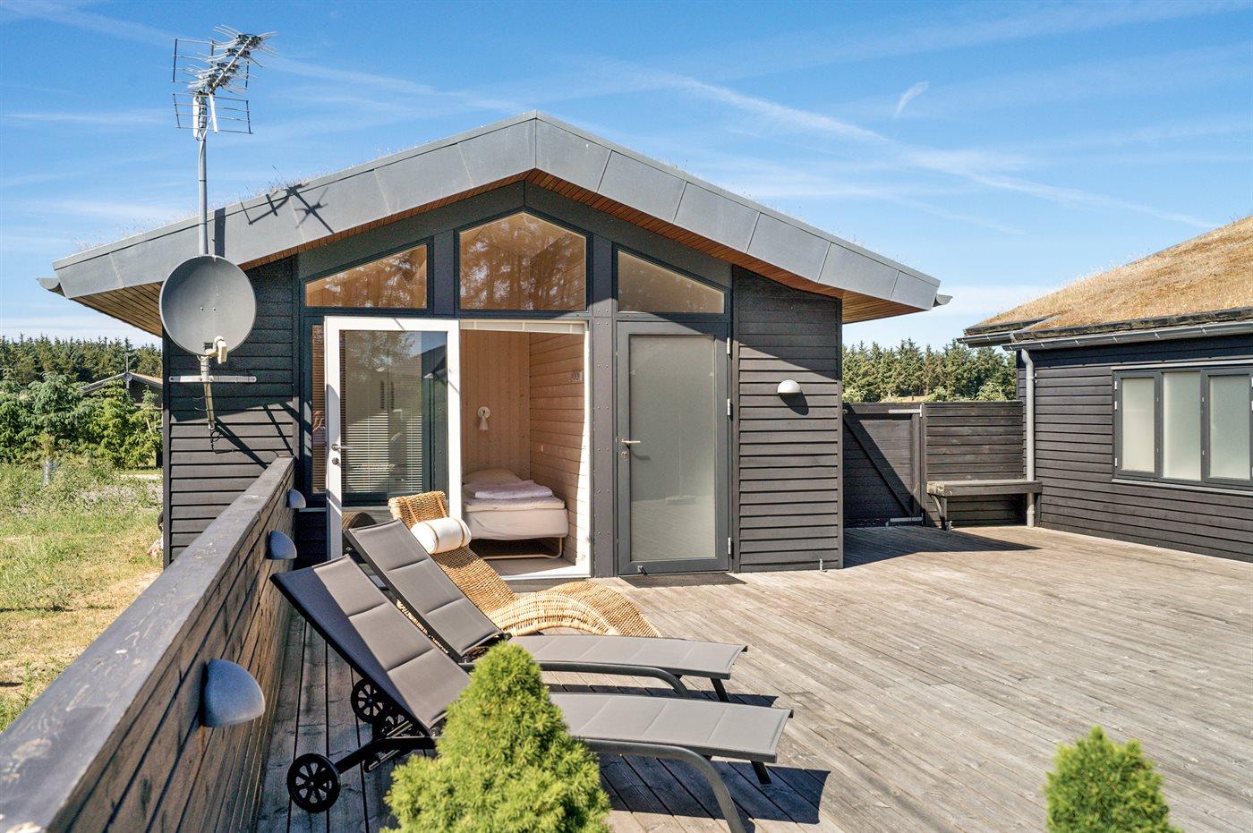 Luksuriøst træsommerhus med spa, sauna og stort terrasseområde nær Vesterhavet.