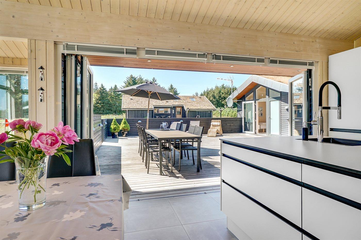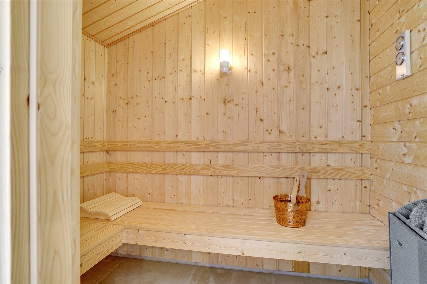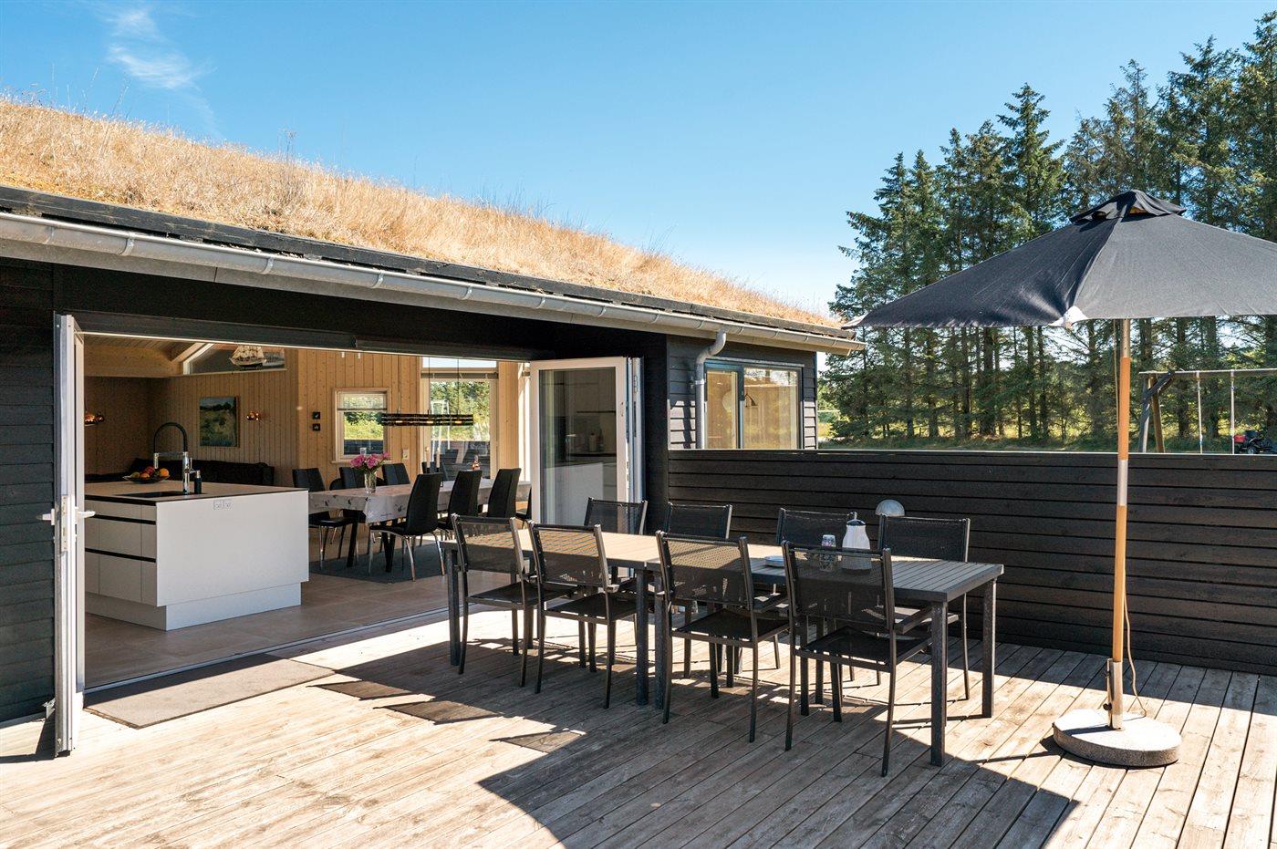 Stort, luksuriøst udstyret sommerhus i træ fra 2009 med spa og sauna. Huset, der er opført på en naturgrund, er omgivet af et meget stort terrasseareal, hvoraf en del er overdækket. Indvendigt er gulvene belagt med klinker, dog er der trægulv i 2 soveværelser. Rummeligt badeværelse med 2-pers. spa, sauna, gulvvarme, bruseniche og håndklædetørrer. Det flotte køkken er udstyret med opvaskemaskine, mikrobølgeovn, varmluftovn, fryser og komfur med keramiske kogeplader. En stor foldedør fra køkkenets spiseafdeling og ud til den overdækkede terrasse gør det muligt at lukke naturen helt ind i huset. Den luksuriøst udstyrede stue indeholder brændeovn, TV med digital parabol og DVD-afspiller. Huset har 2 soveværelser med dobbeltseng og praktisk walk-in-closet samt 1 soveværelse med 2 enkeltsenge. Endvidere findes anneks med 1 soverum med 2 enkeltsenge, ekstra TV og Playstation1 samt badeværelse med bruseniche. I tilknytning til annekset er indrettet et aktivitetsrum med komb. bordfodbold/mini bordtennis/airhockey, motionscykel, romaskine og musikanlæg. Til husets udstyr hører endvidere barneseng, høj barnestol, vaskemaskine og tørretumbler. Et skønt sommerhus tæt ved Fårup Sommerland, Vesterhavet og skovområde.