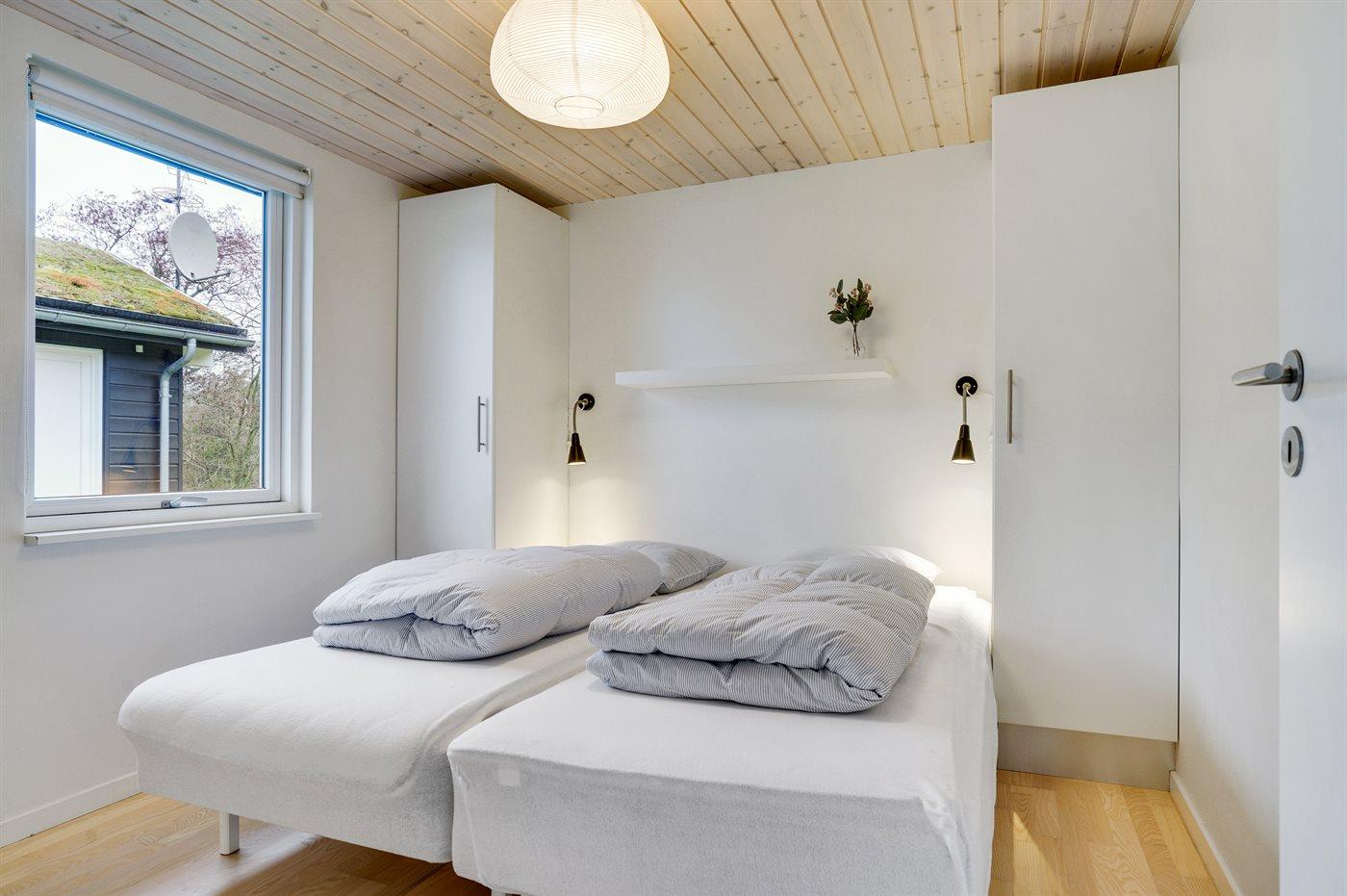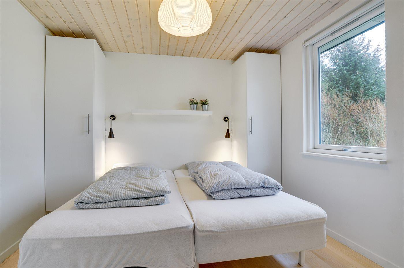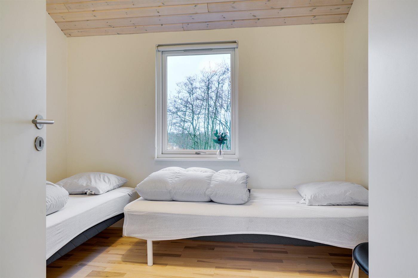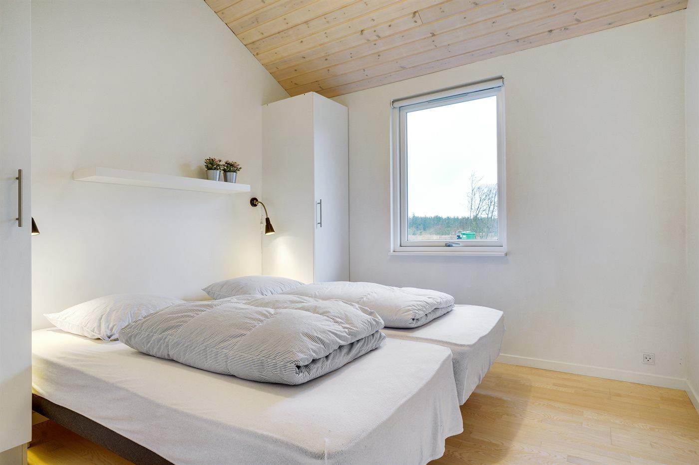 Der er i alt 4 soveværelser. Sovepladserne fordeler sig på: 6 sovepladser i dobbeltsenge. 2 sovepladser i enkeltsenge. 4 sovepladser på madrasser. 4 af disse sovepladser befinder sig på husets hems. Derudover er der 2 stk. barnesenge.