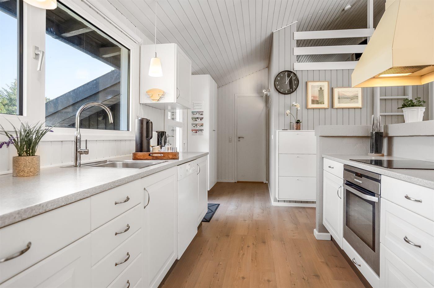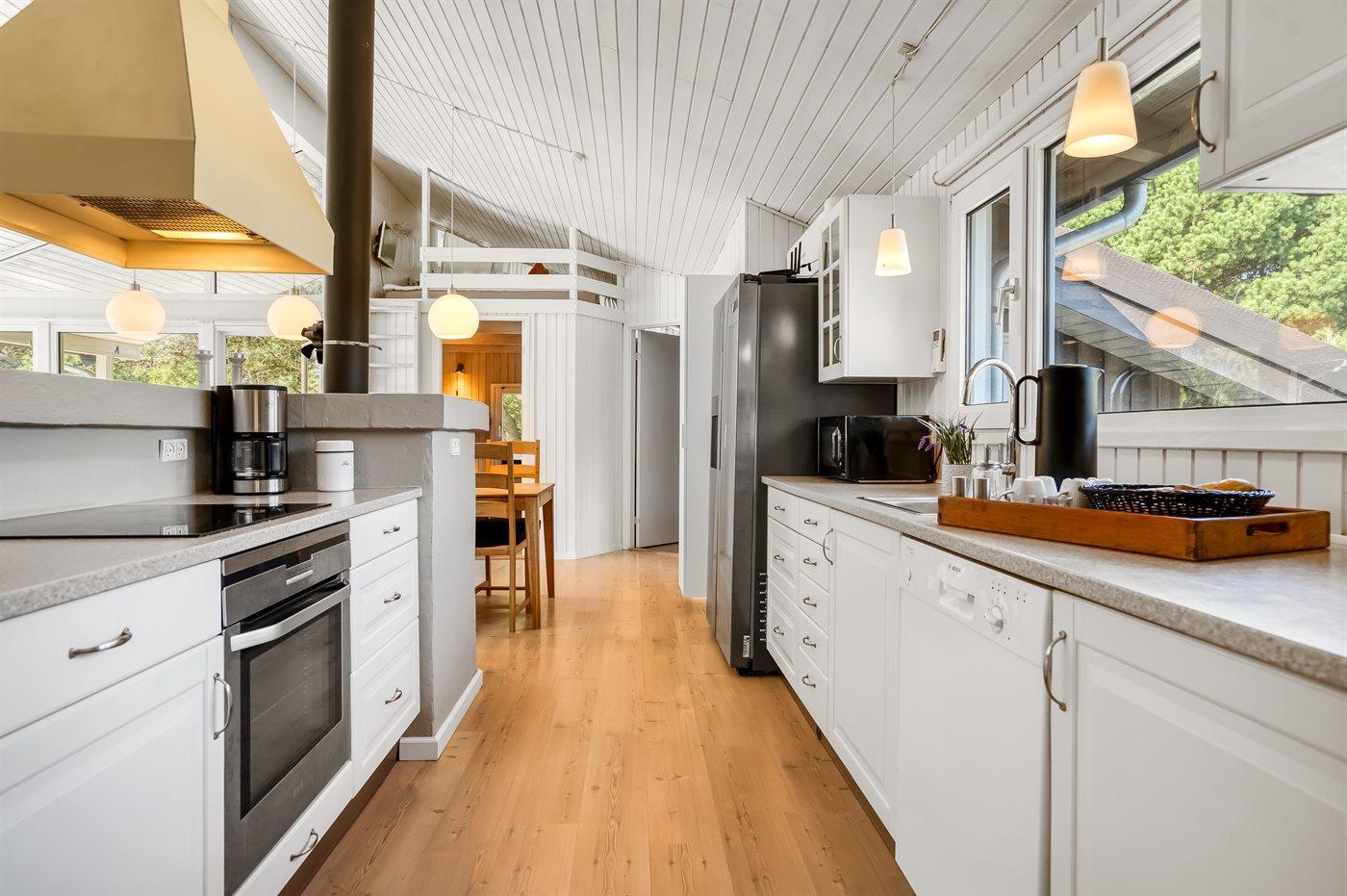 Køkkenet er udstyret med 1 amerikansk køleskab. Der er 4 elkogeplader, varmluftovn, mikrobølgeovn samt opvaskemaskine.