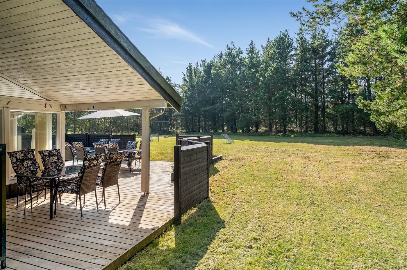 Ferieboligen er beliggende på en 2191 m² stor naturgrund. Der er 900 m til havet. Nærmeste forretning er beliggende i en afstand af 2500 m. Til ferieboligen hører åbent terrasseareal. Desuden er der overdækket terrasse. Gynge. Sandkasse. Fodboldmål. Parkering ved ferieboligen.