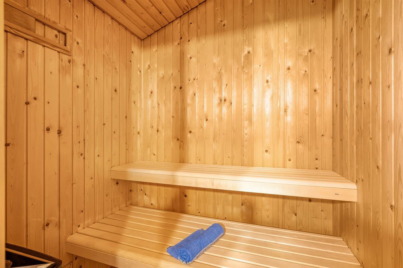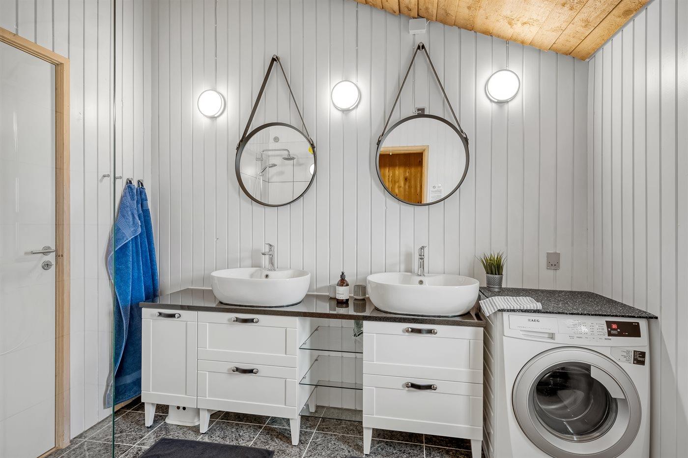 Der er 2 badeværelser. Det ene med bruseniche og det andet med spabad og tilhørende bruser. 2 toiletter. Der er gulvvarme på 2 badeværelser. I saunaen er der mulighed for afslapning.