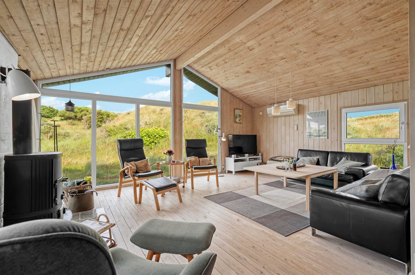 Fantastisk beliggende sommerhus i første klitrække til Vesterhavet og skøn badestrand, på en meget stor og kuperet grund, hvor der fra grunden er udsigt til havet.