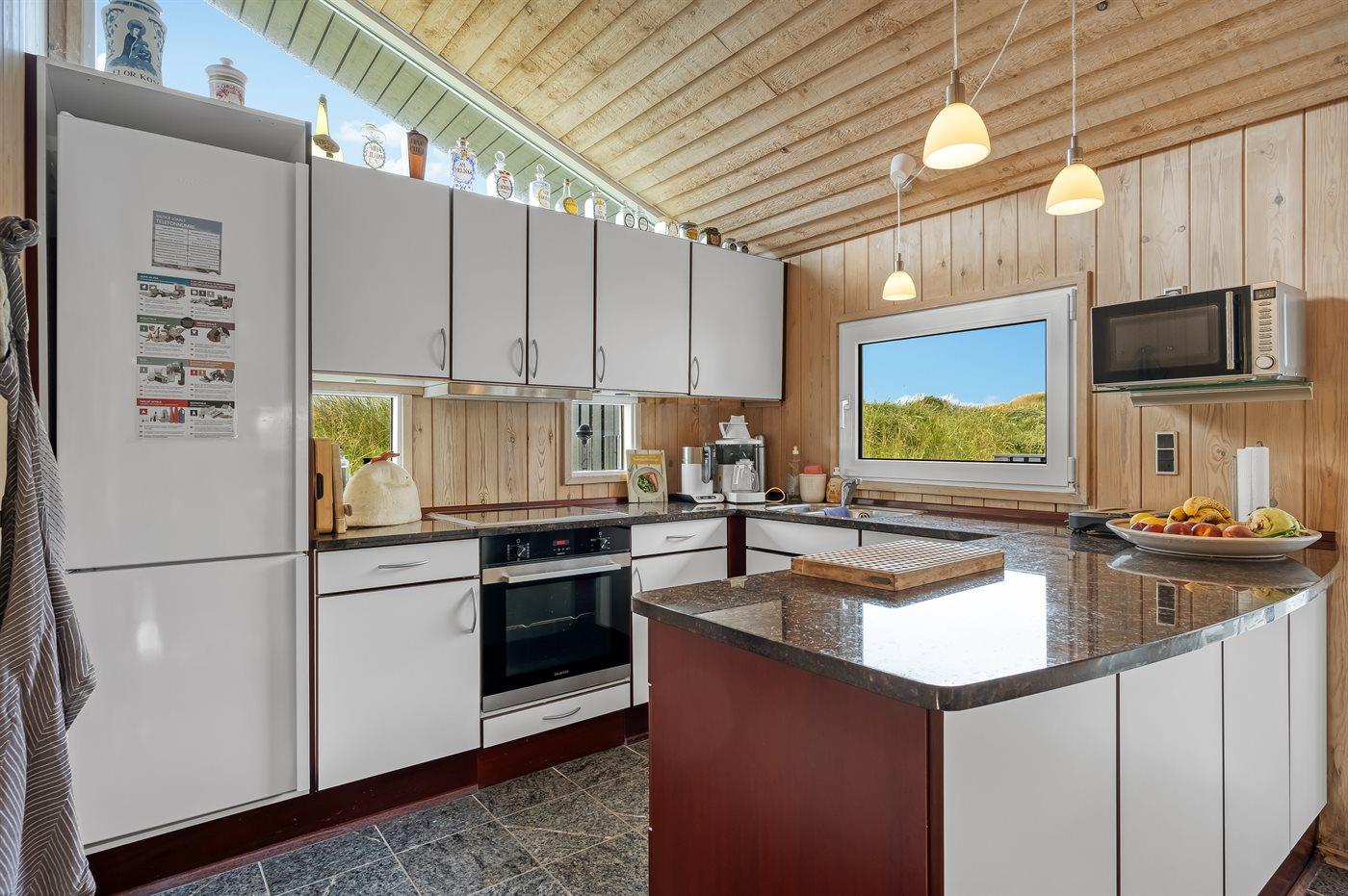 Køkkenet er udstyret med 1 køleskab. Der er 4 keramiske kogeplader, varmluftovn, mikrobølgeovn samt opvaskemaskine Der er gulvvarme i køkkenet.