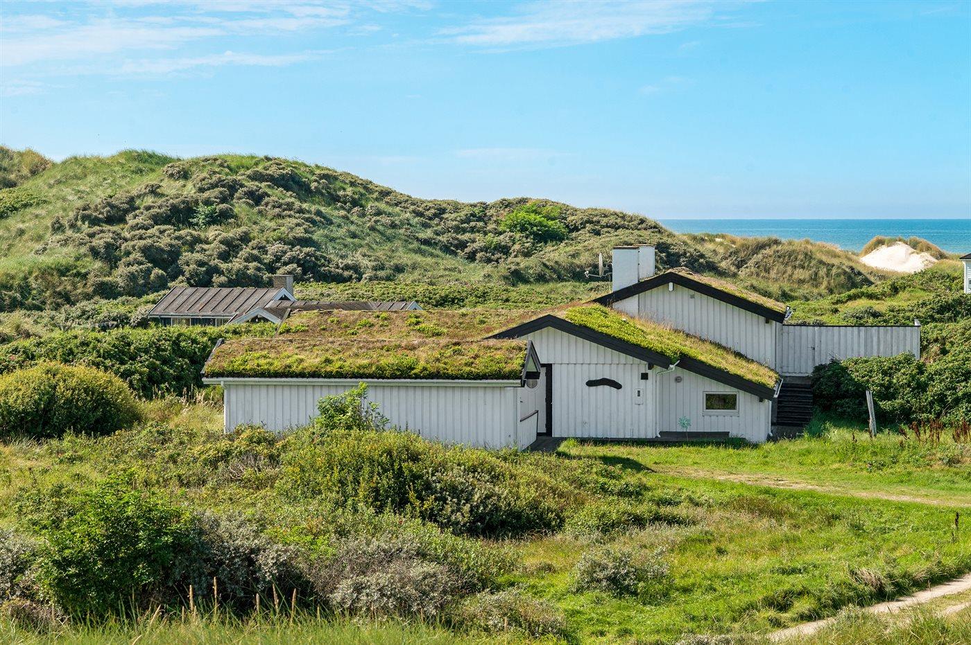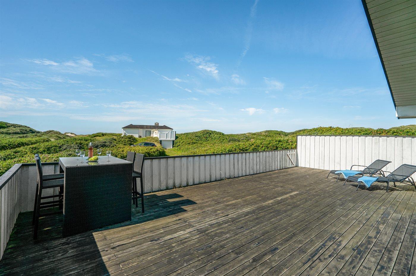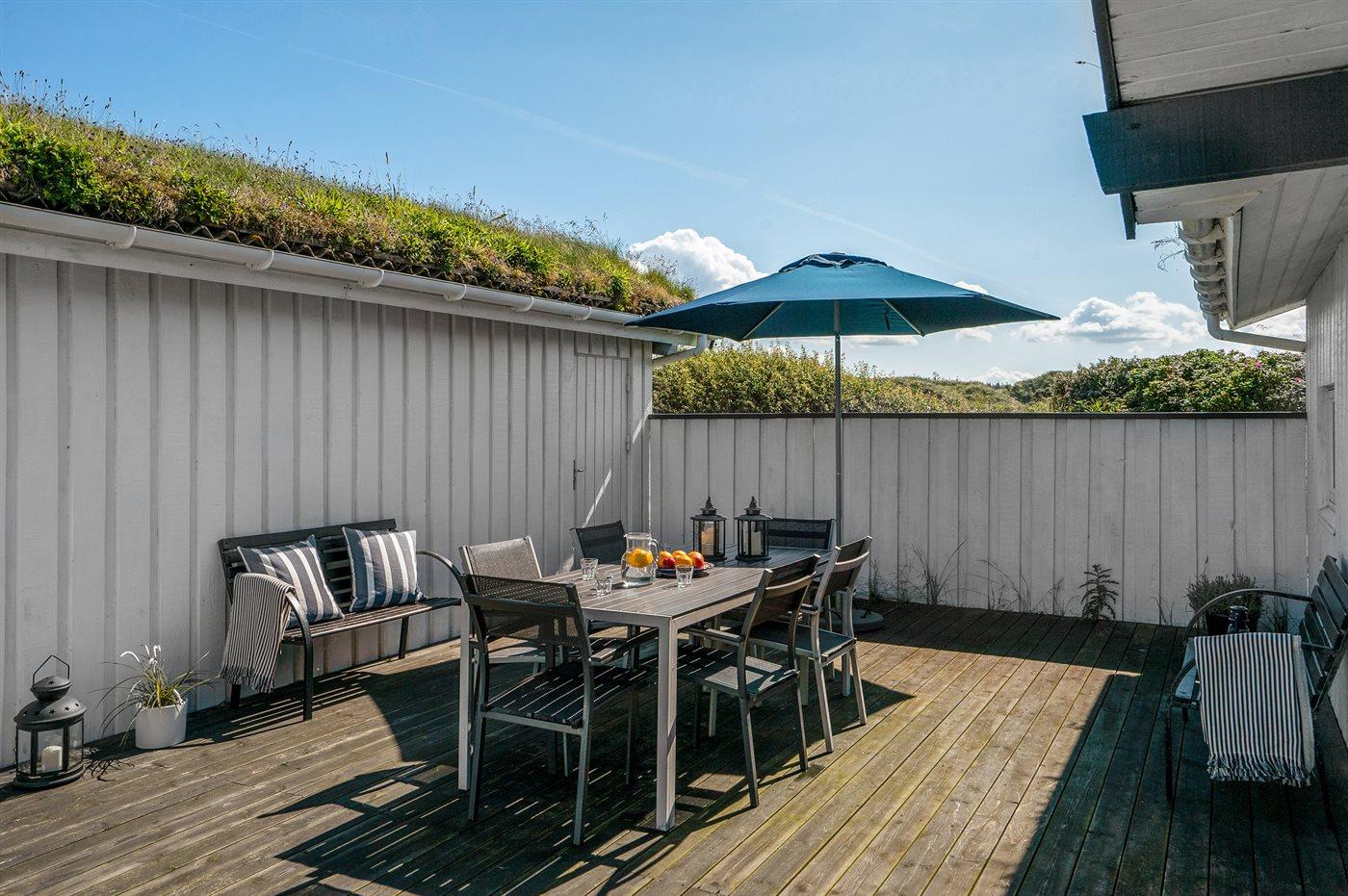 Dette dejlige sommerhus er beliggende lige ved stranden og Vesterhavet med et lille havkig fra grunden. Omkring huset ligger tre solrige og læfyldte terrasser, så det altid er muligt at finde et godt sted at nyde vejret.