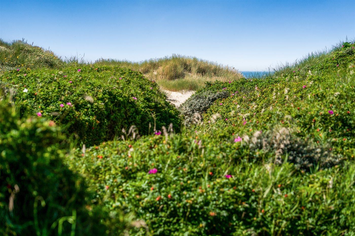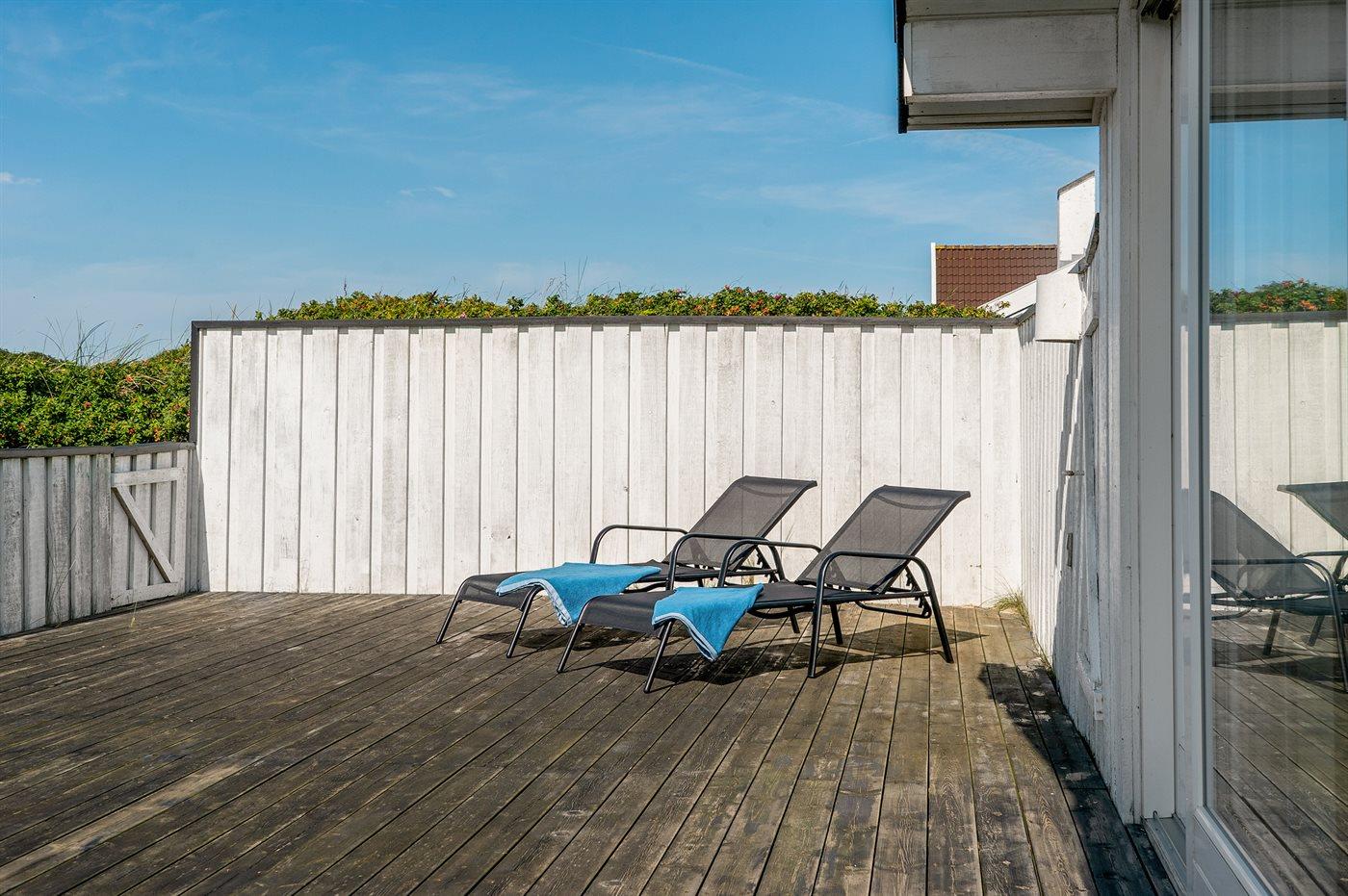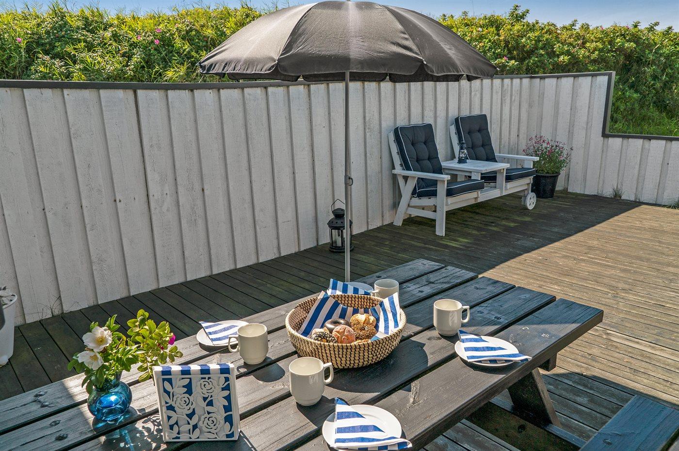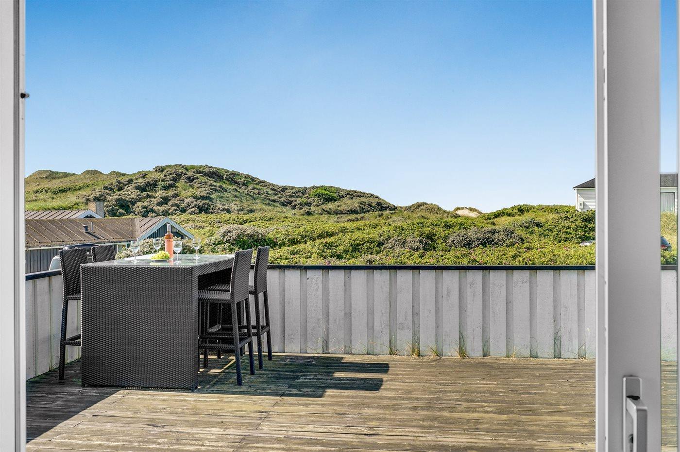 Dette dejlige sommerhus er beliggende lige ved stranden og Vesterhavet med et lille havkig fra grunden. Omkring huset ligger tre solrige og læfyldte terrasser, så det altid er muligt at finde et godt sted at nyde vejret.