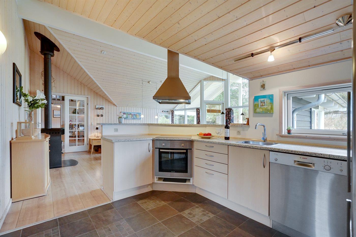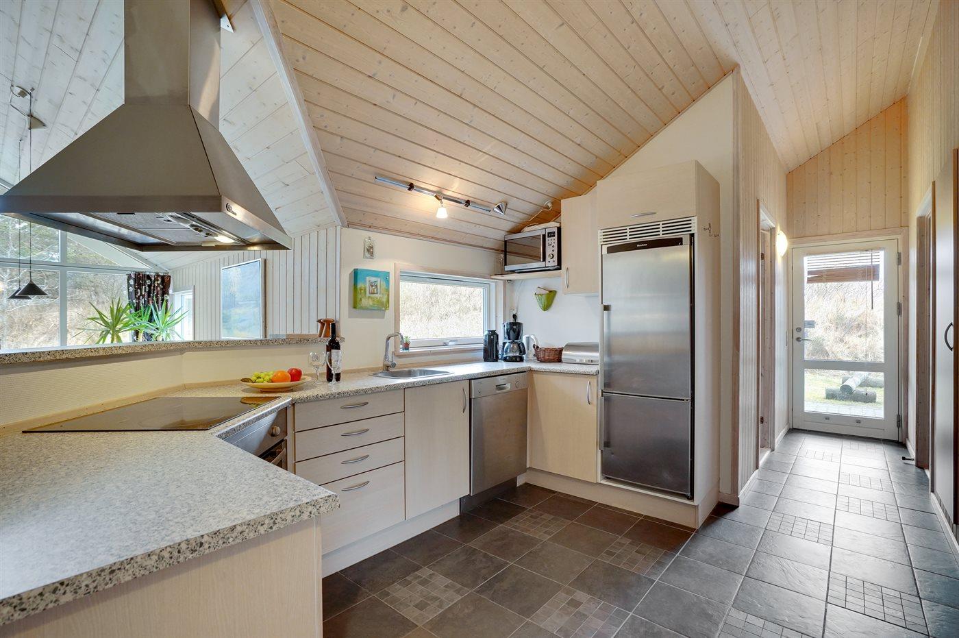 Køkkenet er udstyret med 1 køleskab. Der er 4 keramiske kogeplader, varmluftovn, mikrobølgeovn samt opvaskemaskine.