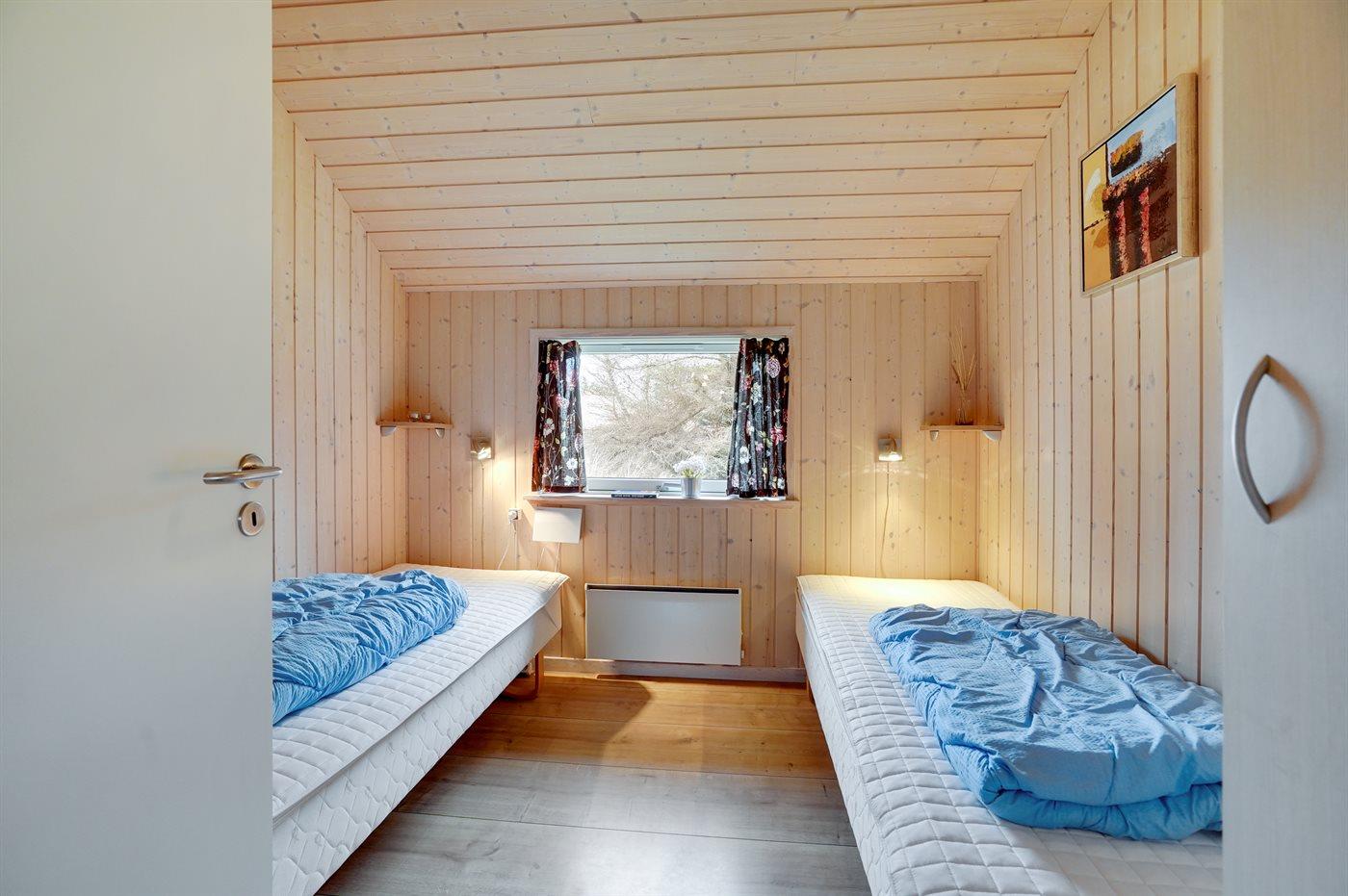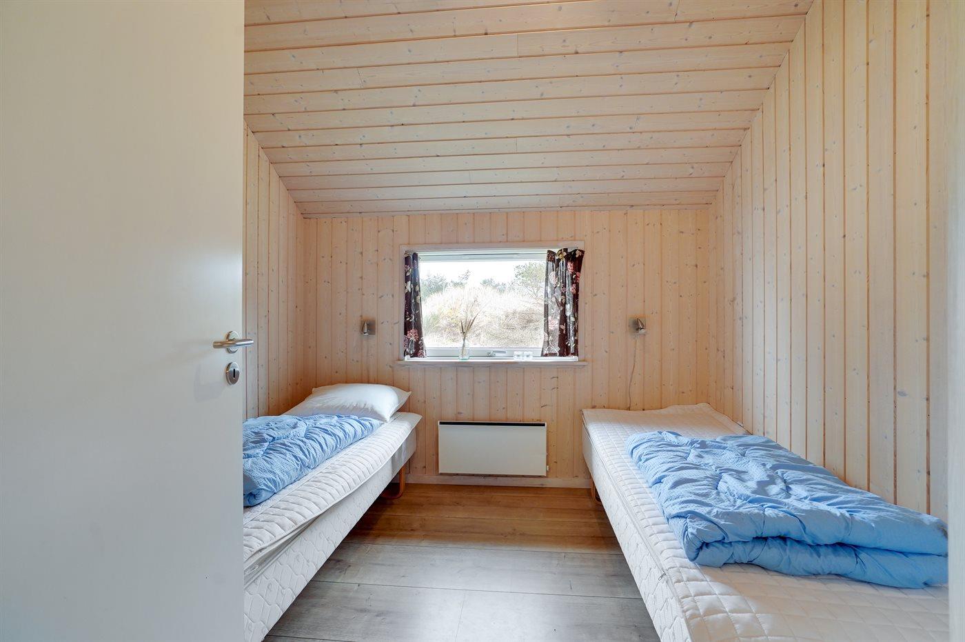 Der er i alt 4 soveværelser. Sovepladserne fordeler sig på: 4 sovepladser i dobbeltsenge. 4 sovepladser i enkeltsenge. 2 sovepladser på madrasser. 2 af disse sovepladser befinder sig på husets hems. Derudover er der 1 stk. barneseng.