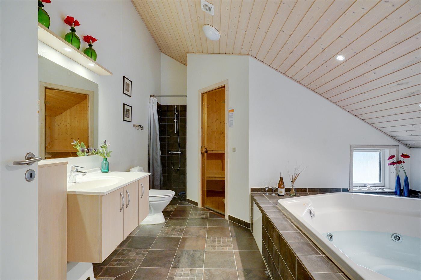 Der er 2 badeværelser med bruseniche og 2 toiletter. Der er gulvvarme på 2 badeværelser. I saunaen er der mulighed for afslapning.
