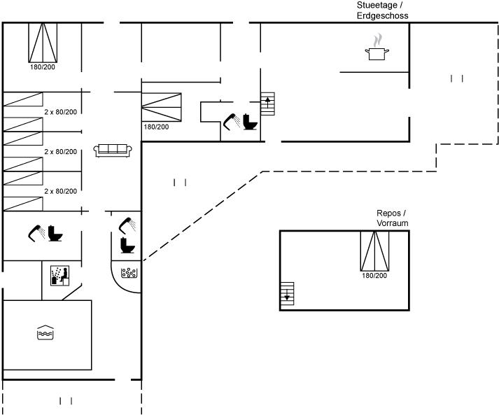 Stort sommerhus beliggende på en delvis lukket grund med god plads til udendørs aktiviteter ved hovedvejen der fører direkte til stranden og Vesterhavet. På åben repos på 1. sal befinder 4 af sovepladserne sig. Desuden hems i hver 2 soveværelser med enkeltsenge, hvor 1 soveplads på madras er placeret.