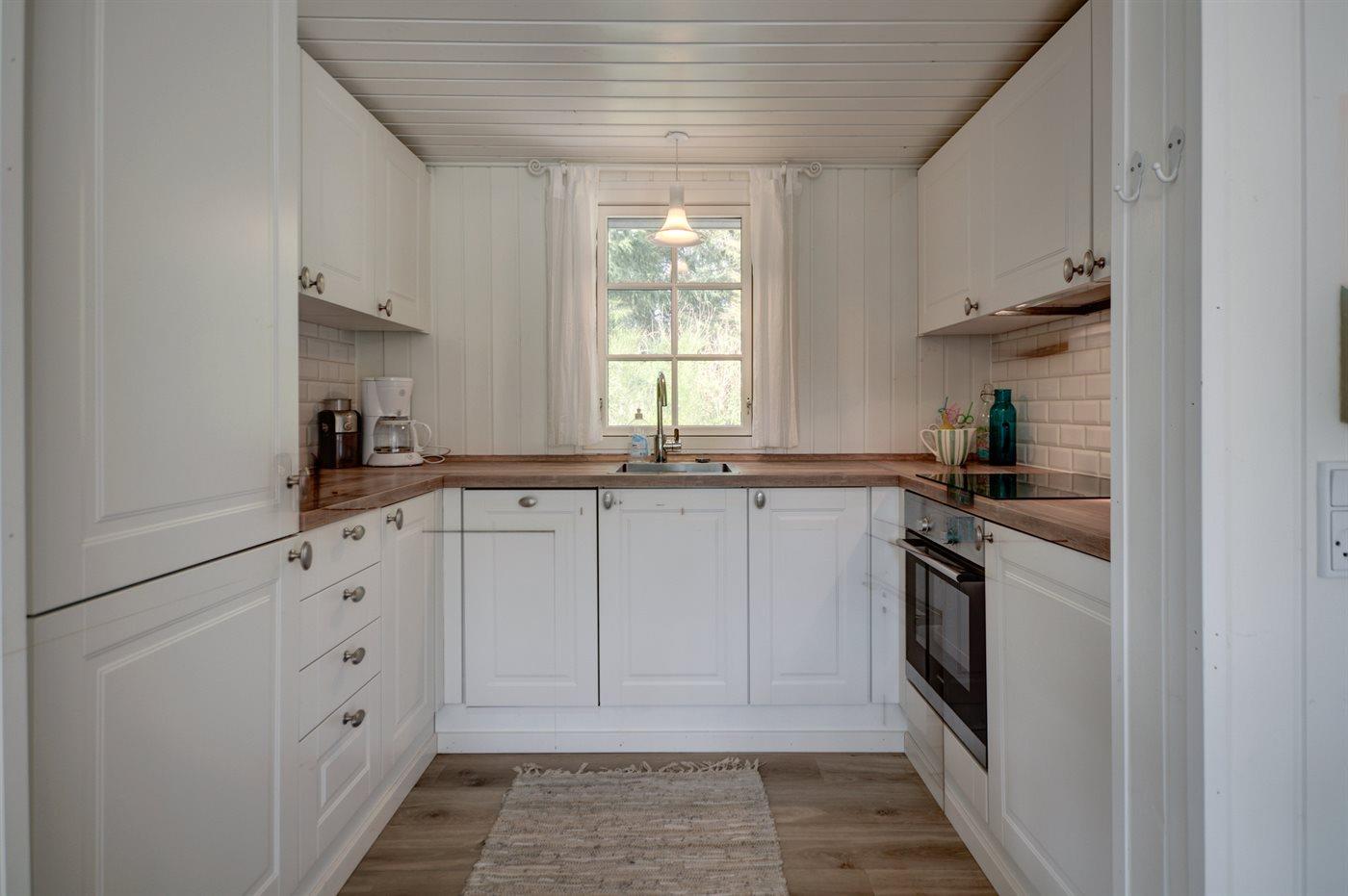 Køkkenet er udstyret med 1 køleskab. Der er 4 keramiske kogeplader, varmluftovn samt opvaskemaskine.