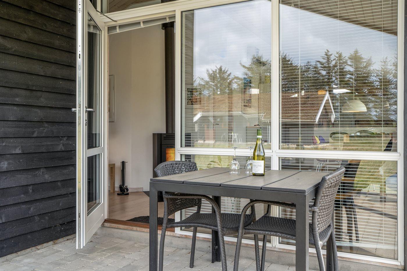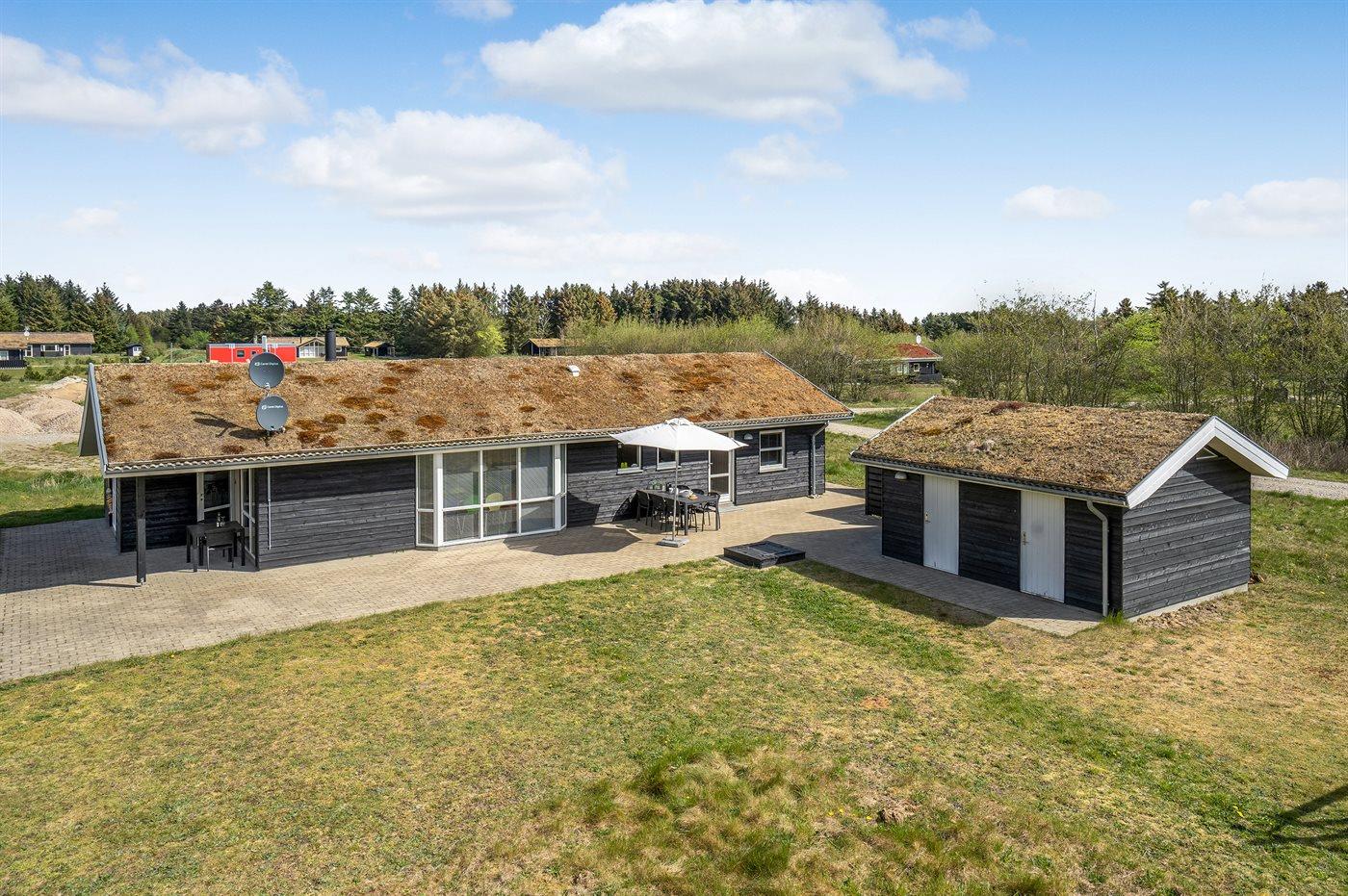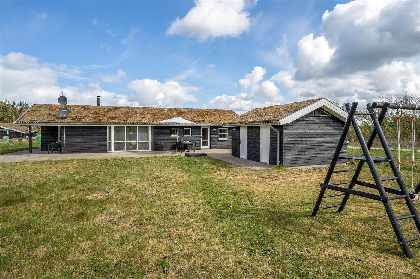 Ferieboligen er beliggende på en 2600 m² stor naturgrund. Der er 1500 m til havet. Nærmeste forretning er beliggende i en afstand af 2500 m. Til ferieboligen hører 100 m² terrasseareal. Desuden er der 8 m² overdækket terrasse. Der er redskabsrum. Gynge. Sandkasse. Shelter. Udendørs bruser. Grill til rådighed. Der er installeret stik til opladning af elbil. Parkering ved ferieboligen.