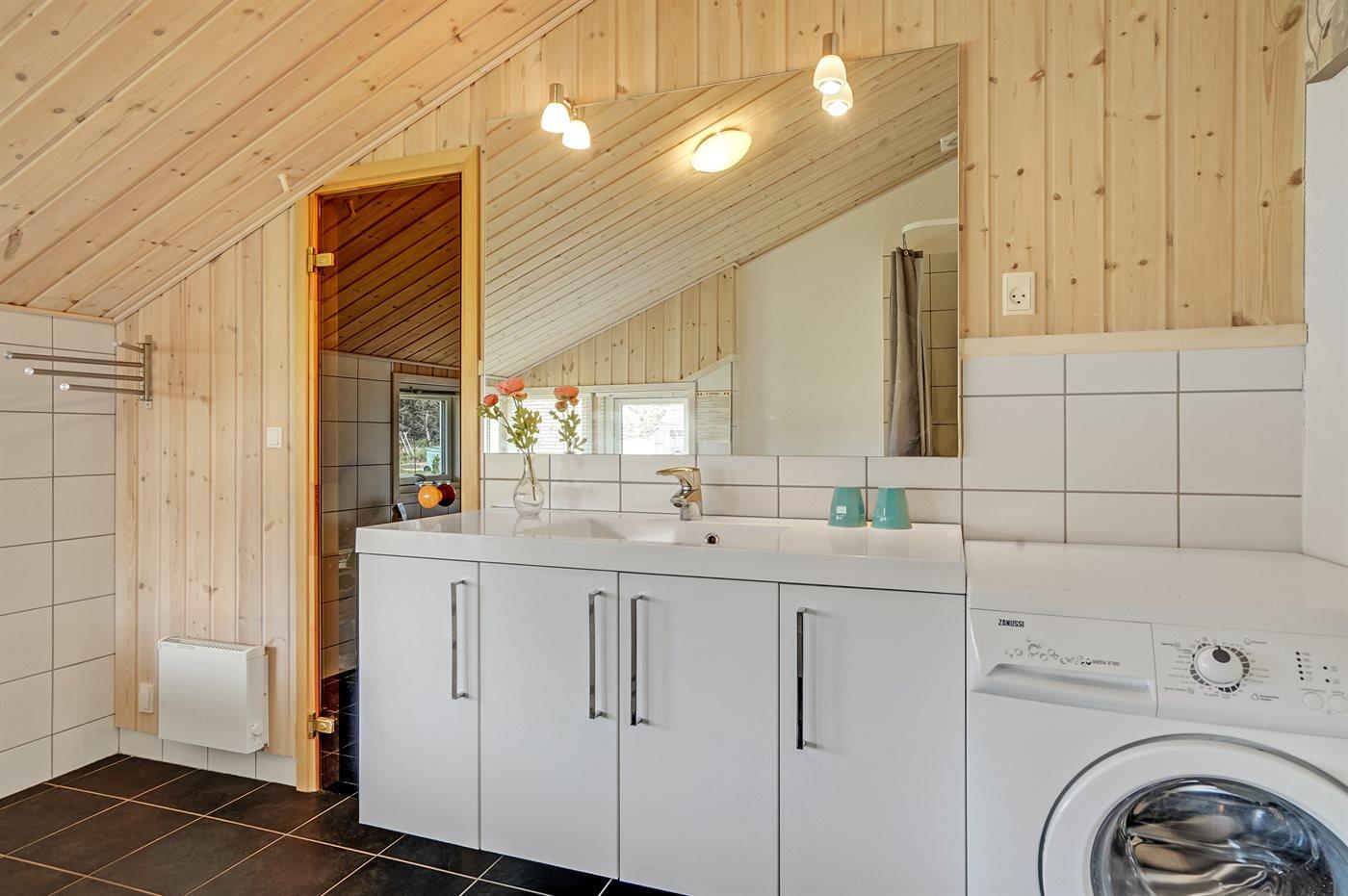 Der er 2 badeværelser med bruseniche og 2 toiletter. Der er gulvvarme på 2 badeværelser. I saunaen er der mulighed for afslapning.